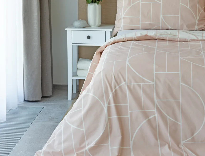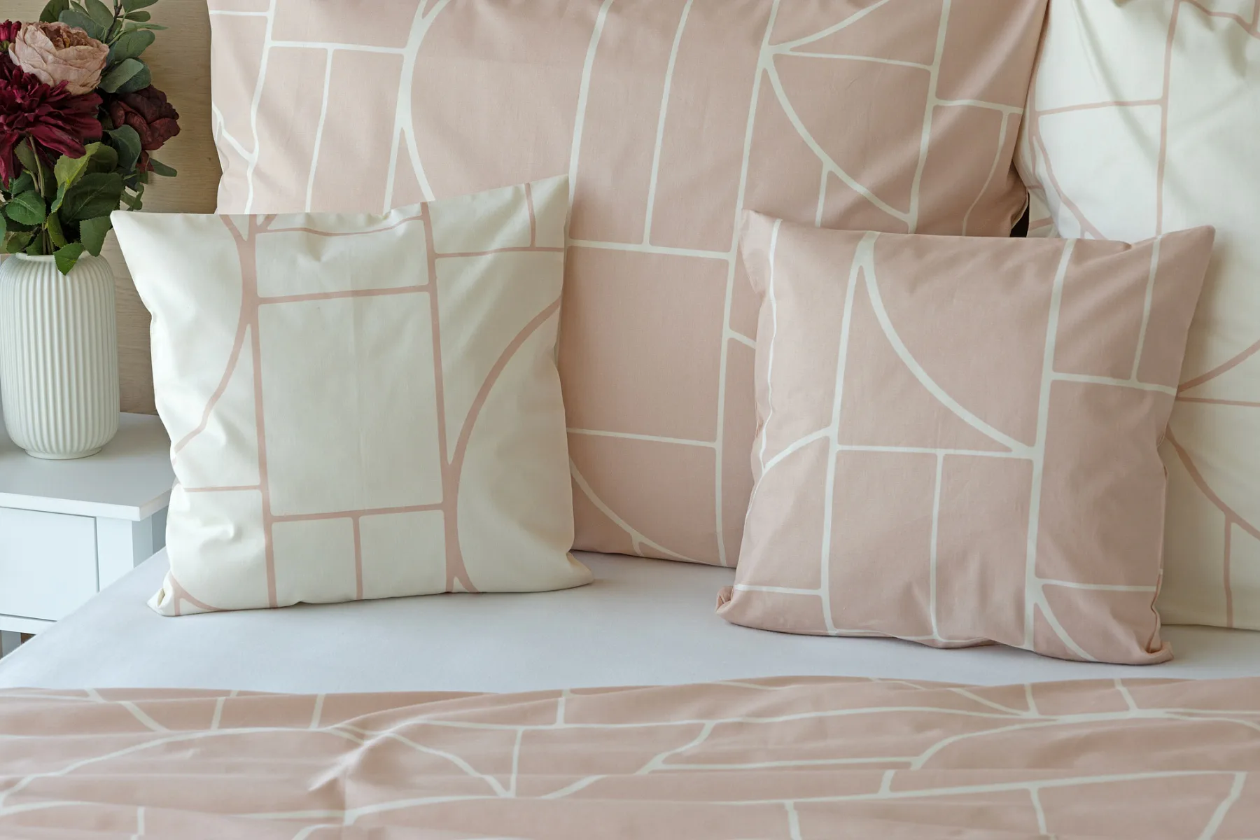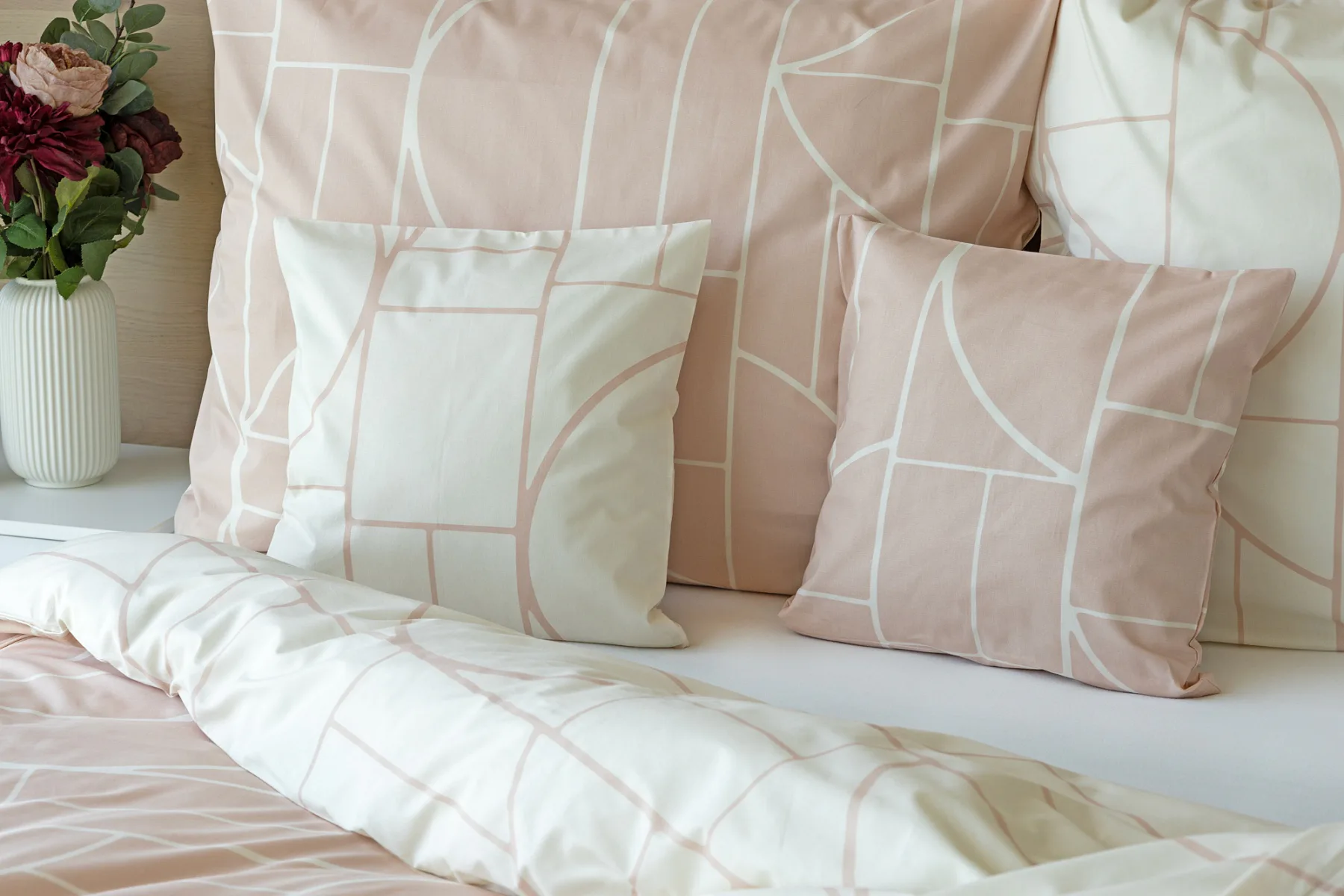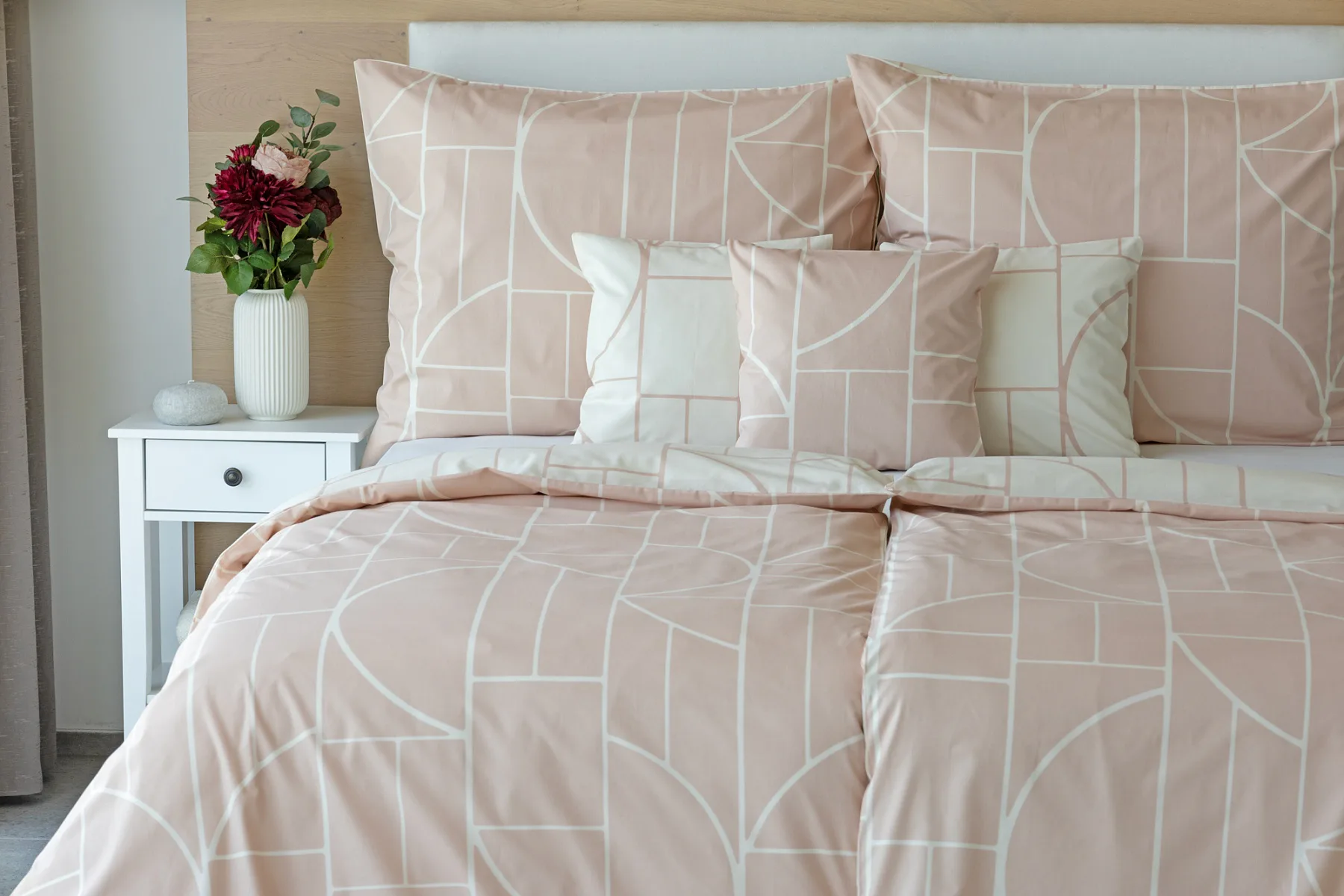 Povlak na polštář i na přikrývku je z každé strany jiný, na jedné straně dominuje pudrově růžový podklad, z druhé strany se geometrický vzor vyjímá na krémovém podkladu. Povlečení je opatřeno komfortním zipovým uzávěrem. 100% bavlna