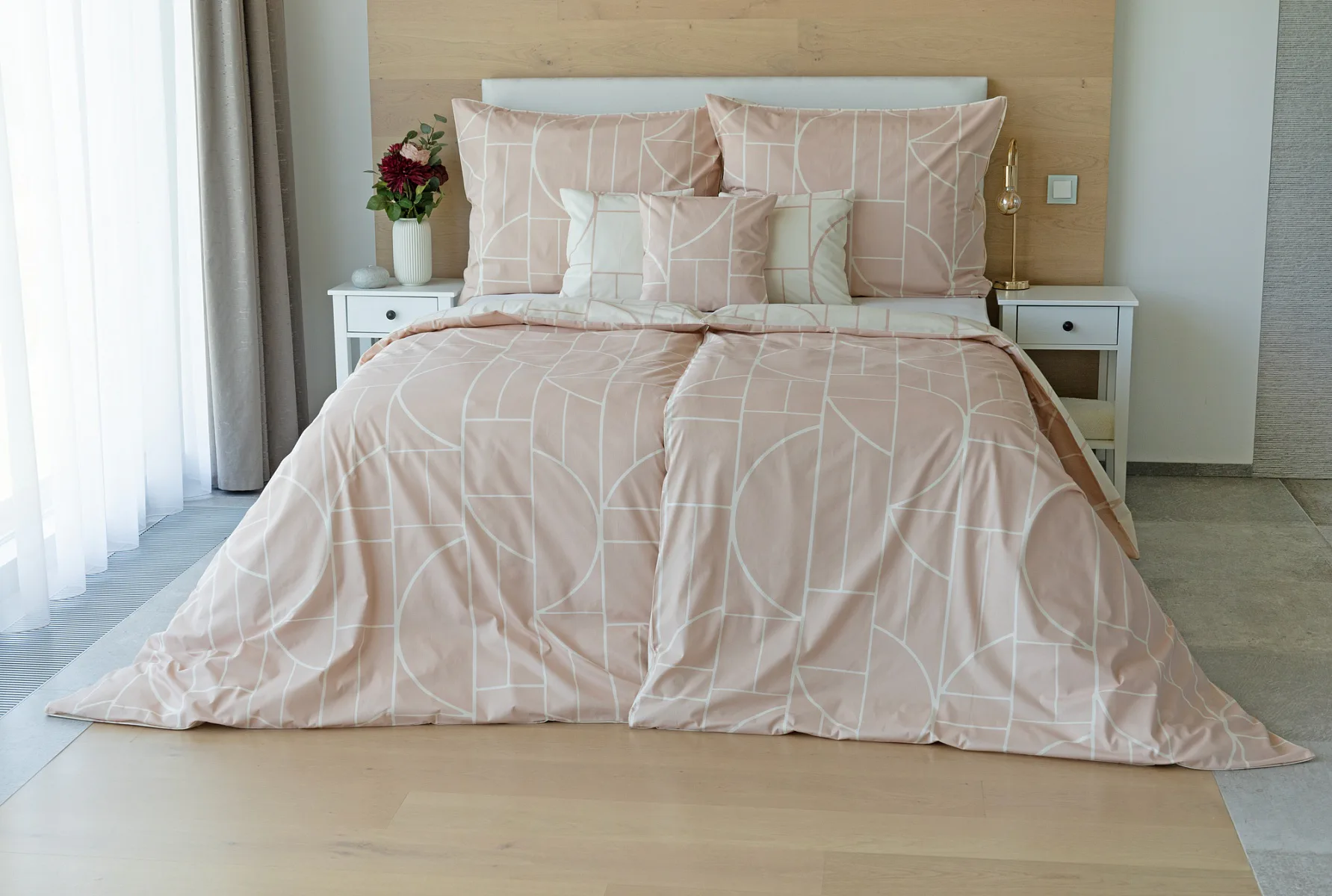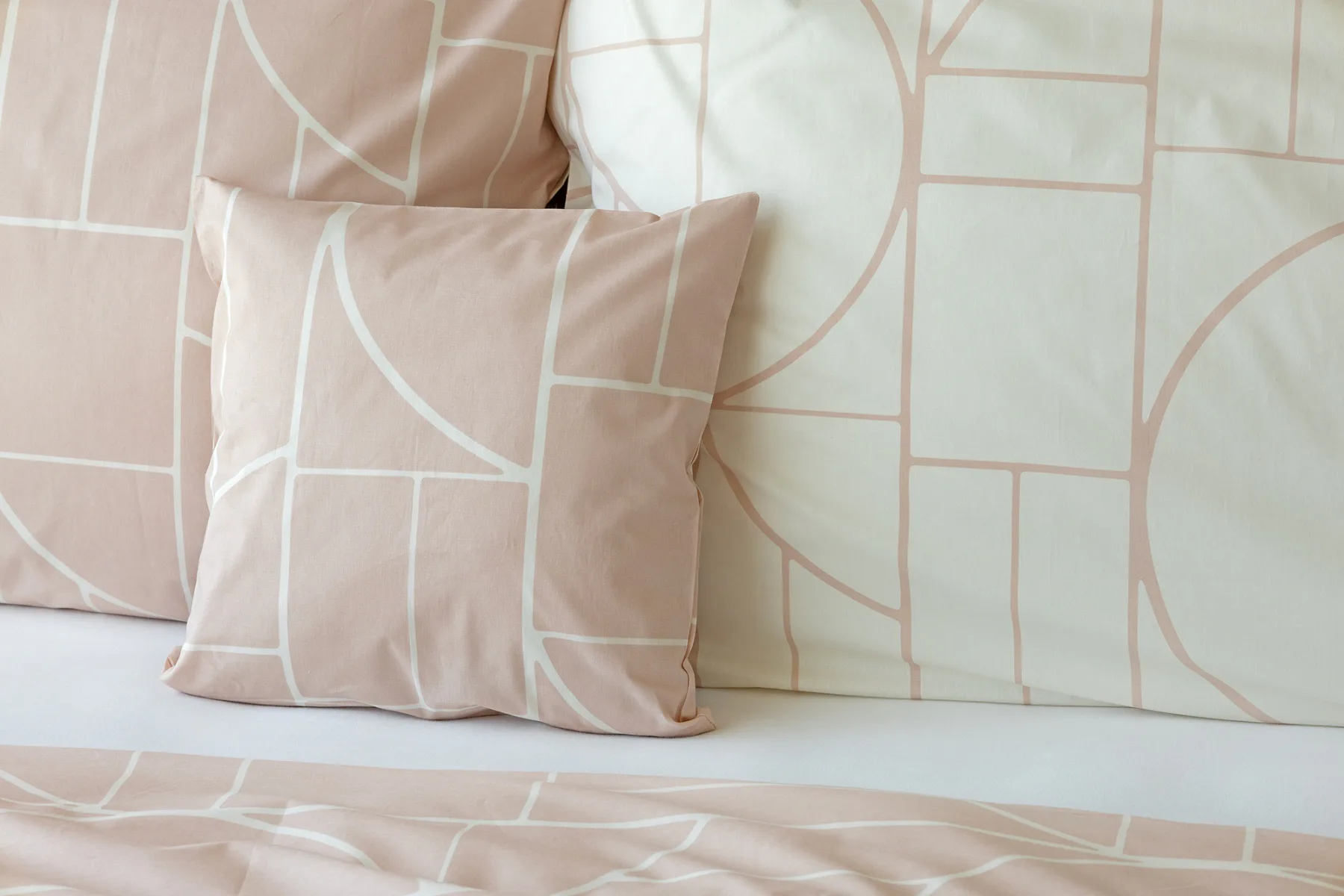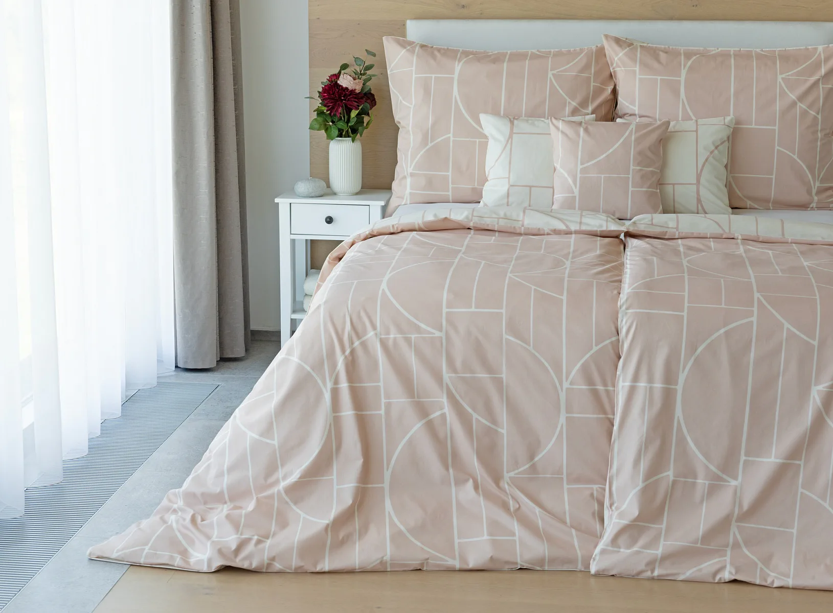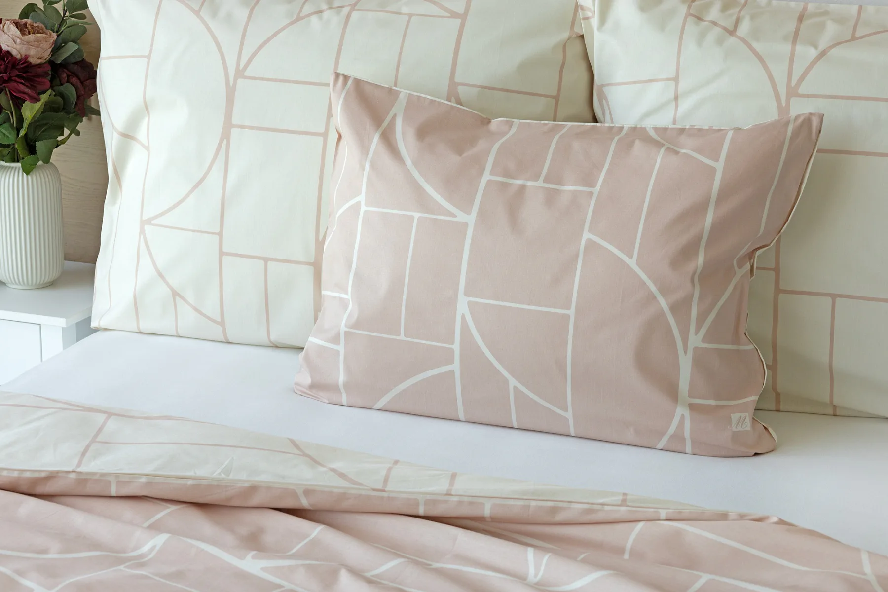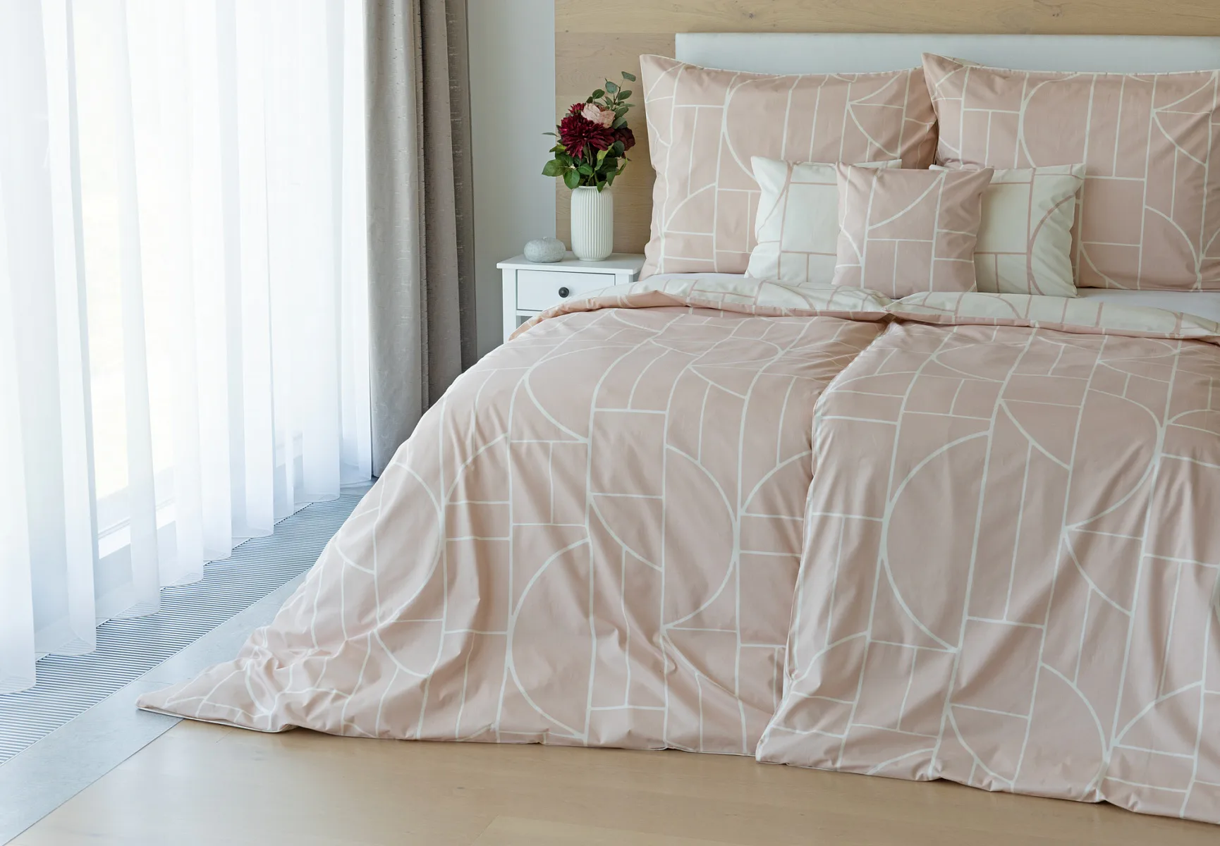 Povlak na polštář i na přikrývku je z každé strany jiný, na jedné straně dominuje pudrově růžový podklad, z druhé strany se geometrický vzor vyjímá na krémovém podkladu. Povlečení je opatřeno komfortním zipovým uzávěrem. 100% bavlna
