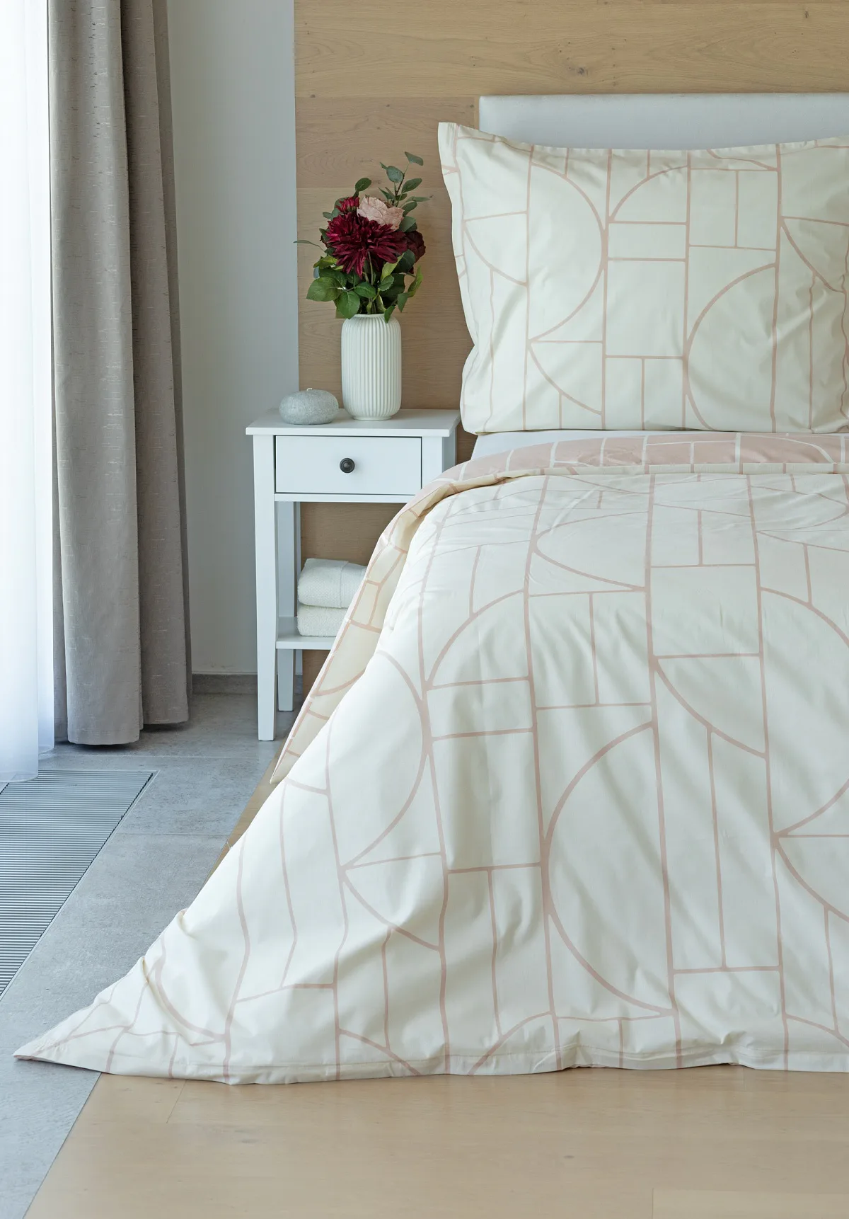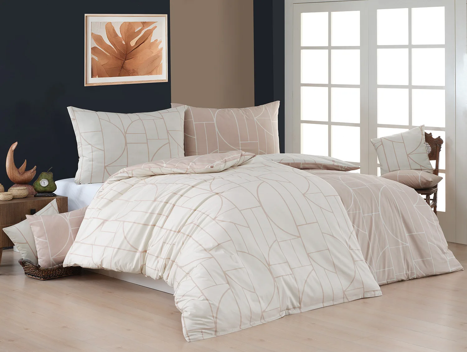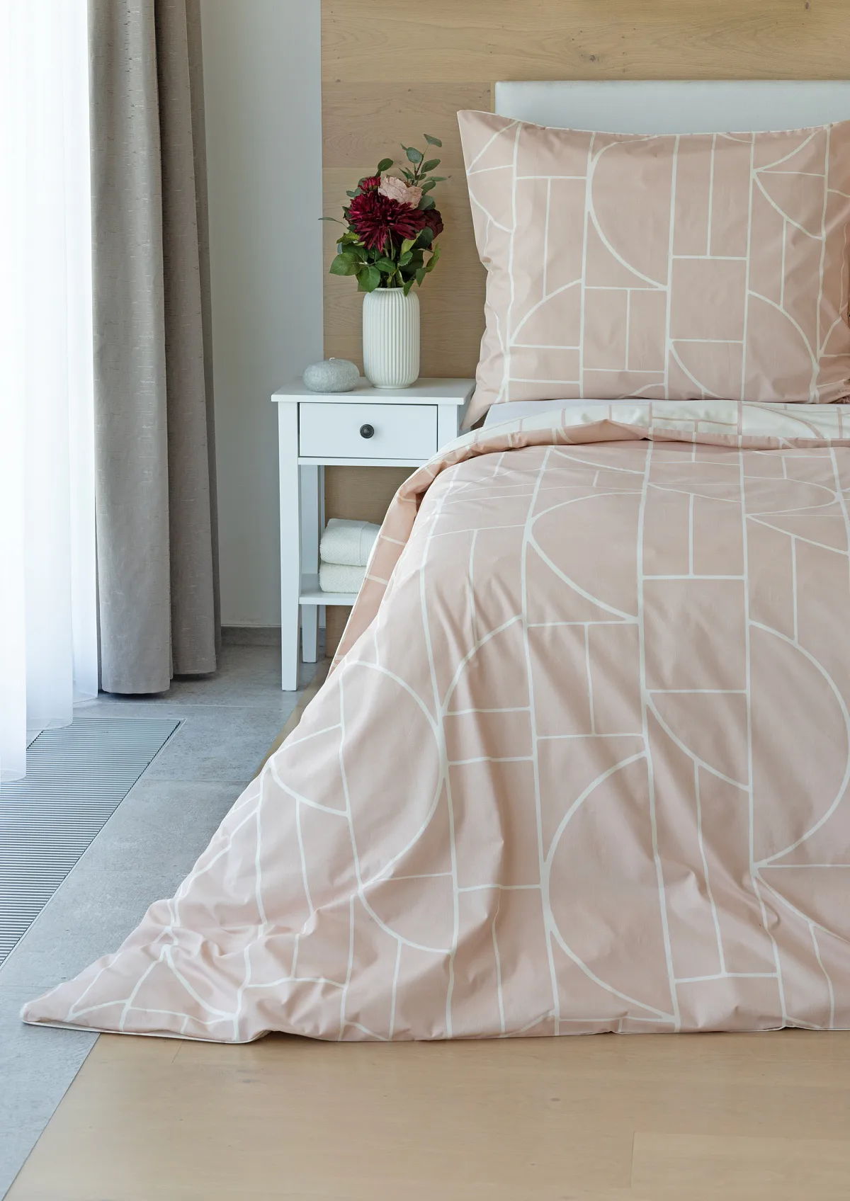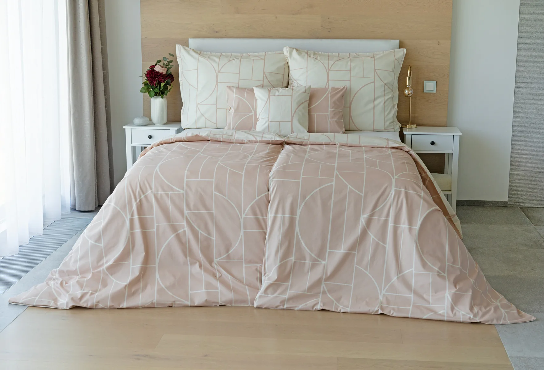 Povlak na polštář i na přikrývku je z každé strany jiný, na jedné straně dominuje pudrově růžový podklad, z druhé strany se geometrický vzor vyjímá na krémovém podkladu. Povlečení je opatřeno komfortním zipovým uzávěrem. 100% bavlna