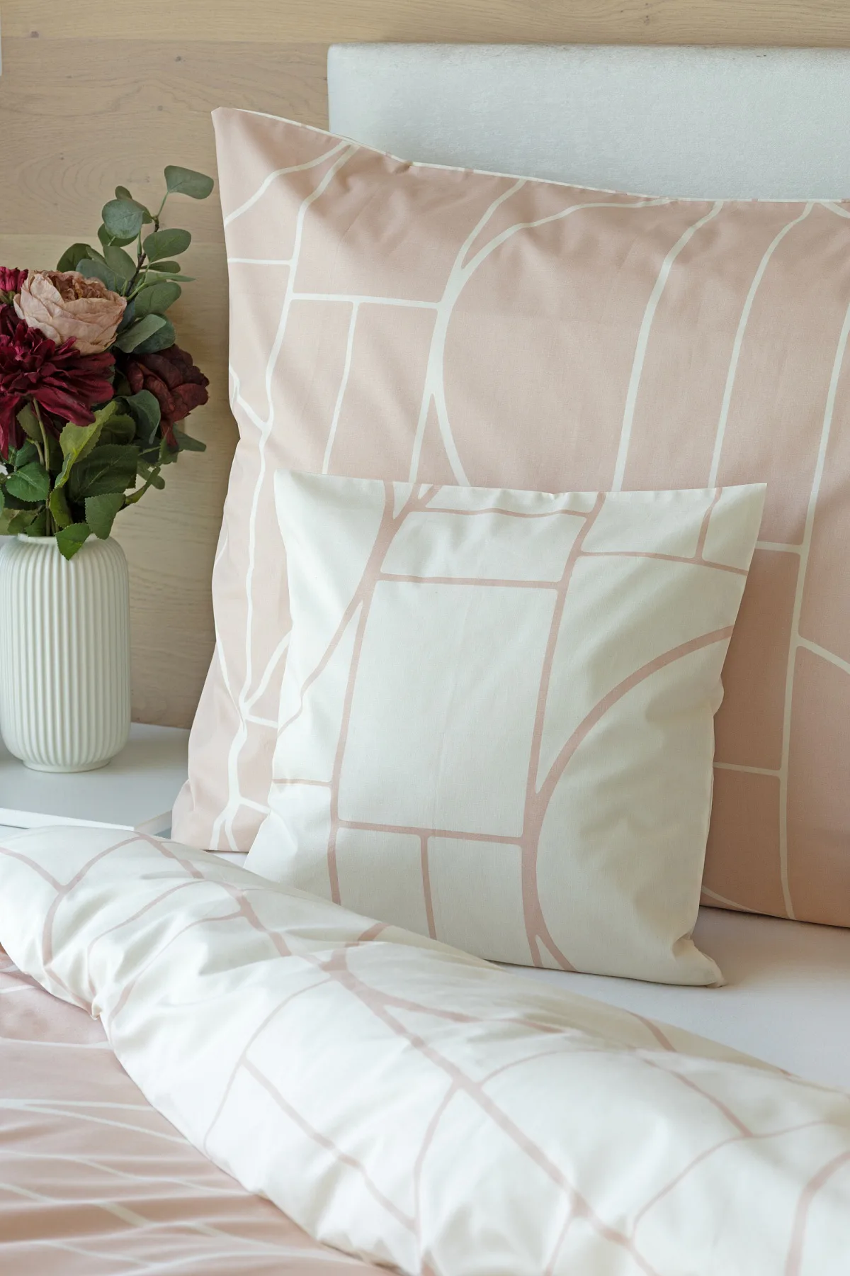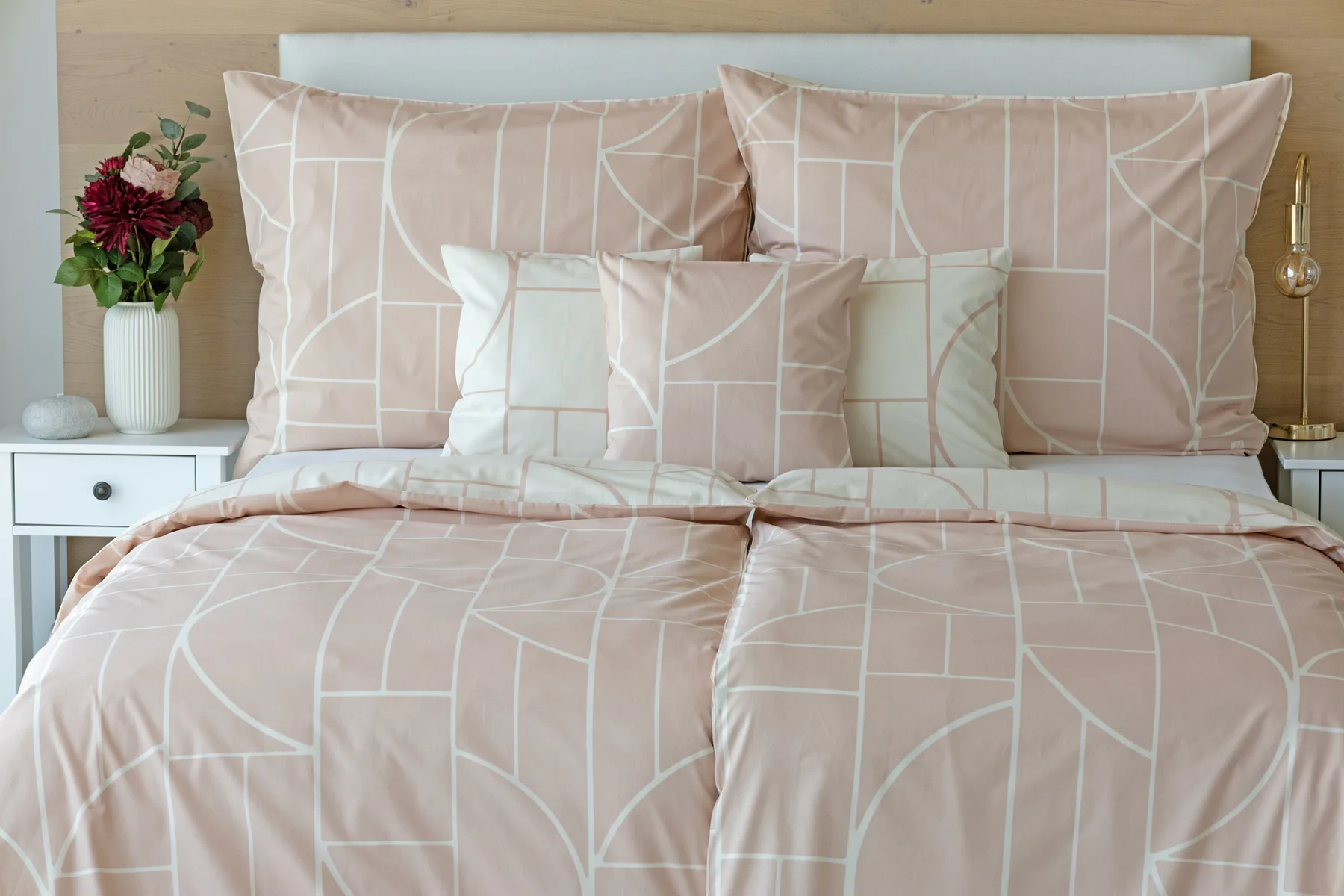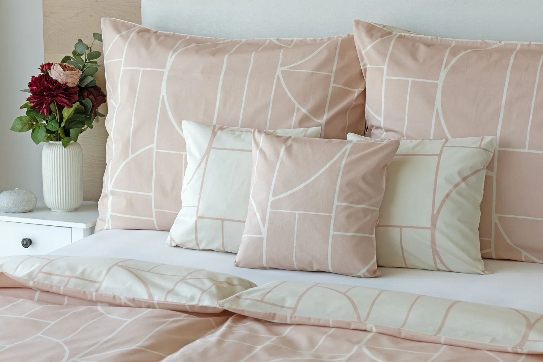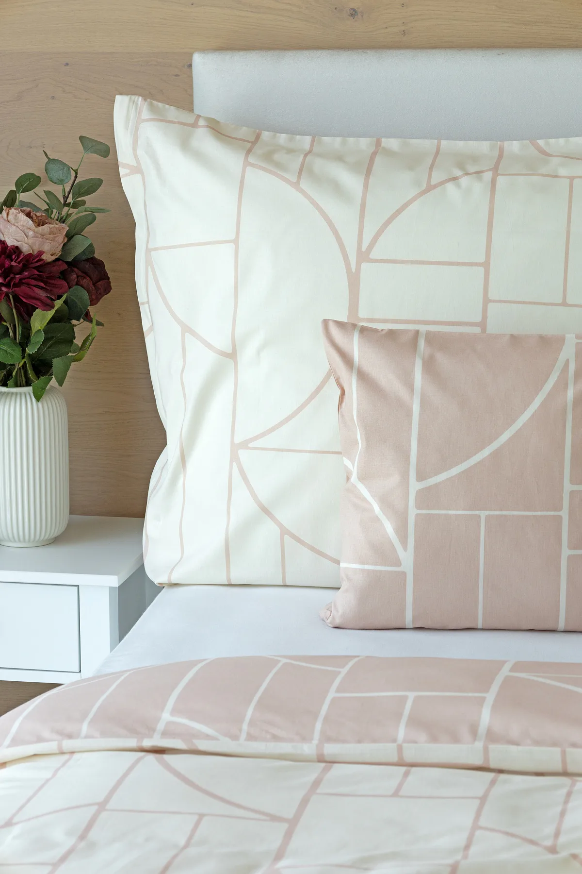 Dopřejte své ložnici nádech střídmé elegance s něžným bavlněným povlečením Paola. V jemné geometrii se snoubí pastelové tóny světle pudrové a krémové barvy. Povlečení Paola vnese do interiéru harmonii a díky oblíbenému oboustrannému provedení si užijete hravé stlaní.