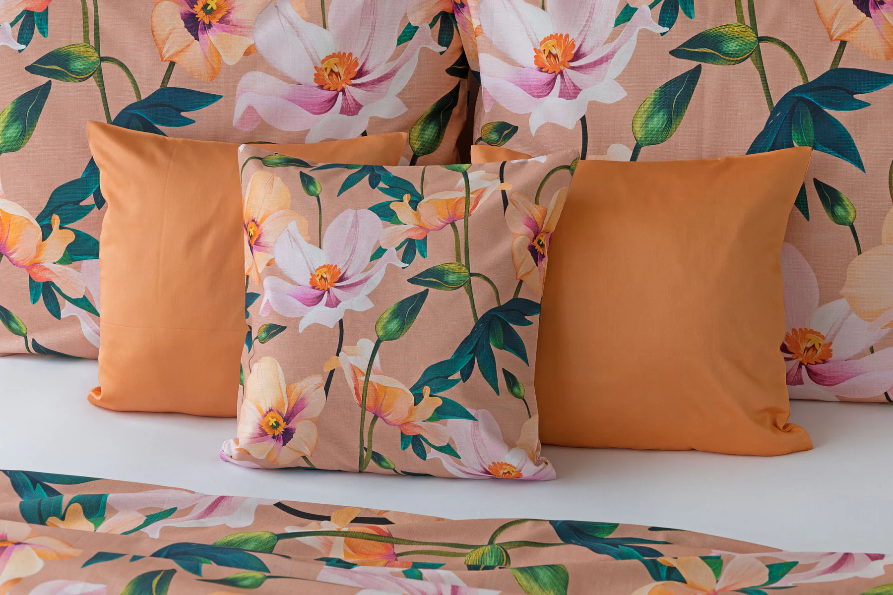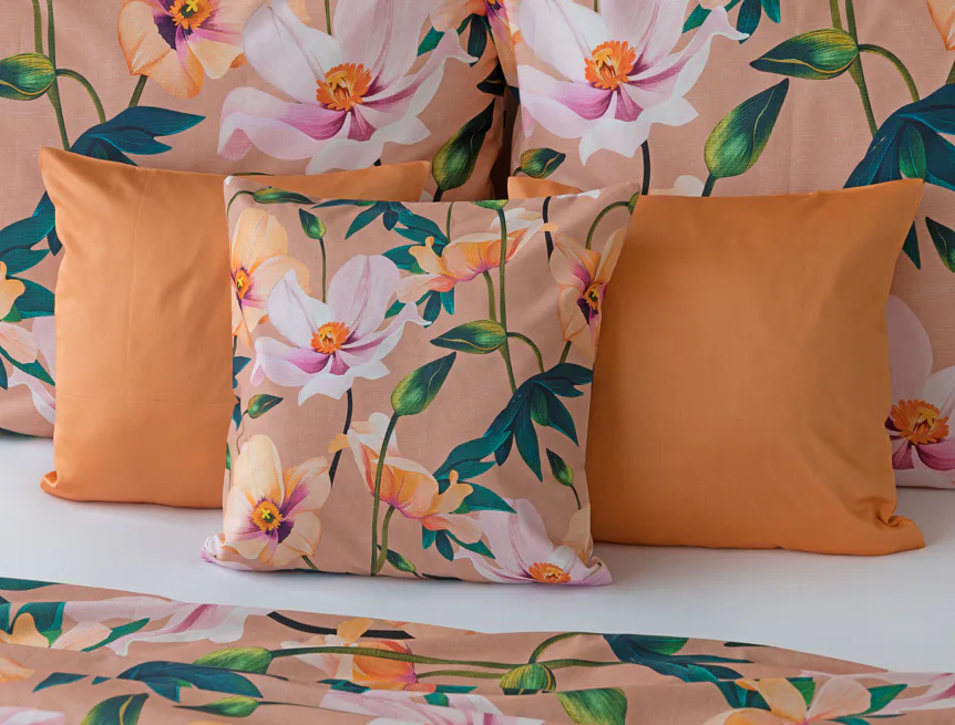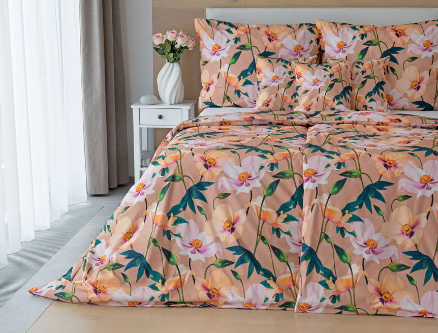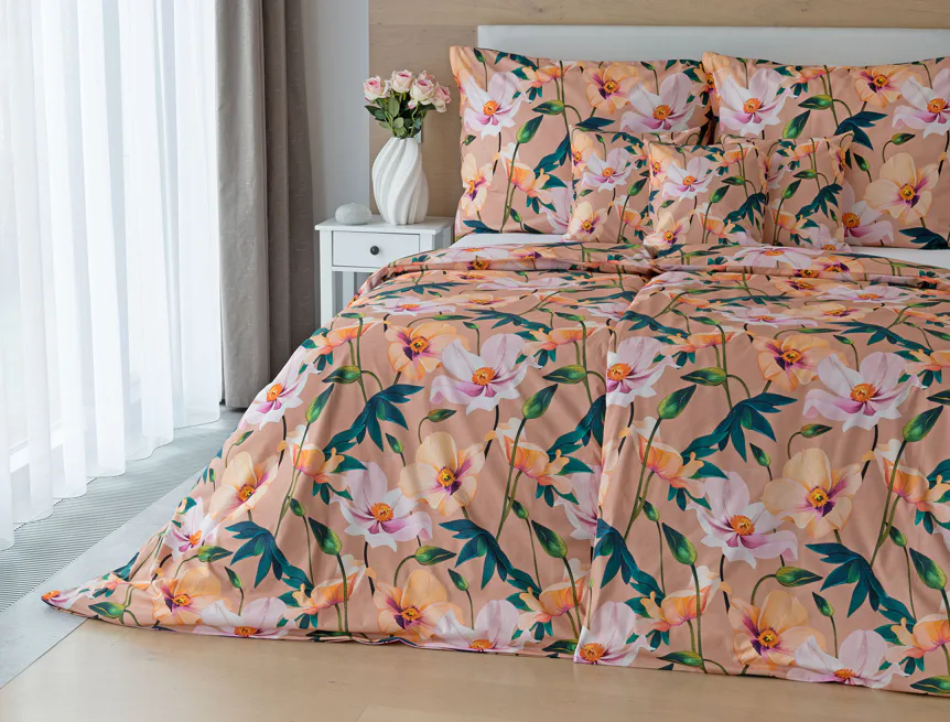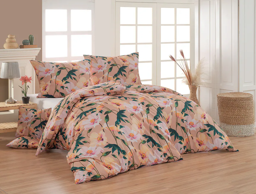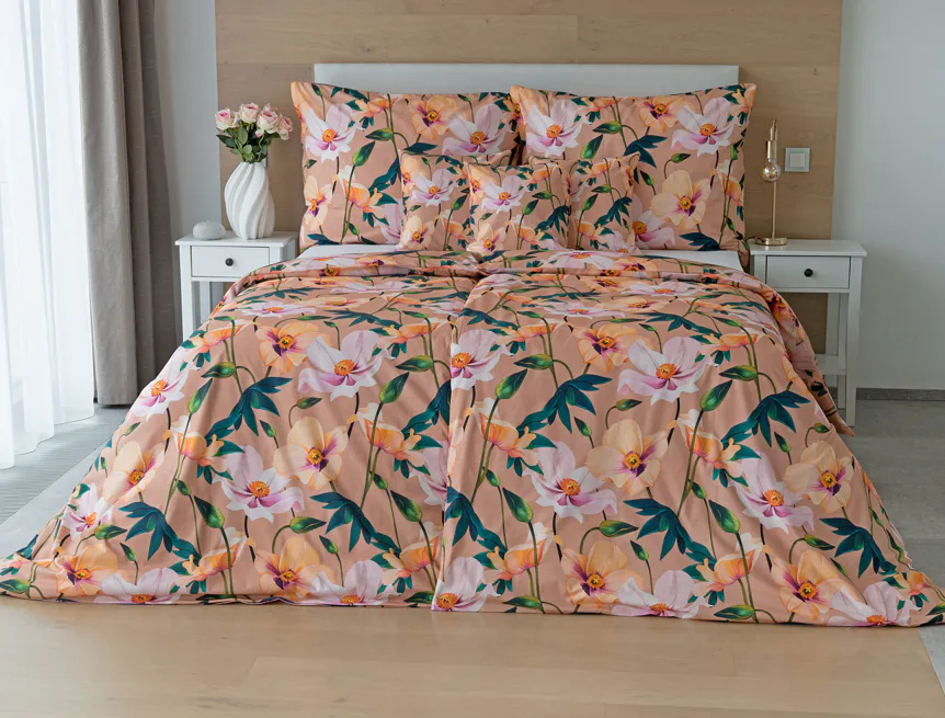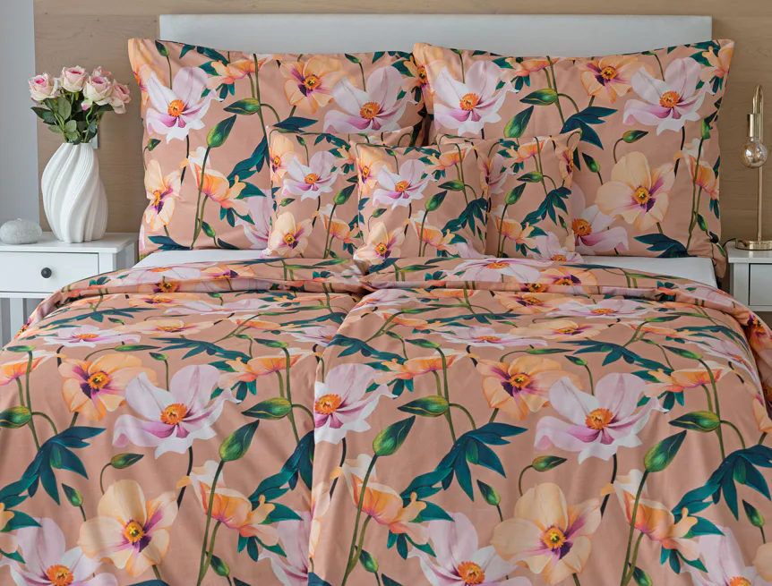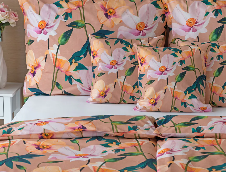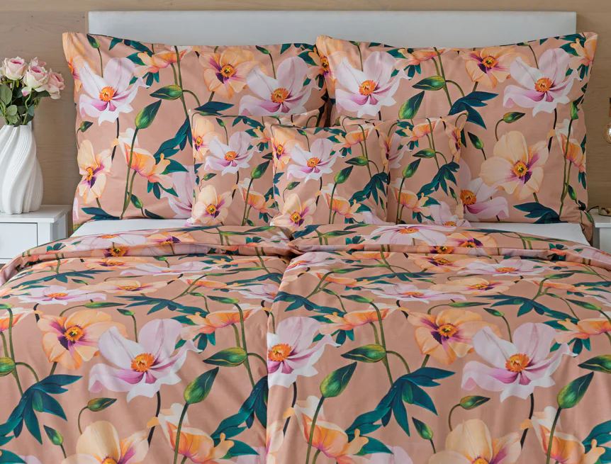 Květinové ložní povlečení Poppy vnese do vaší ložnice nádech svěžesti. Decentní barevná paleta mákových květů v kombinaci s výraznými zelenými listy dodává povlečení atraktivní vzhled, který oživí a zútulní každý interiér. Podkladová barva nese jemné tóny pudrové, meruňkové a korálové, doplněné jemnou tečkovanou strukturou. Dopřejte si každou noc dotek přírody a probouzejte se obklopeni květy.