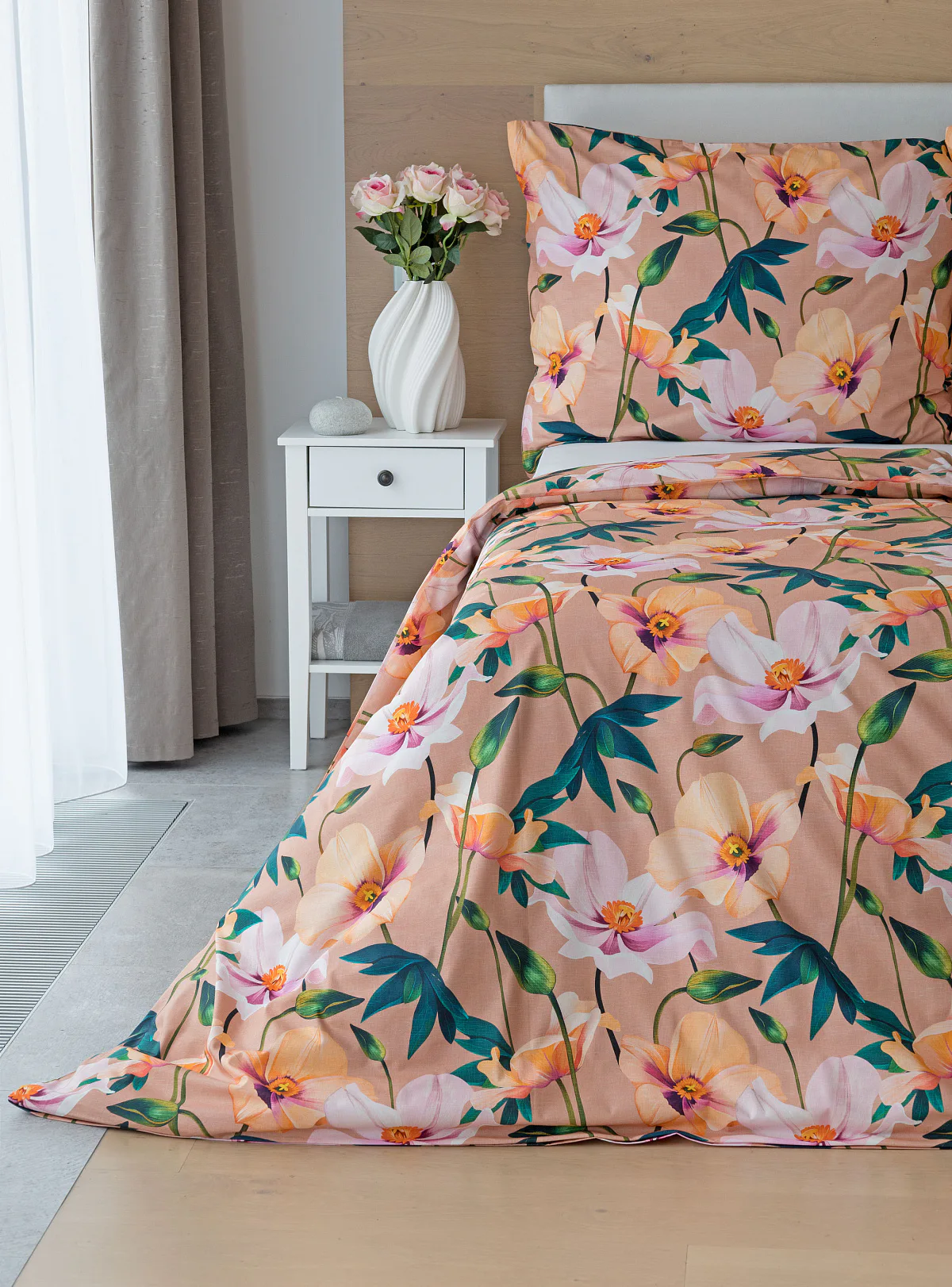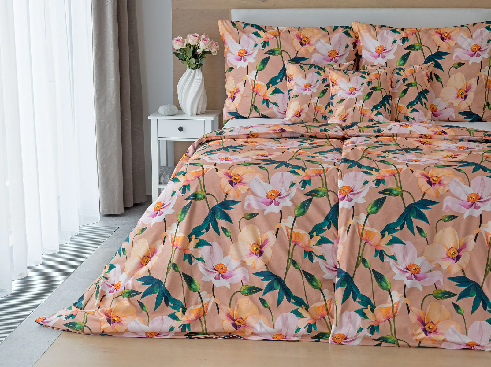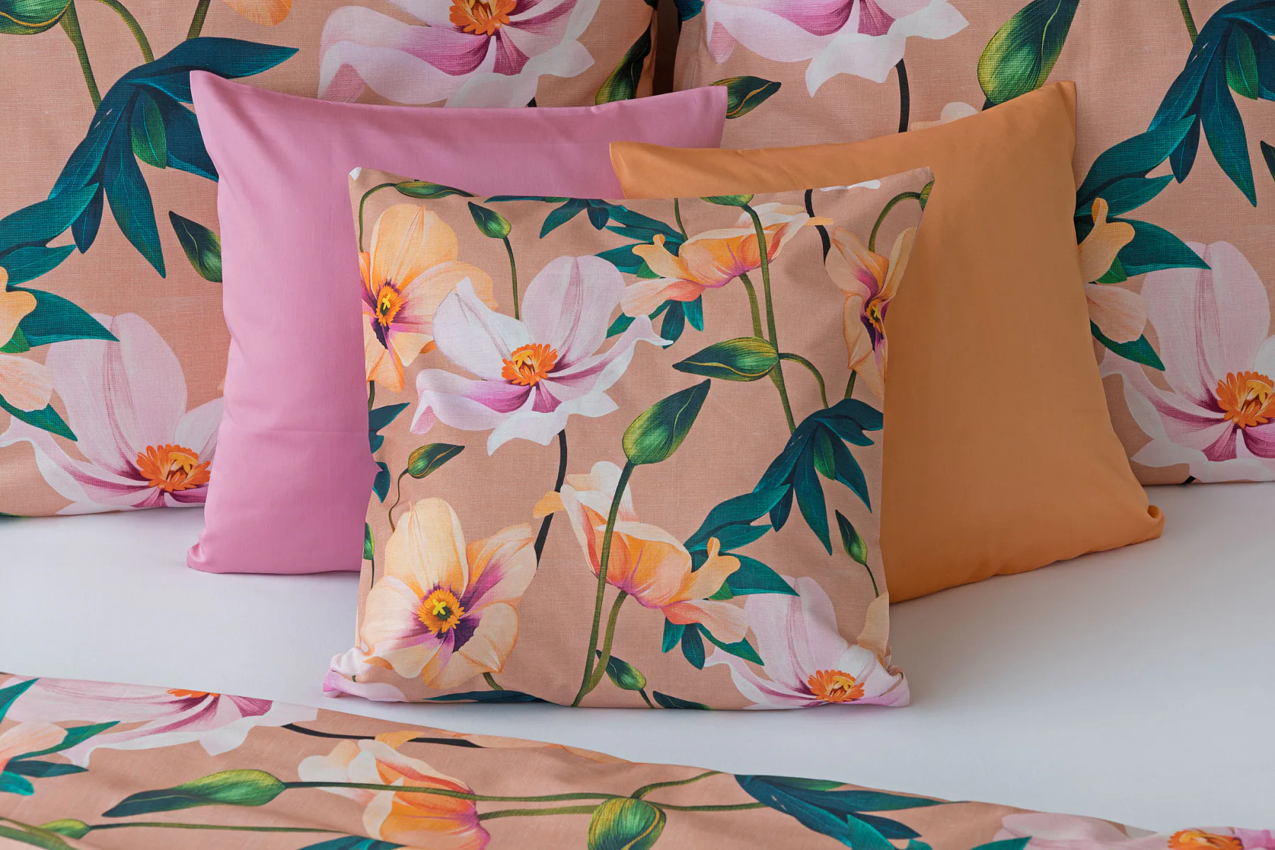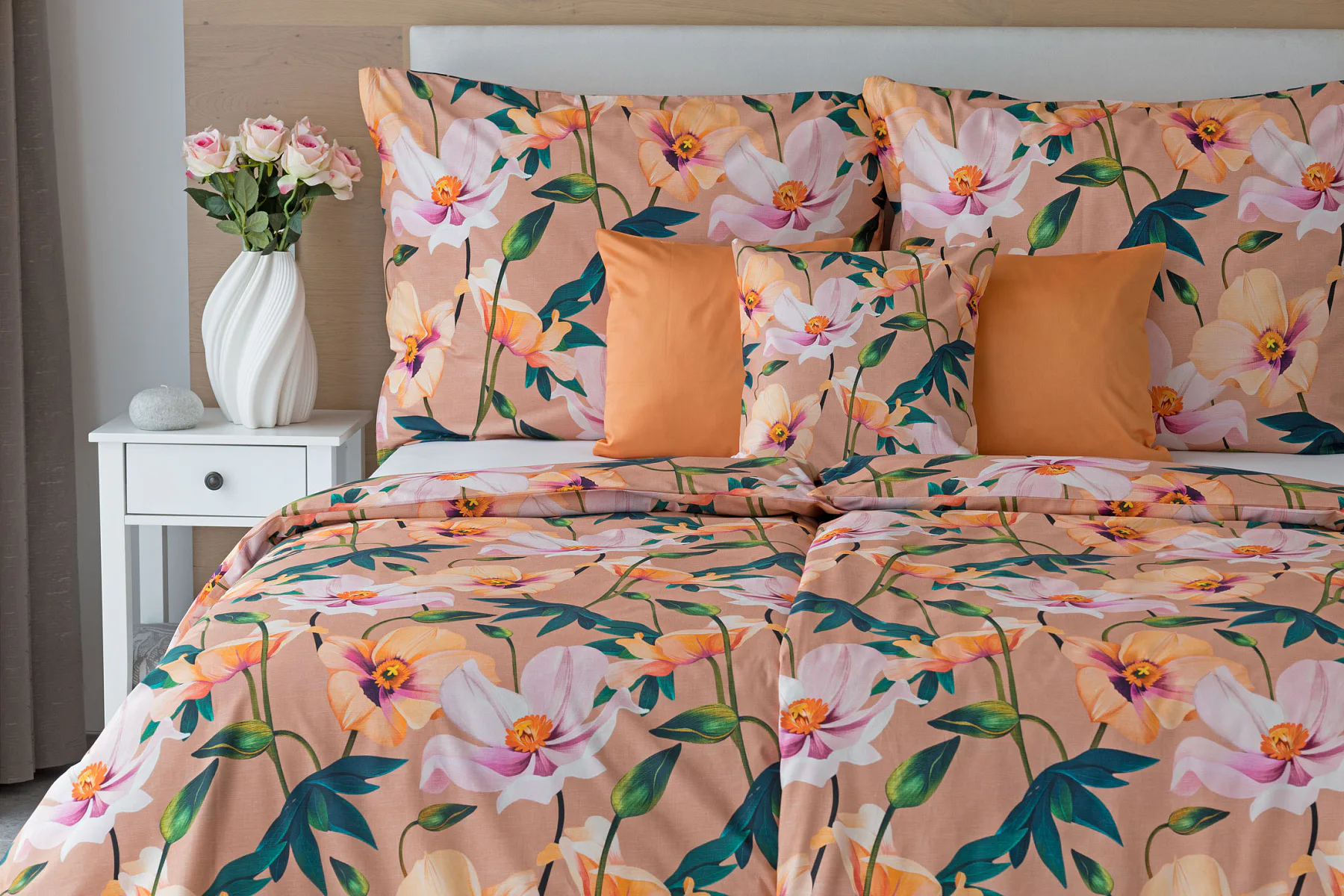 Květinové ložní povlečení Poppy vnese do vaší ložnice nádech svěžesti. Decentní barevná paleta mákových květů v kombinaci s výraznými zelenými listy dodává povlečení atraktivní vzhled, který oživí a zútulní každý interiér. Podkladová barva nese jemné tóny pudrové, meruňkové a korálové, doplněné jemnou tečkovanou strukturou. Dopřejte si každou noc dotek přírody a probouzejte se obklopeni květy.