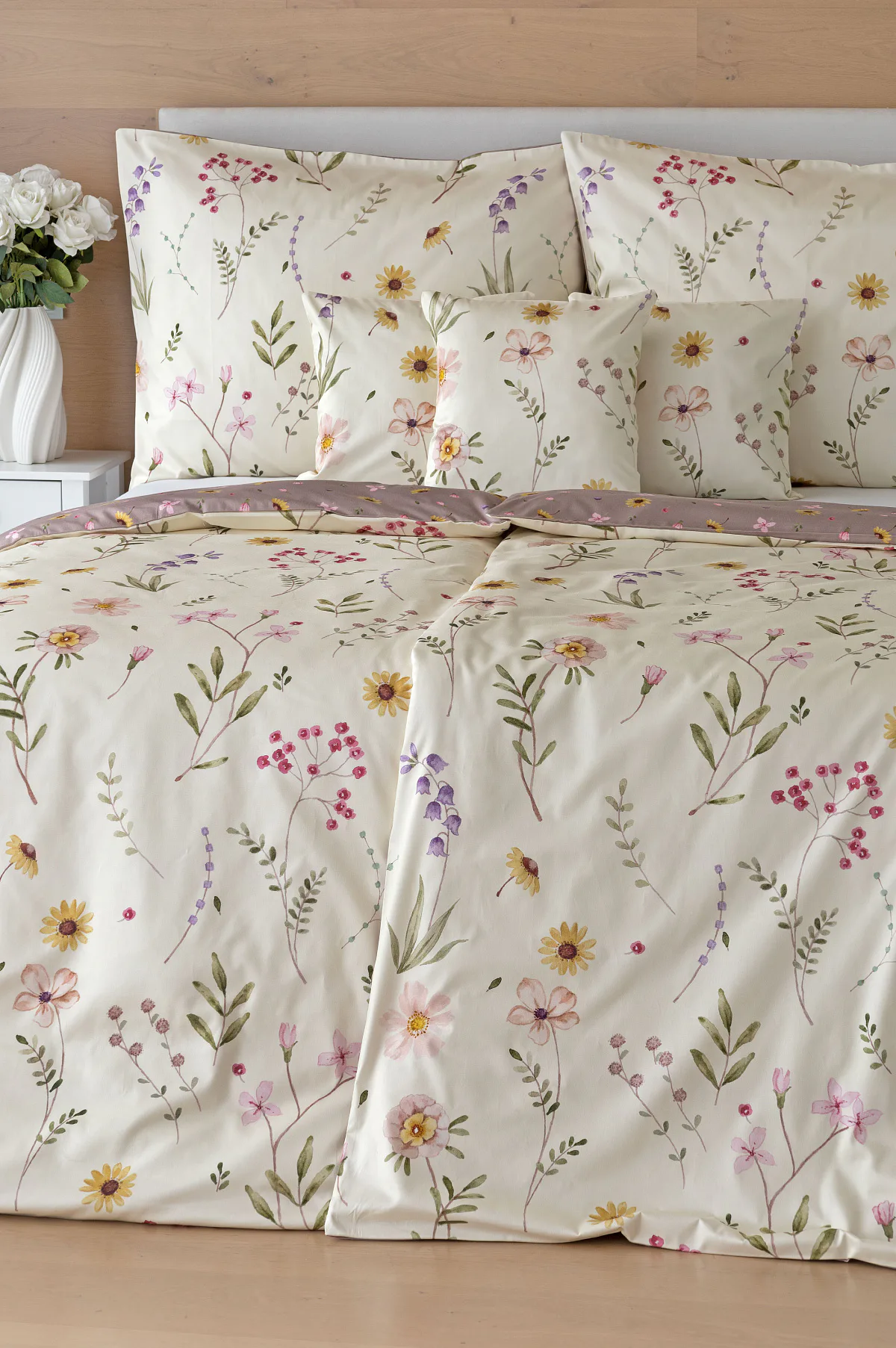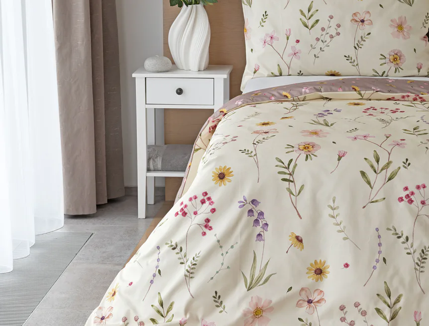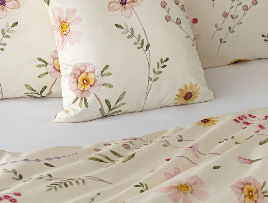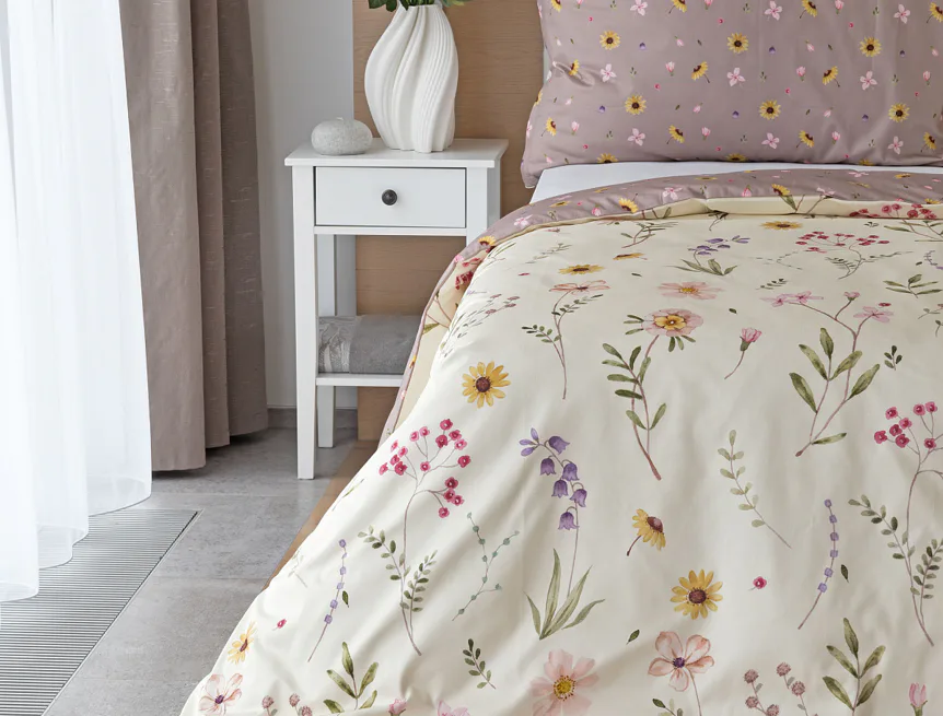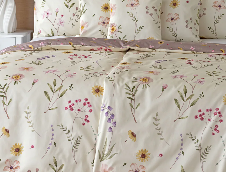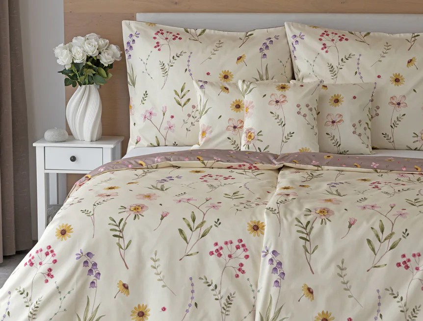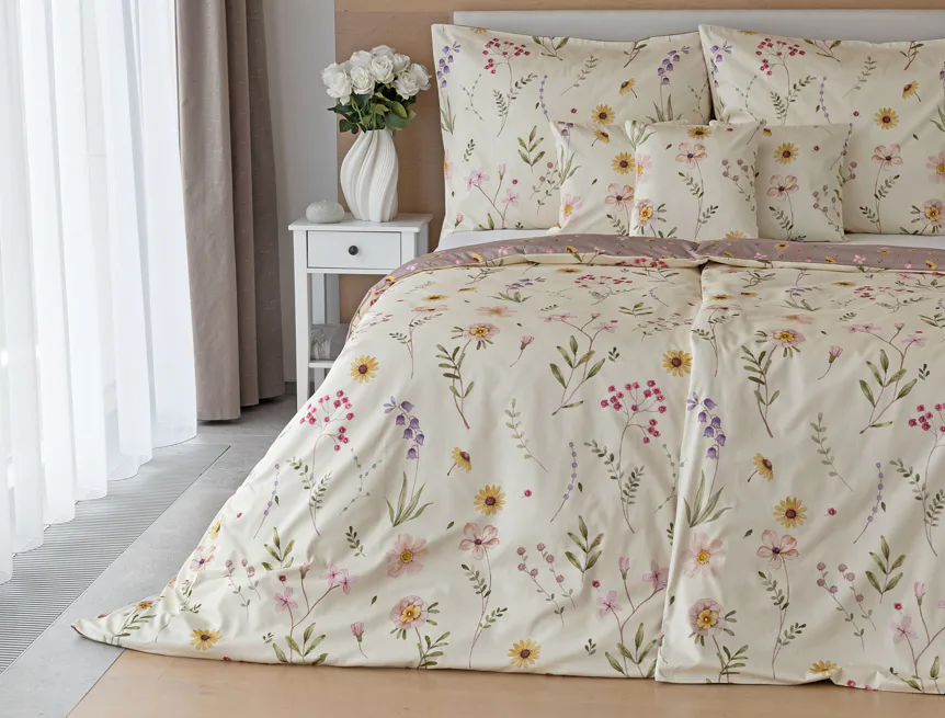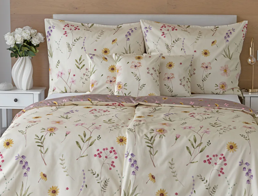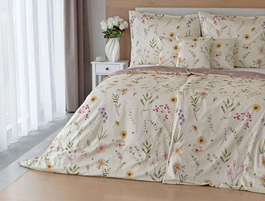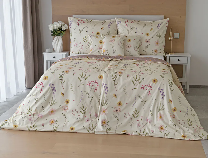 Bavlněné povlečení Primavera vás okouzlí jemným květinovým vzorem inspirovaným lučními květy. Kombinace krémově žlutého podkladu s drobnými kvítky v pastelových odstínech růžové, fialové a žluté působí něžně a přirozeně, zatímco druhá strana v tlumeném starorůžovém/taupe tónu dodává povlečení hravost a variabilitu. Díky decentní barevnosti a jemnému designu je povlečení ideální volbou pro romantické, venkovské i moderní ložnice.