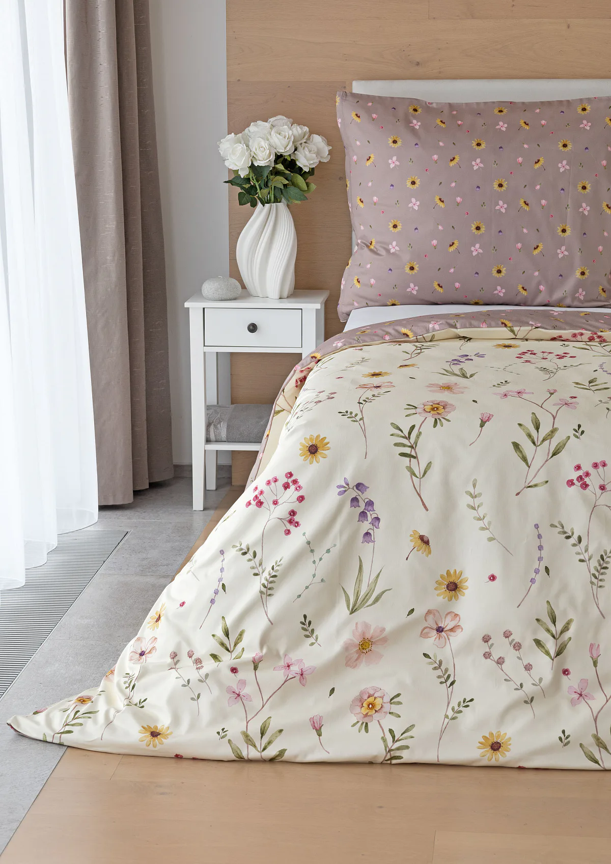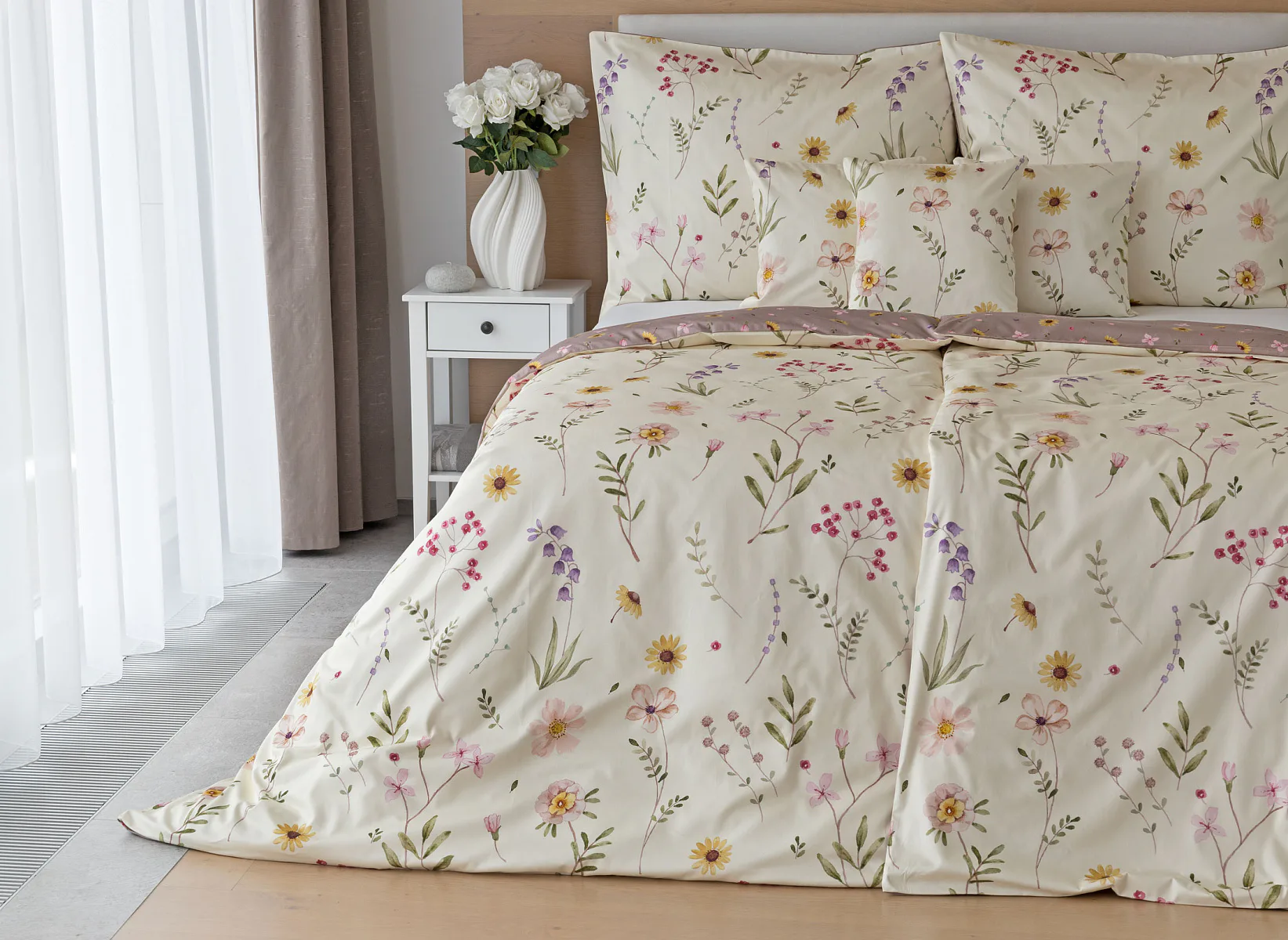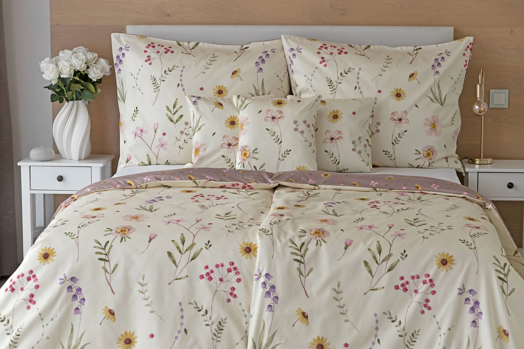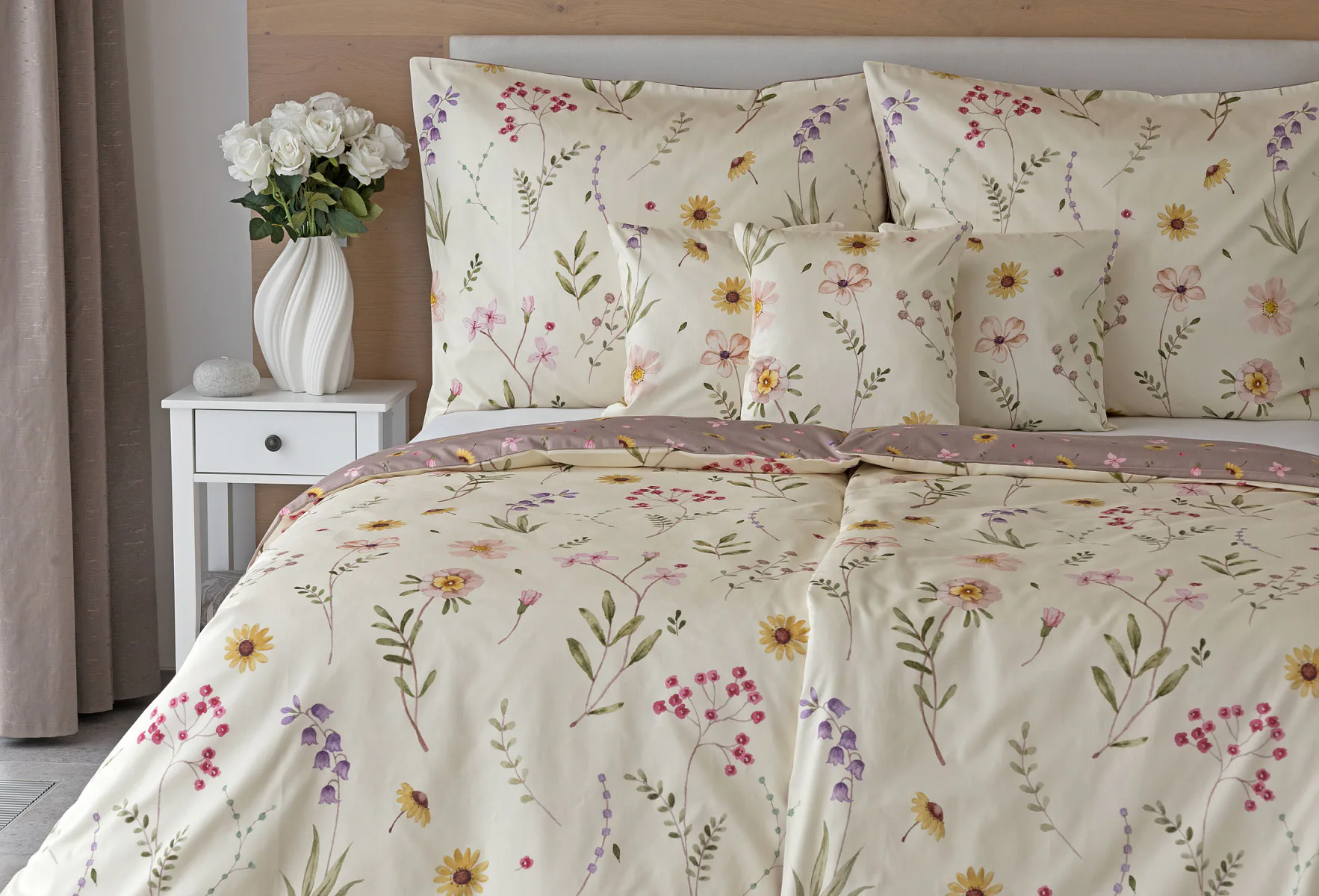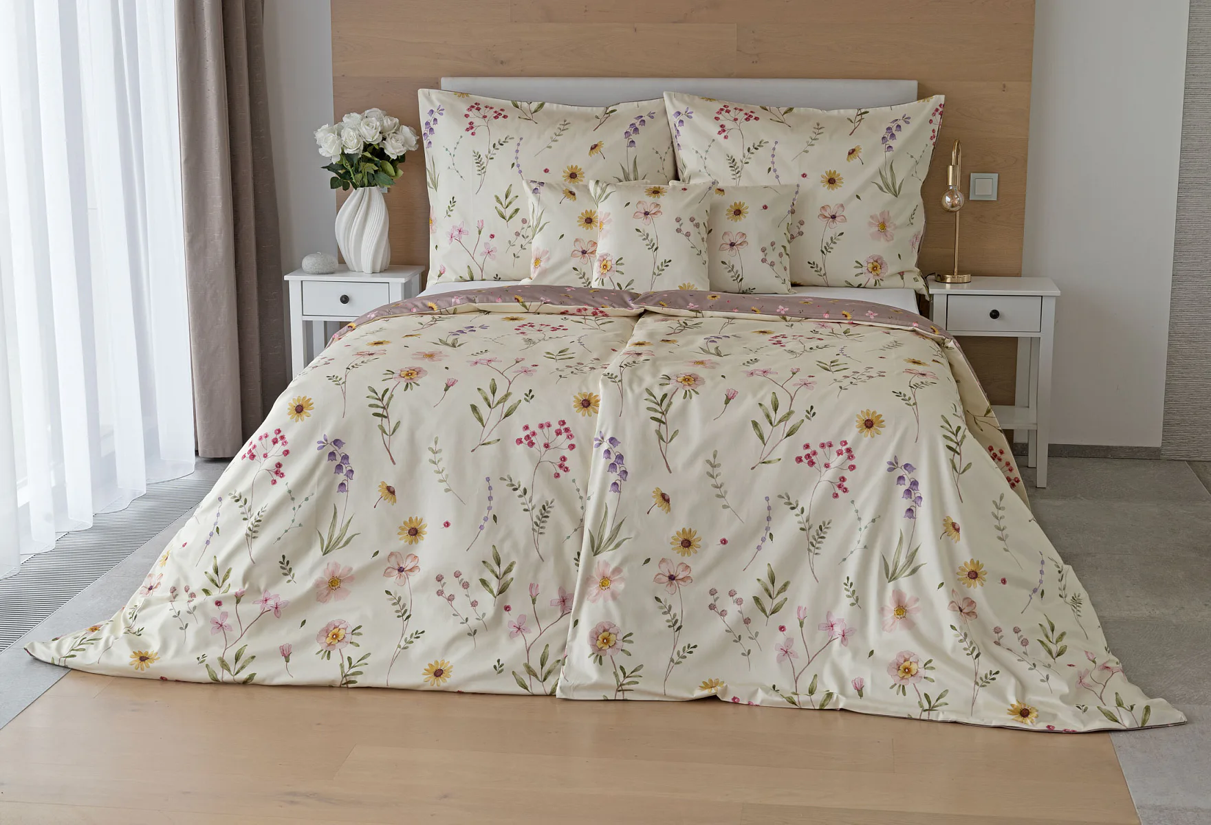 Bavlněné povlečení Primavera vás okouzlí jemným květinovým vzorem inspirovaným lučními květy. Kombinace krémově žlutého podkladu s drobnými kvítky v pastelových odstínech růžové, fialové a žluté působí něžně a přirozeně, zatímco druhá strana v tlumeném starorůžovém/taupe tónu dodává povlečení hravost a variabilitu. Díky decentní barevnosti a jemnému designu je povlečení ideální volbou pro romantické, venkovské i moderní ložnice.
