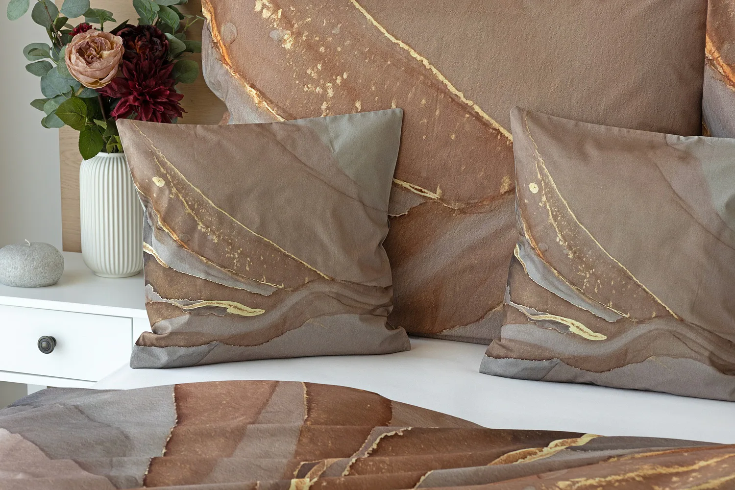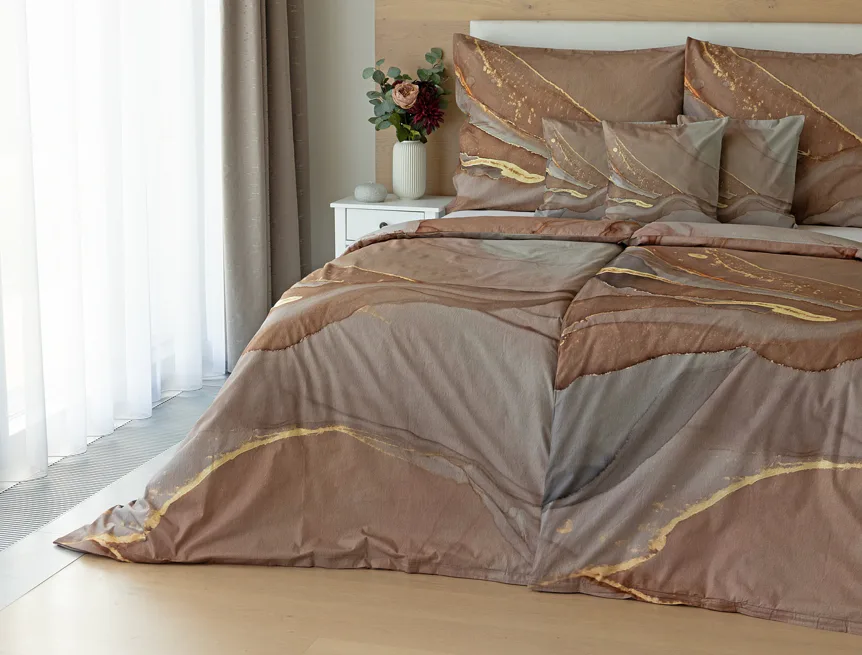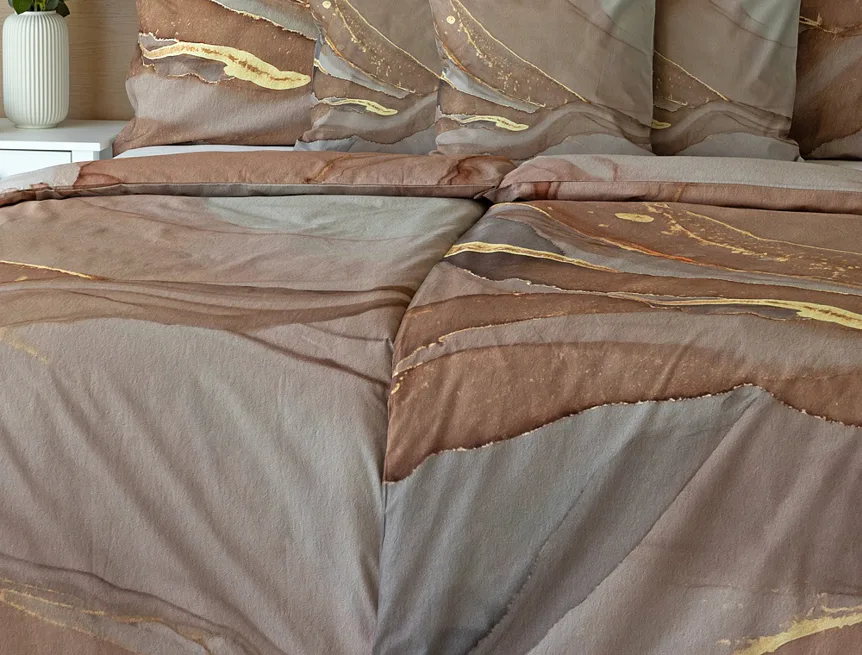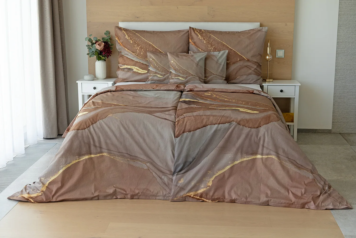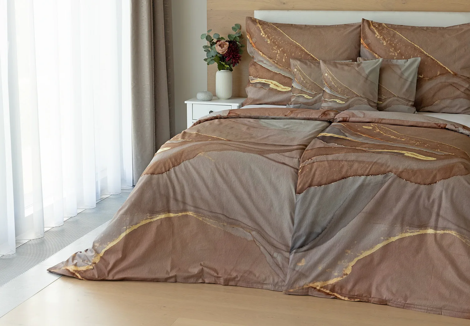 Bavlněné povlečení Riana vnese do vaší ložnice jedinečný styl a eleganci. Abstraktní vzor kombinuje paletu hnědých a šedohnědých tónů protnutých zlatavou linkou. Povlečení je vyrobeno ze 100% prvotřídní bavlny a přináší nejen estetickou hodnotu, ale i výjimečný komfort.
