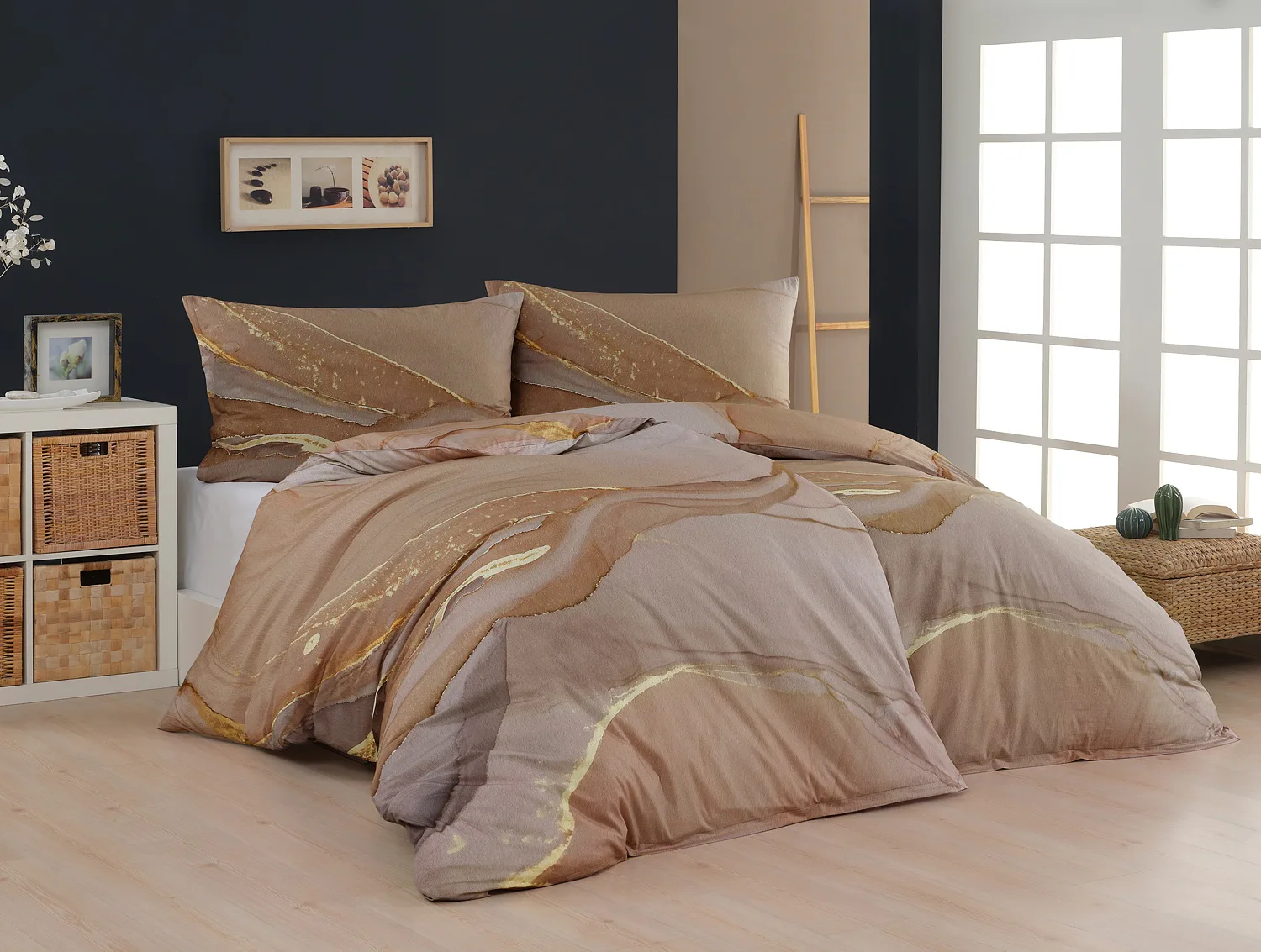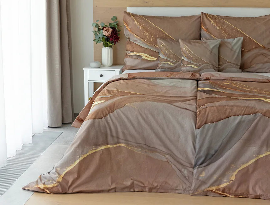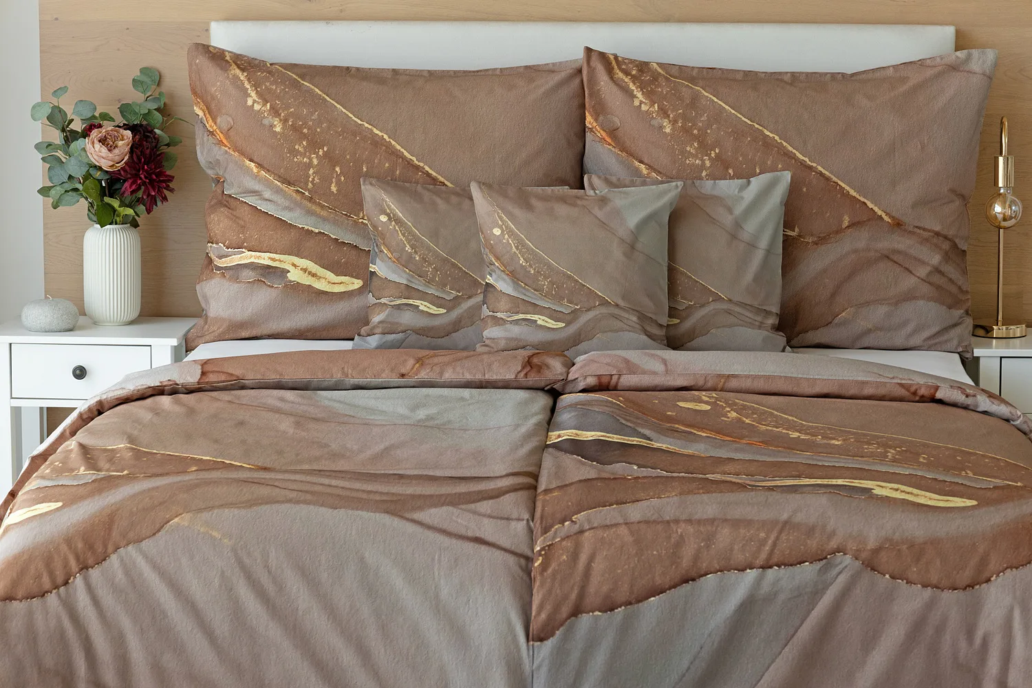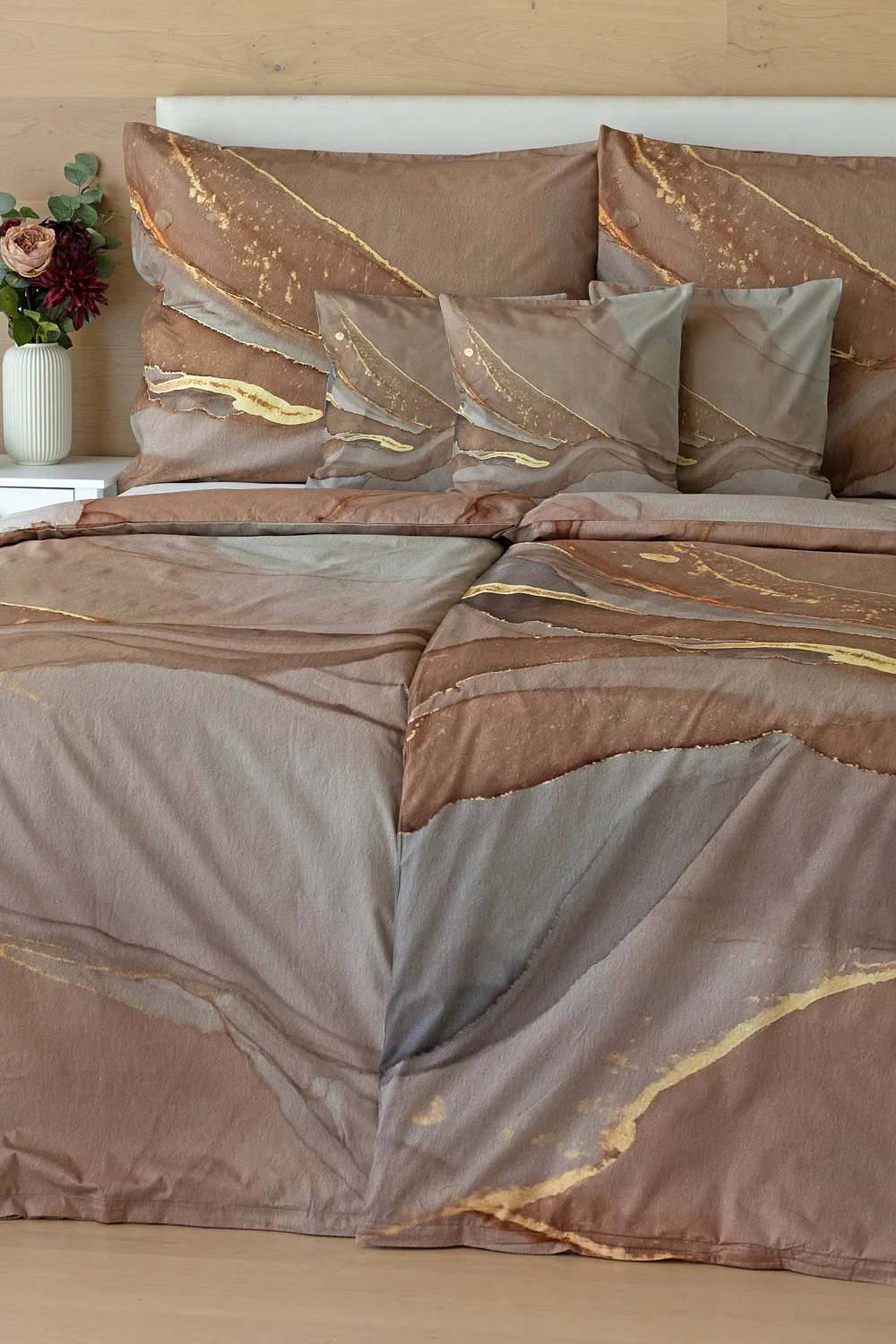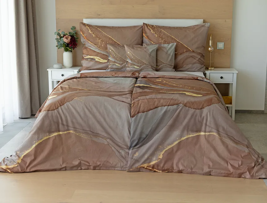 Bavlněné povlečení Riana vnese do vaší ložnice jedinečný styl a eleganci. Abstraktní vzor kombinuje paletu hnědých a šedohnědých tónů protnutých zlatavou linkou. Povlečení je vyrobeno ze 100% prvotřídní bavlny a přináší nejen estetickou hodnotu, ale i výjimečný komfort.