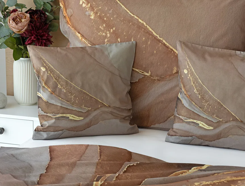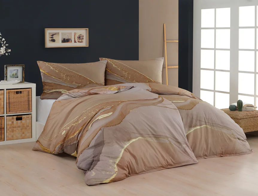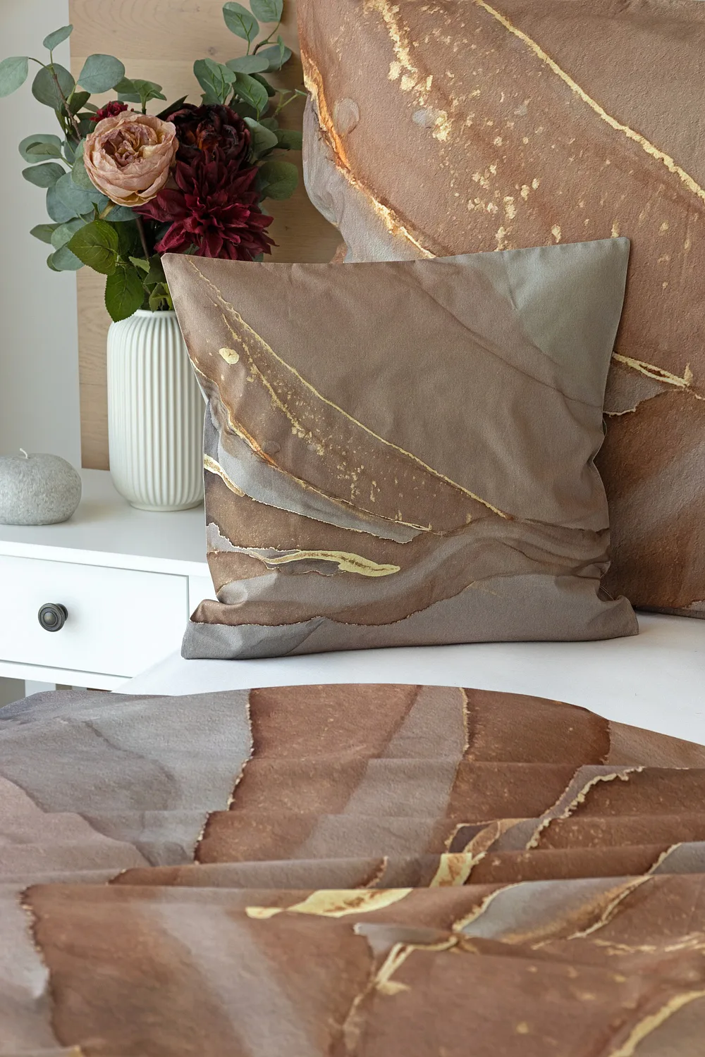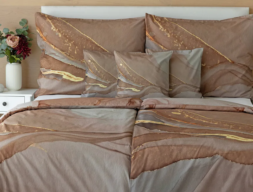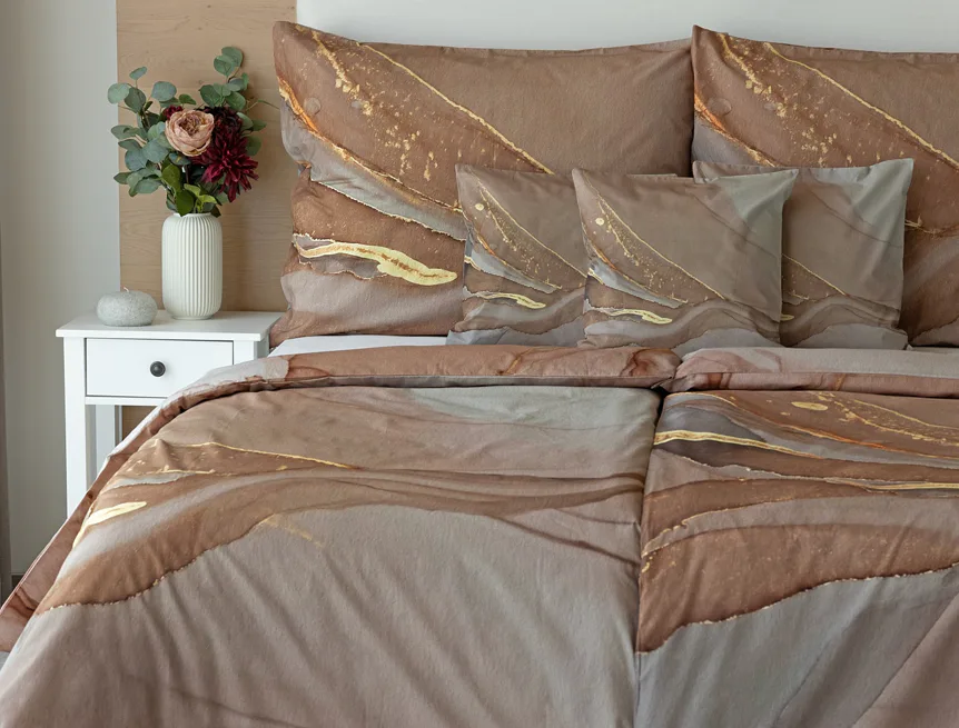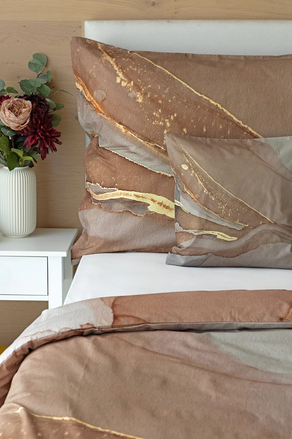 Bavlněné povlečení Riana vnese do vaší ložnice jedinečný styl a eleganci. Abstraktní vzor kombinuje paletu hnědých a šedohnědých tónů protnutých zlatavou linkou. Povlečení je vyrobeno ze 100% prvotřídní bavlny a přináší nejen estetickou hodnotu, ale i výjimečný komfort.