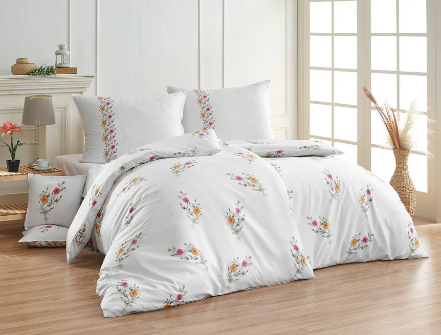 Čistý, vzdušný a velmi elegantní vzor. Skvěle funguje v romantických i minimalistických ložnicích; bílé plochy nechají vyniknout květům a opticky projasní prostor.