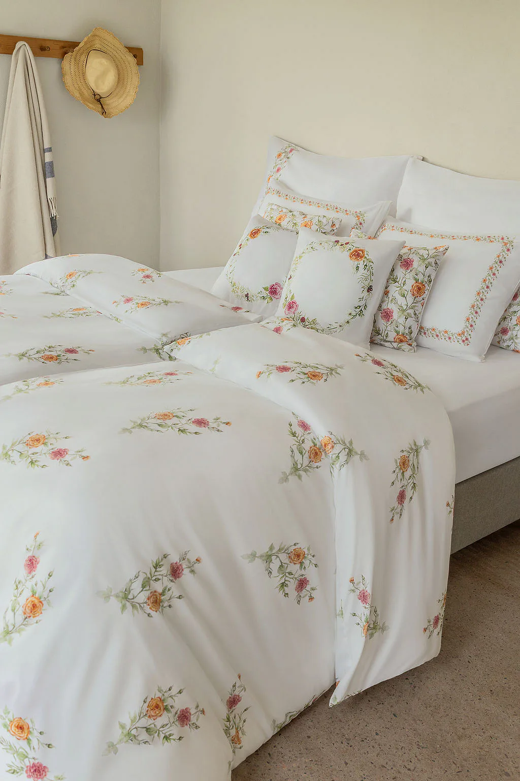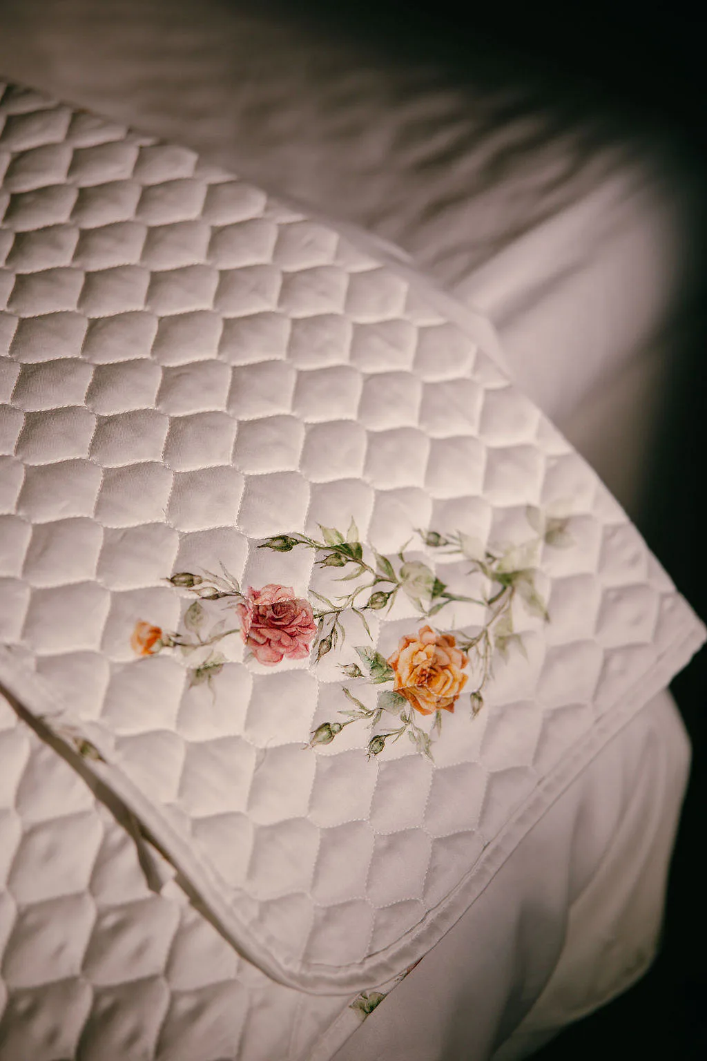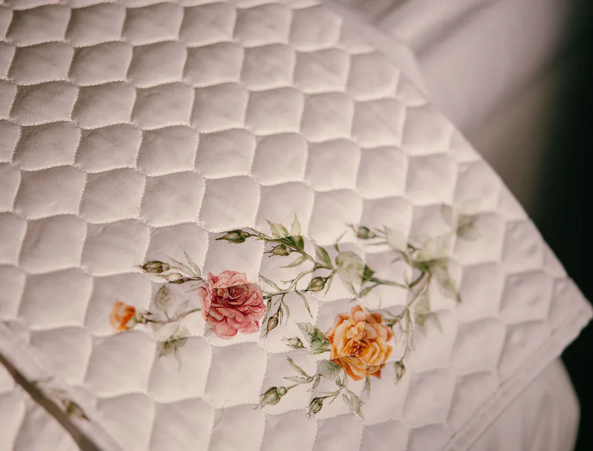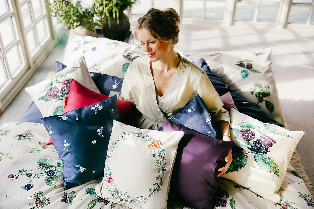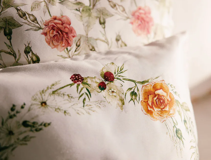 „Růže mě provází celý život doma,“ vypráví Zuzana – lemovaly chodníky u babičky, předzahrádky ve vesnici i její současný dům. Na povlečení je proto přenesla s klidem něžného rituálu. Velké plochy bílé působí jako porcelán: „lesk, jemnost a čistota“ v kontrastu s barvami květů vytváří slavnostní, téměř obřadní klid spánku. Satén vede kompozici k noblese „nejlepších hotelových pokojů“, elegantní lemy podtrhují pocit, že každý večer může být malou premiérou stylu.