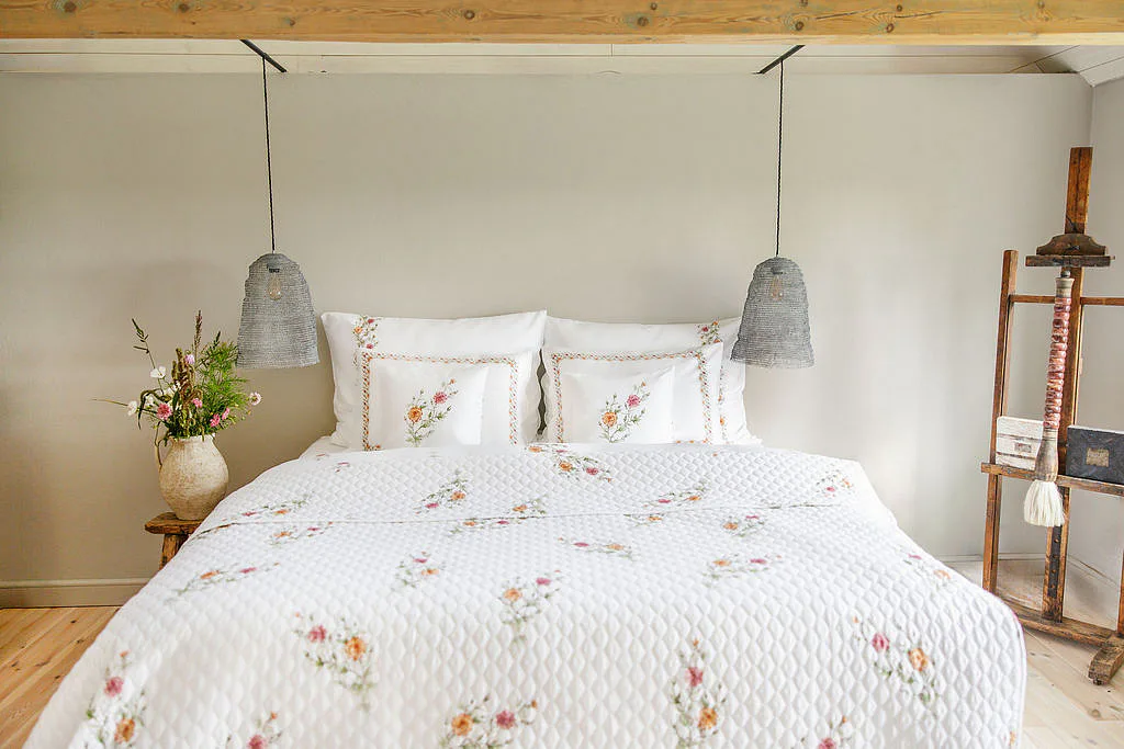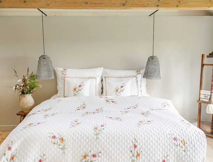 Dolaďte bílými či pudrovými prostěradly, přidejte prošívaný přehoz, jednobarevné povlaky v barvě okvětních lístků nebo strukturovanou deku v krémové barvě.