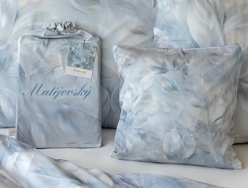 Vzor Savio zdobí po celé ploše motiv listů v modrobéžových tónech na šedomodrém podkladu. Povlak na polštář i na přikrývku je z obou stran stejný, povlečení je opatřeno komfortním zipovým uzávěrem.