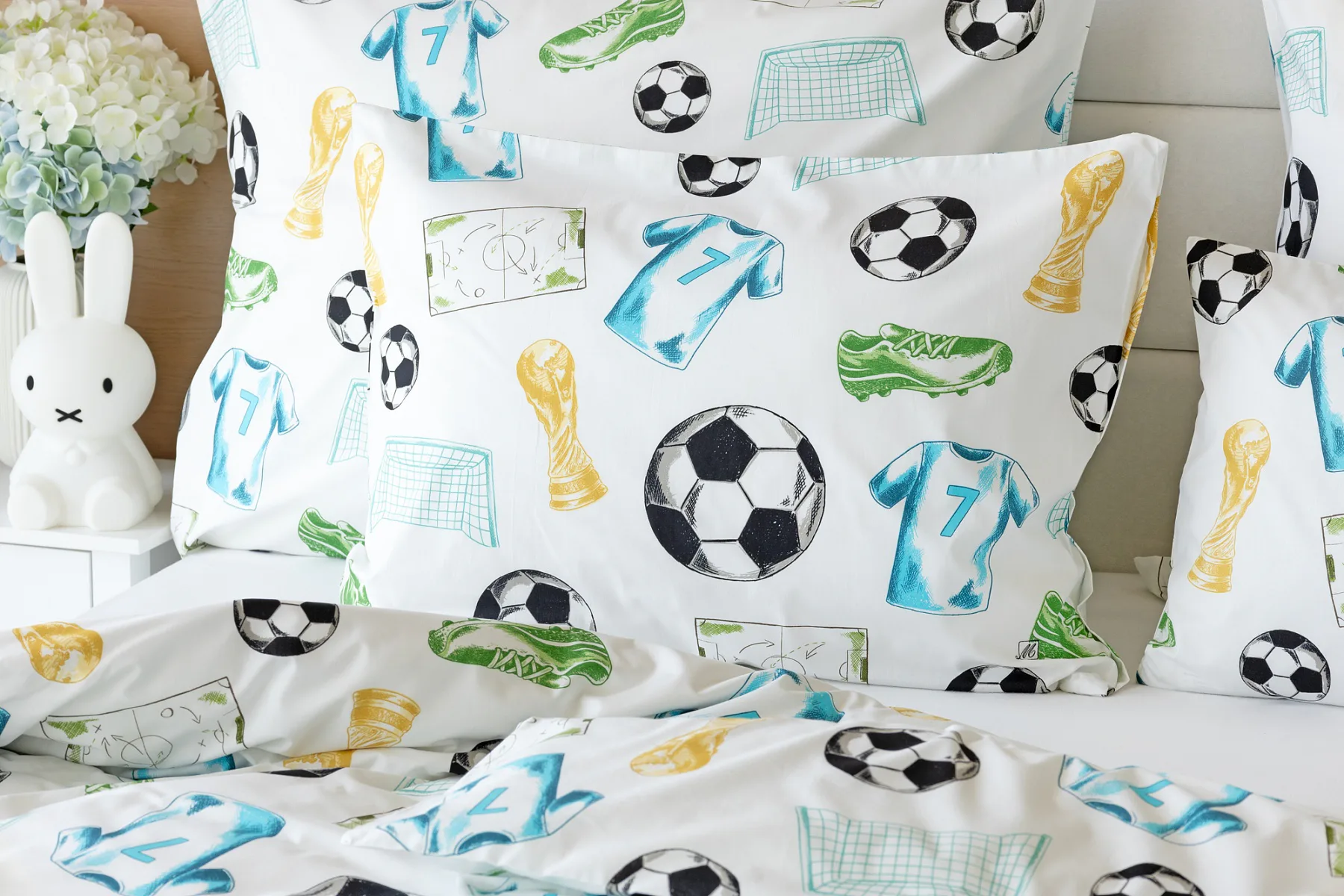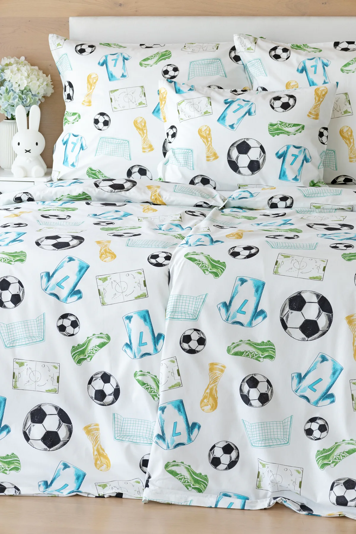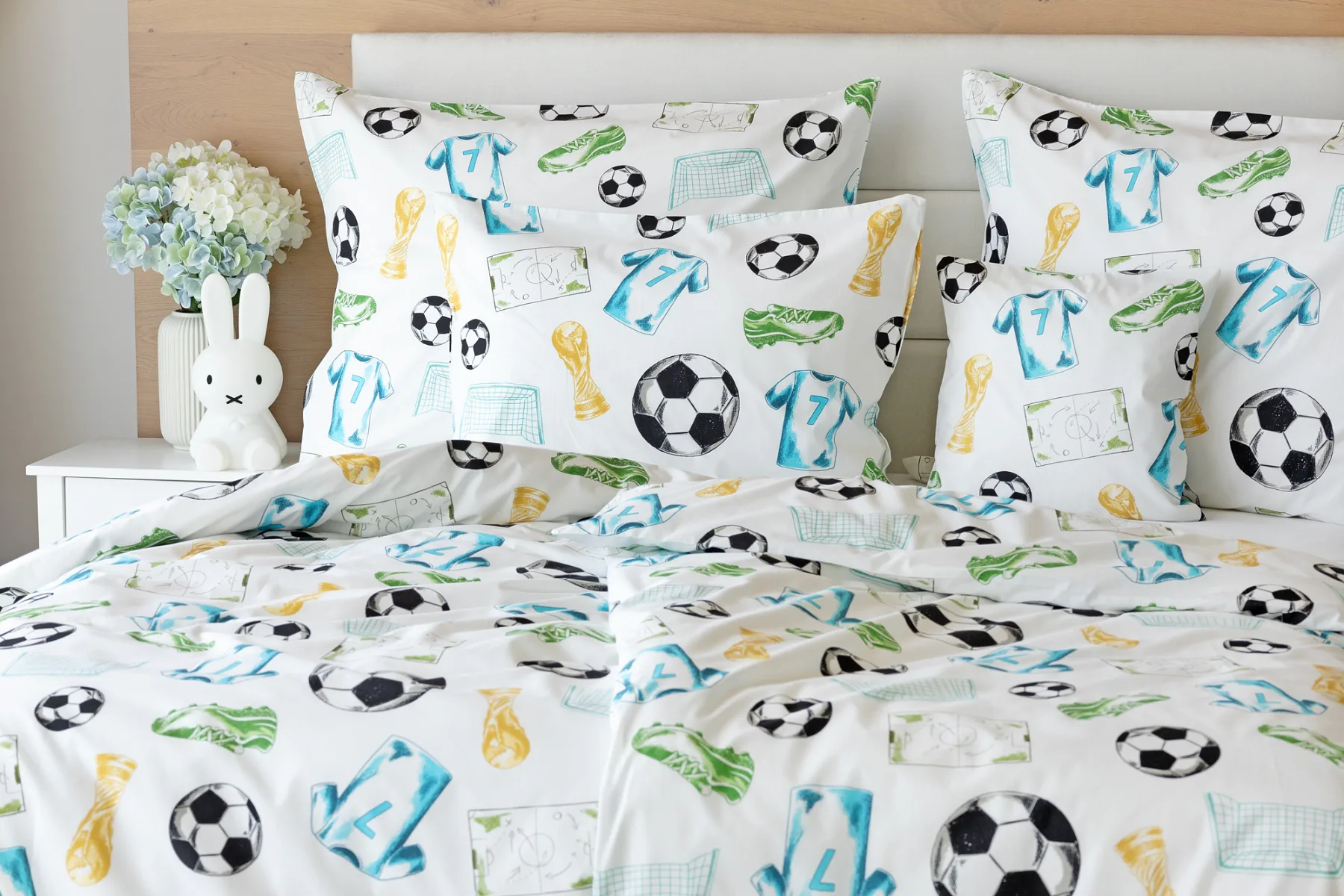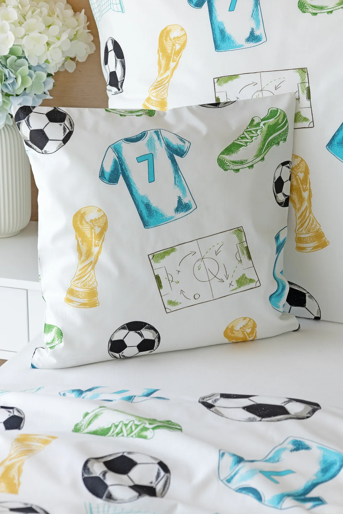 Potěšte své dítko novým bavlněným povlečením Sporty s fotbalovou tematikou. Oblíbený sportovní motiv kombinuje atraktivní barvy na bílém podkladu. Díky stoprocentní prvotřídní bavlně budou spokojeně usínat děti i rodiče.