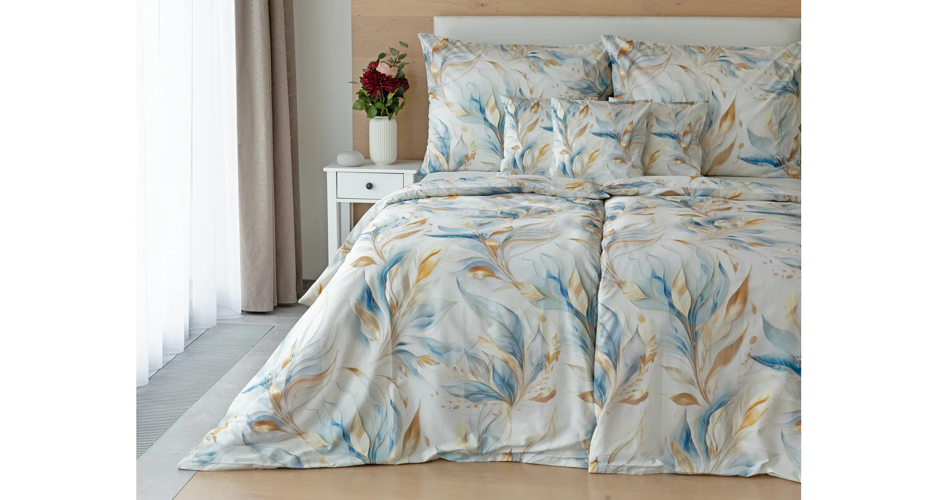Vzor Symphony zdobí po celé ploše motiv zlatých a modrých listů na šedobílém podkladu. Povlak na polštář i na přikrývku je z obou stran stejný, povlečení je opatřeno komfortním zipovým uzávěrem.