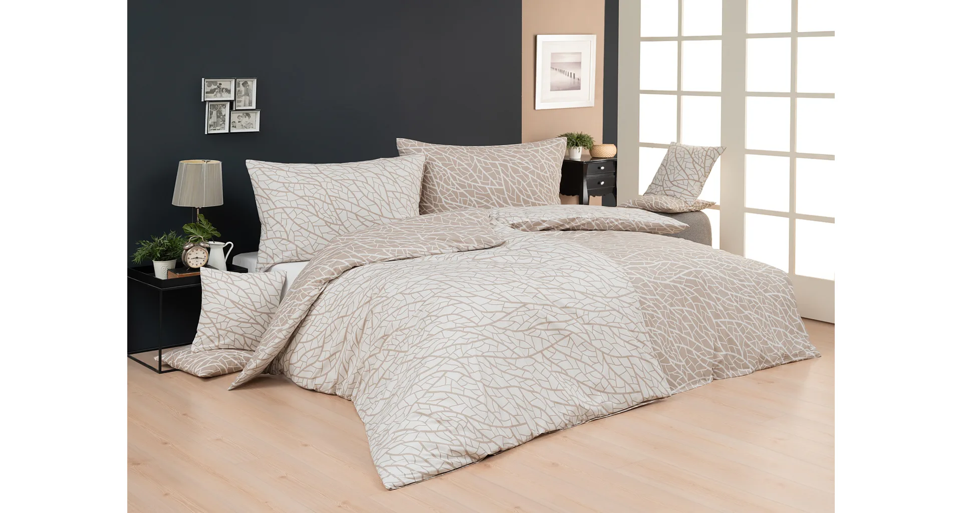 Ložní povlečení Venatio je jako stvořené pro milovníky střídmé elegance se smyslem pro detail. V nápaditém vzoru se snoubí hřejivý odstín bílé kávy protnutý krémově bílou. Díky oblíbenému oboustrannému provedení můžete při stlaní hravě improvizovat.