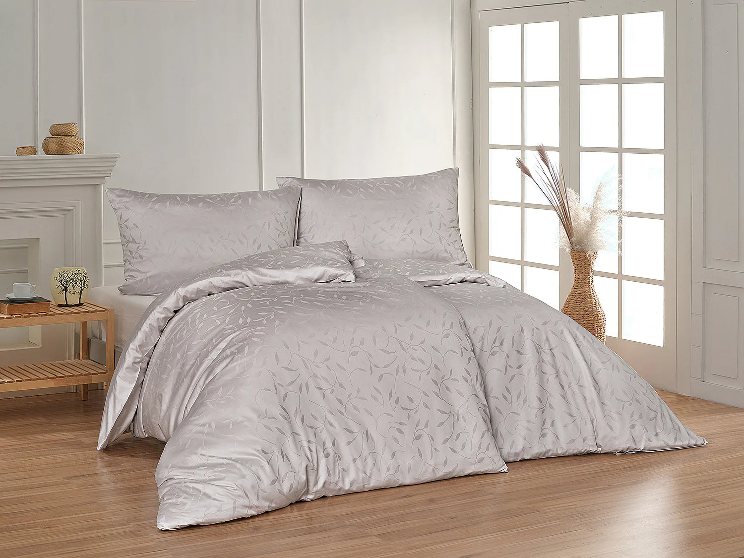 Tato synonyma vystihují žakárové damaškové povlečení VICTORIA s decentním florálním vzorem. Přirozený lesk a jemné vytkané lístky se dokonale snoubí s perleťově šedým odstínem.