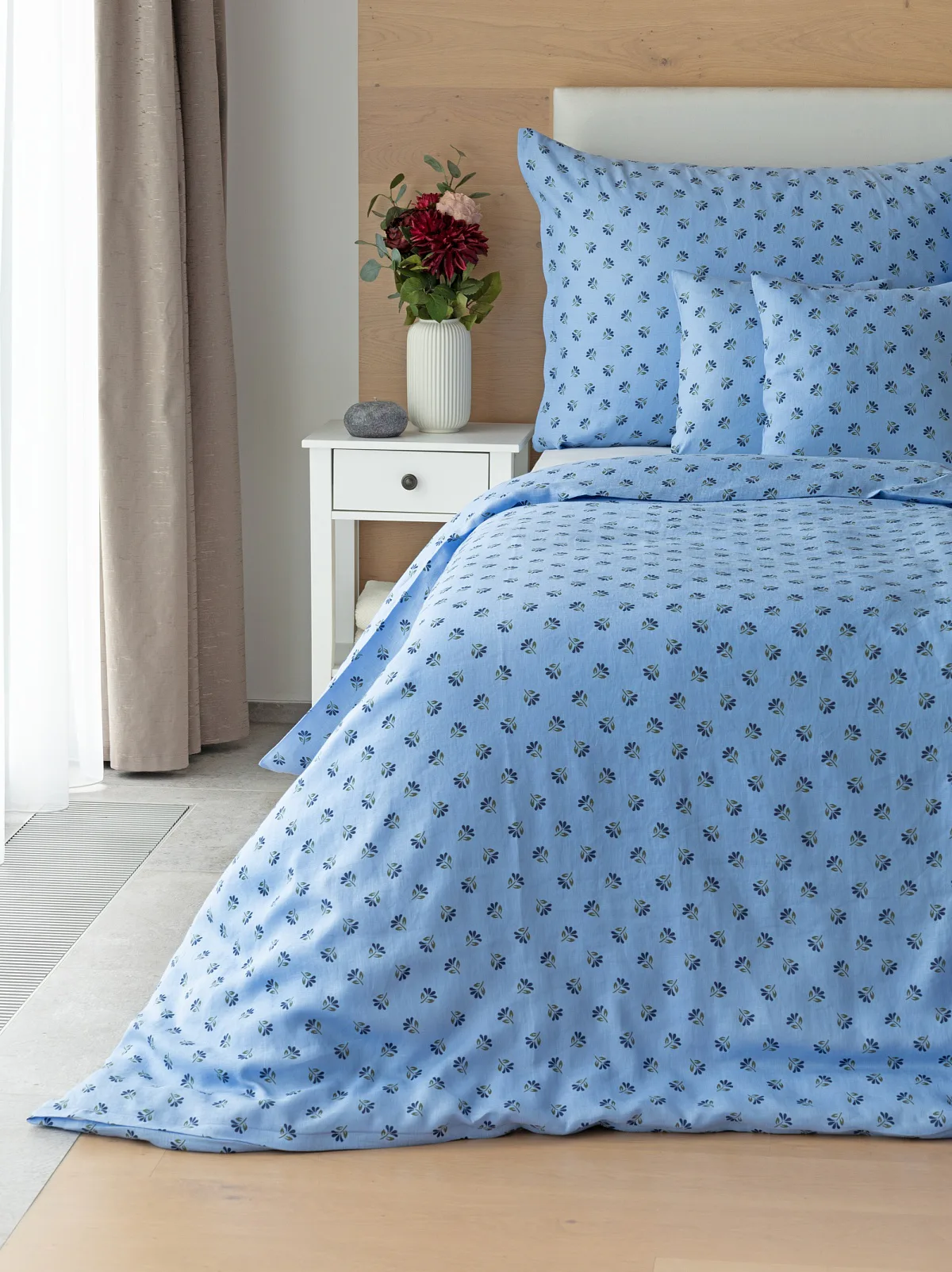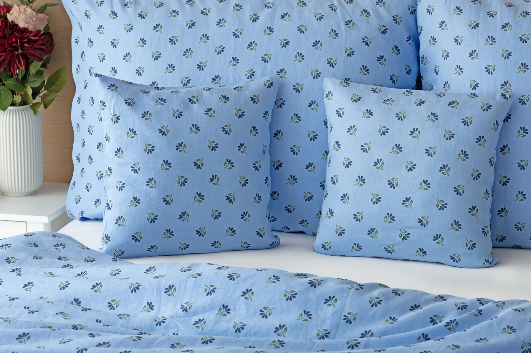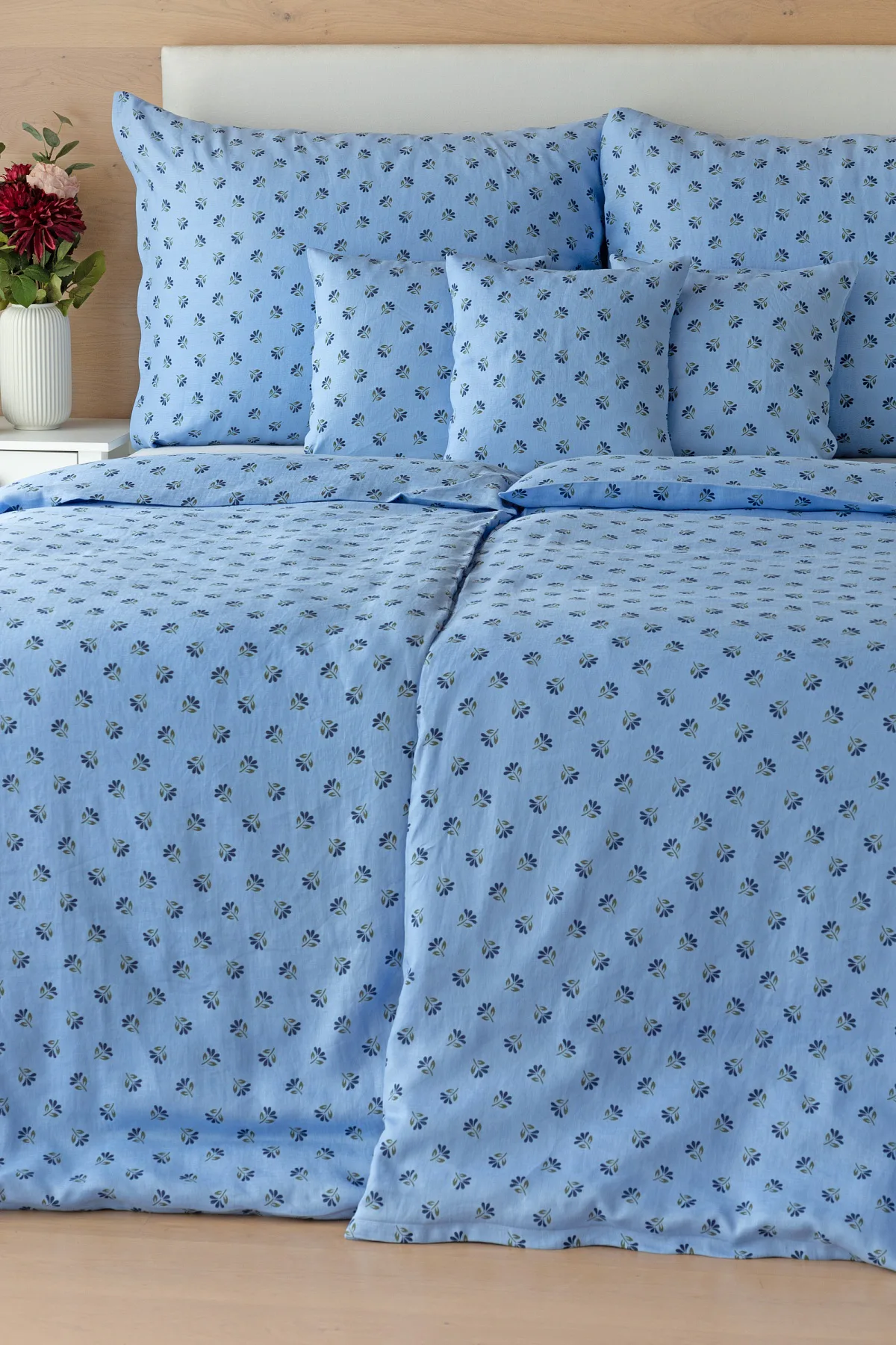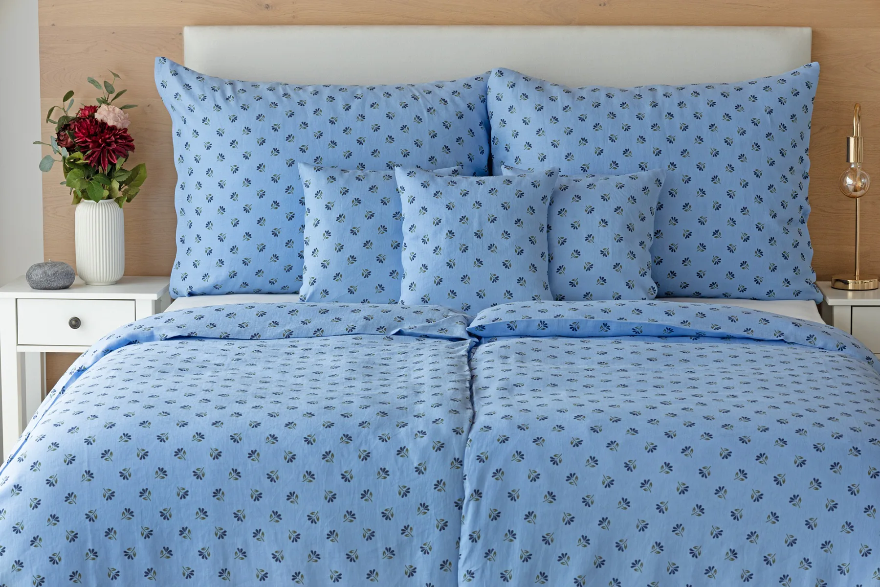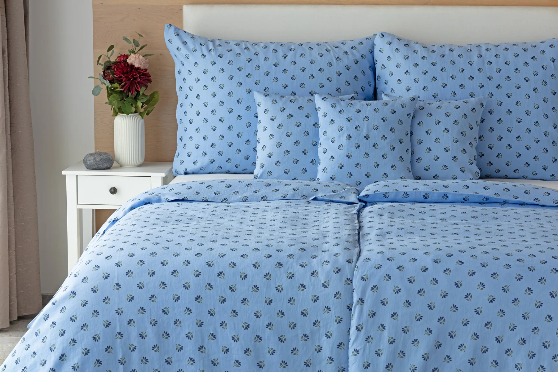 Objevte benefity jedinečného přírodního materiálu a dopřejte si nezaměnitelný komfort s naším lněným povlečením Viola. Rustikální motiv jemných kvítků na blankytně modrém podkladu je jako stvořený pro tento ekologicky šetrný materiál a doladí k dokonalosti každou ložnici ve venkovském stylu.