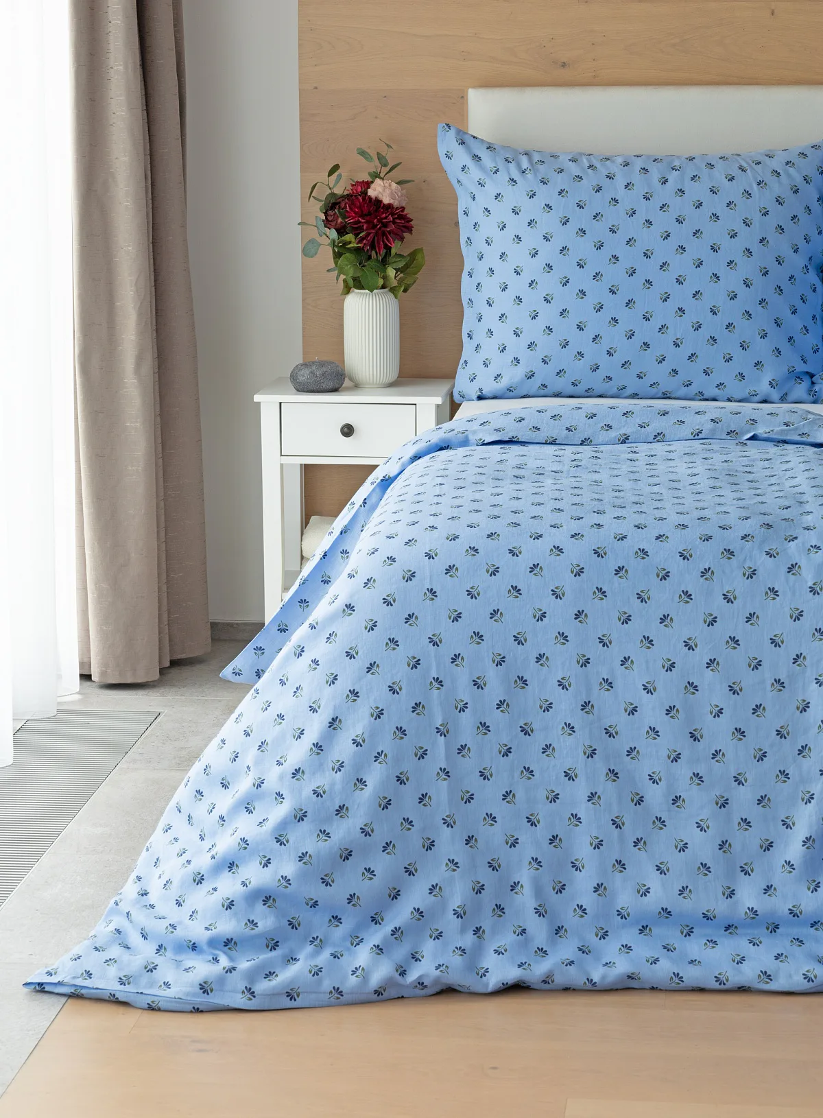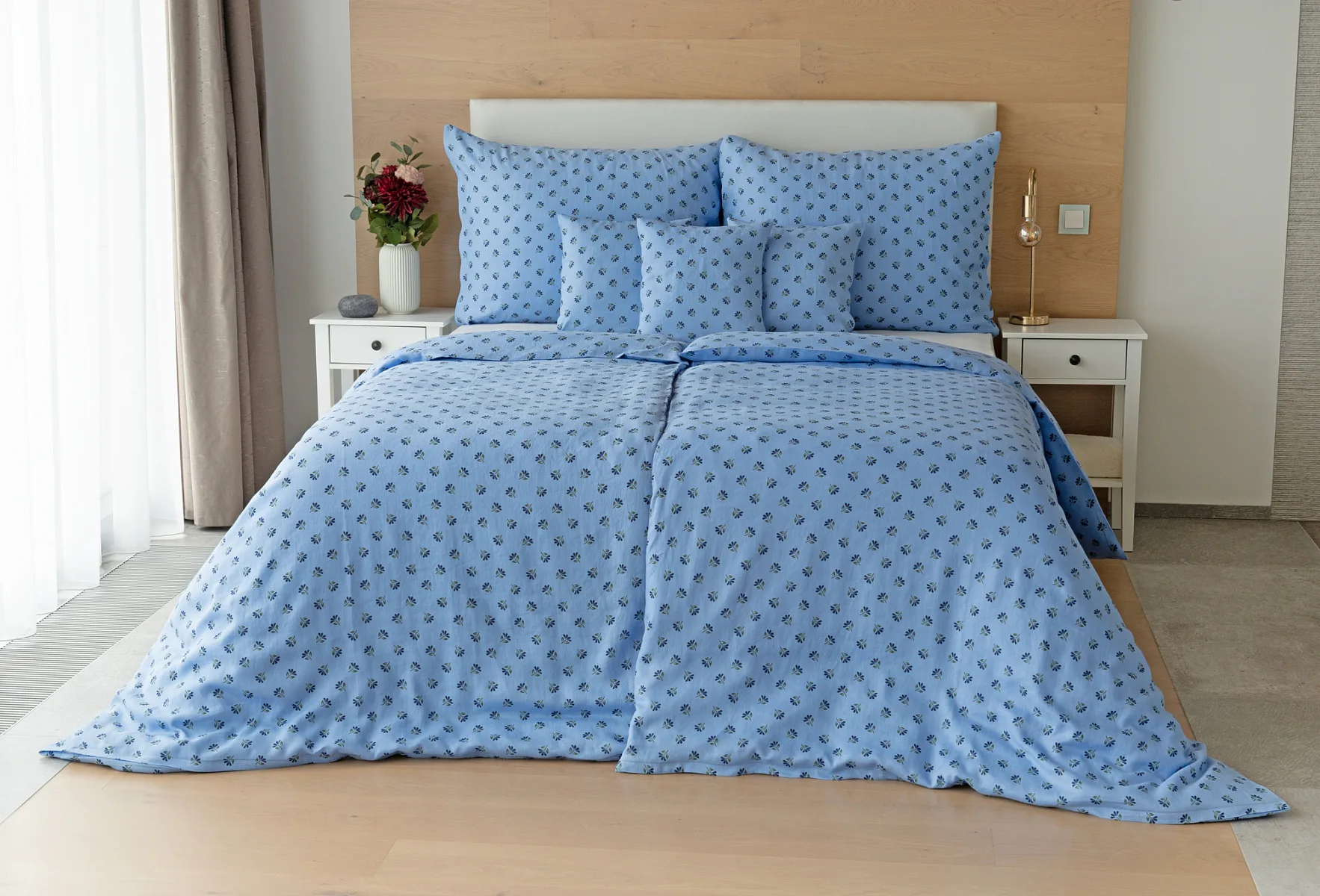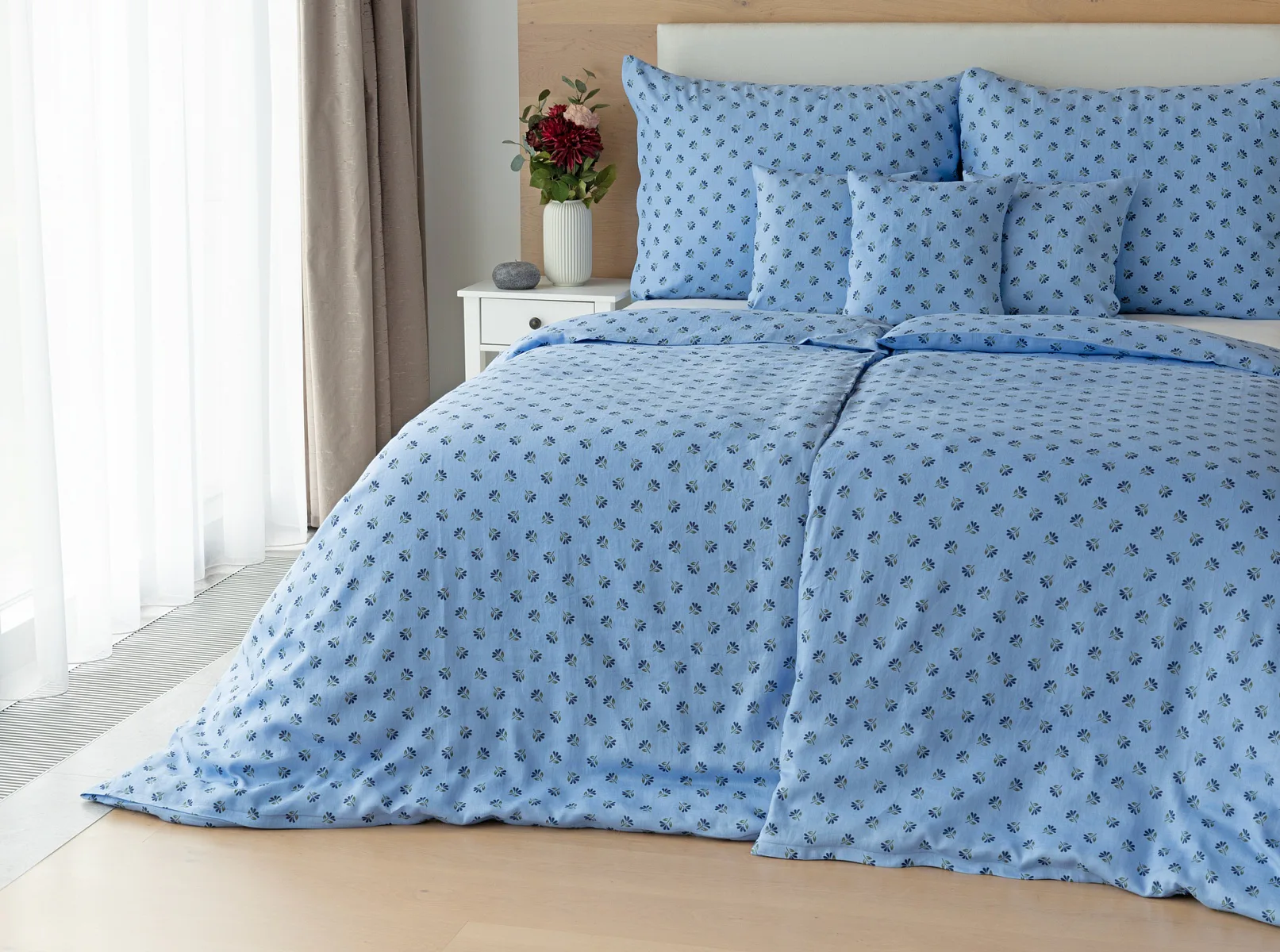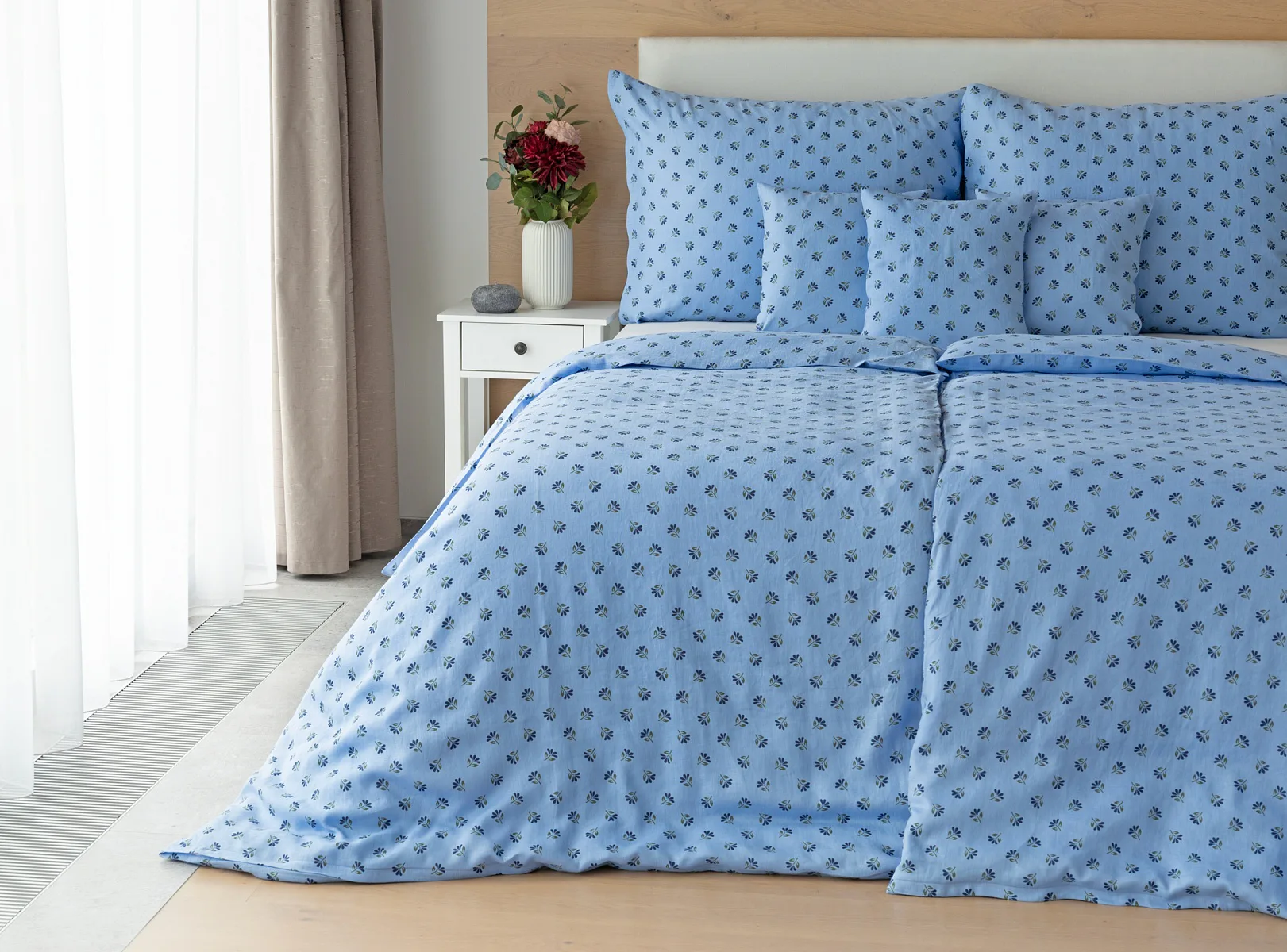 Objevte benefity jedinečného přírodního materiálu a dopřejte si nezaměnitelný komfort s naším lněným povlečením Viola. Rustikální motiv jemných kvítků na blankytně modrém podkladu je jako stvořený pro tento ekologicky šetrný materiál a doladí k dokonalosti každou ložnici ve venkovském stylu.