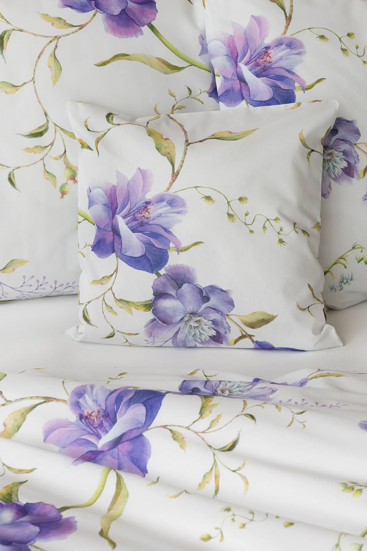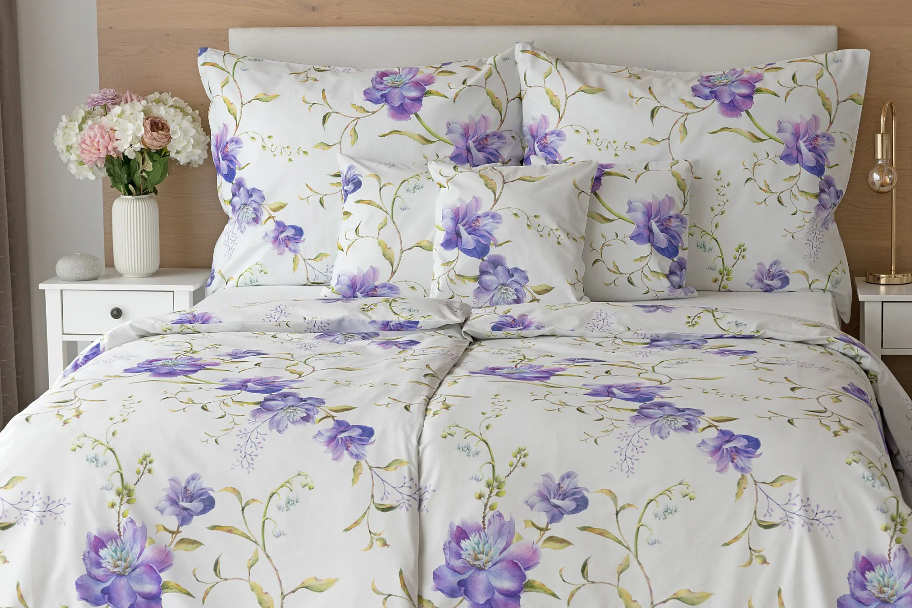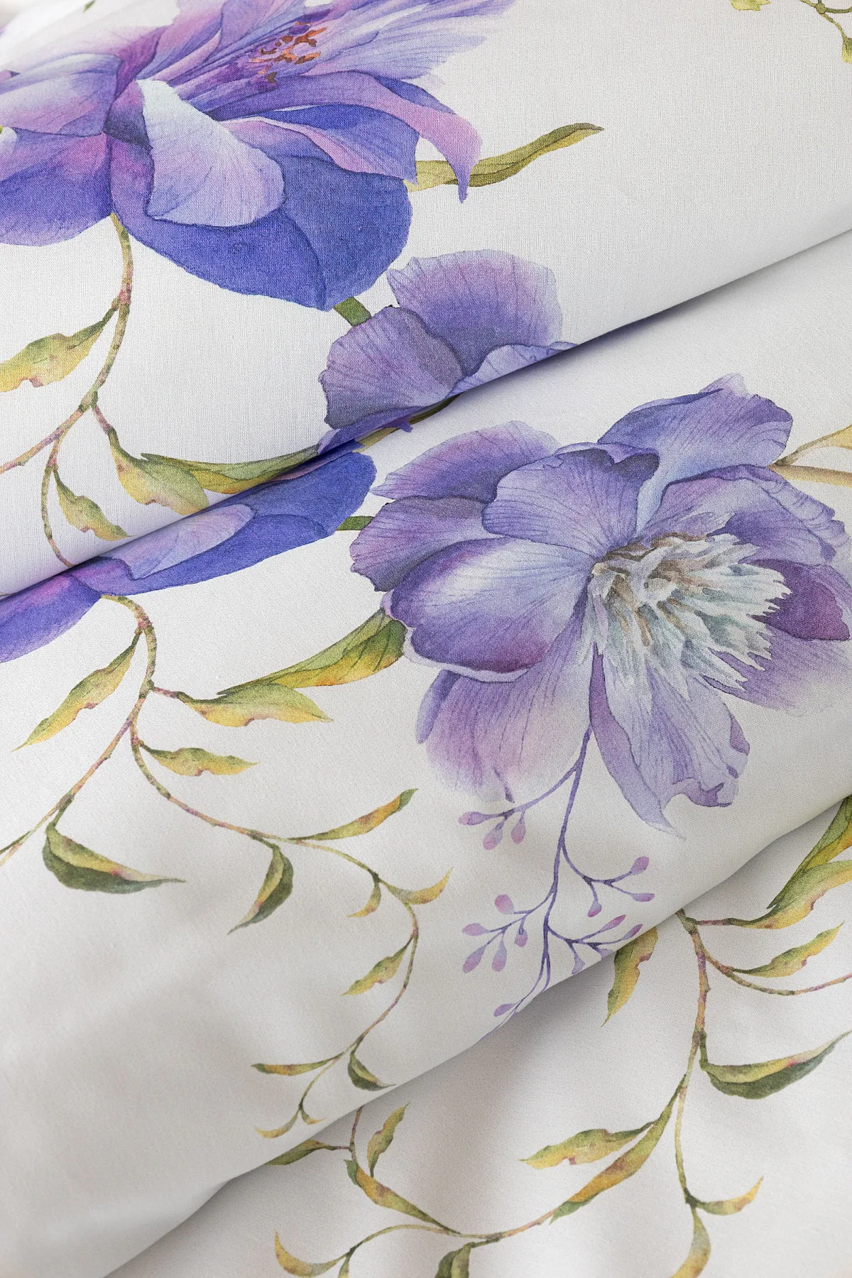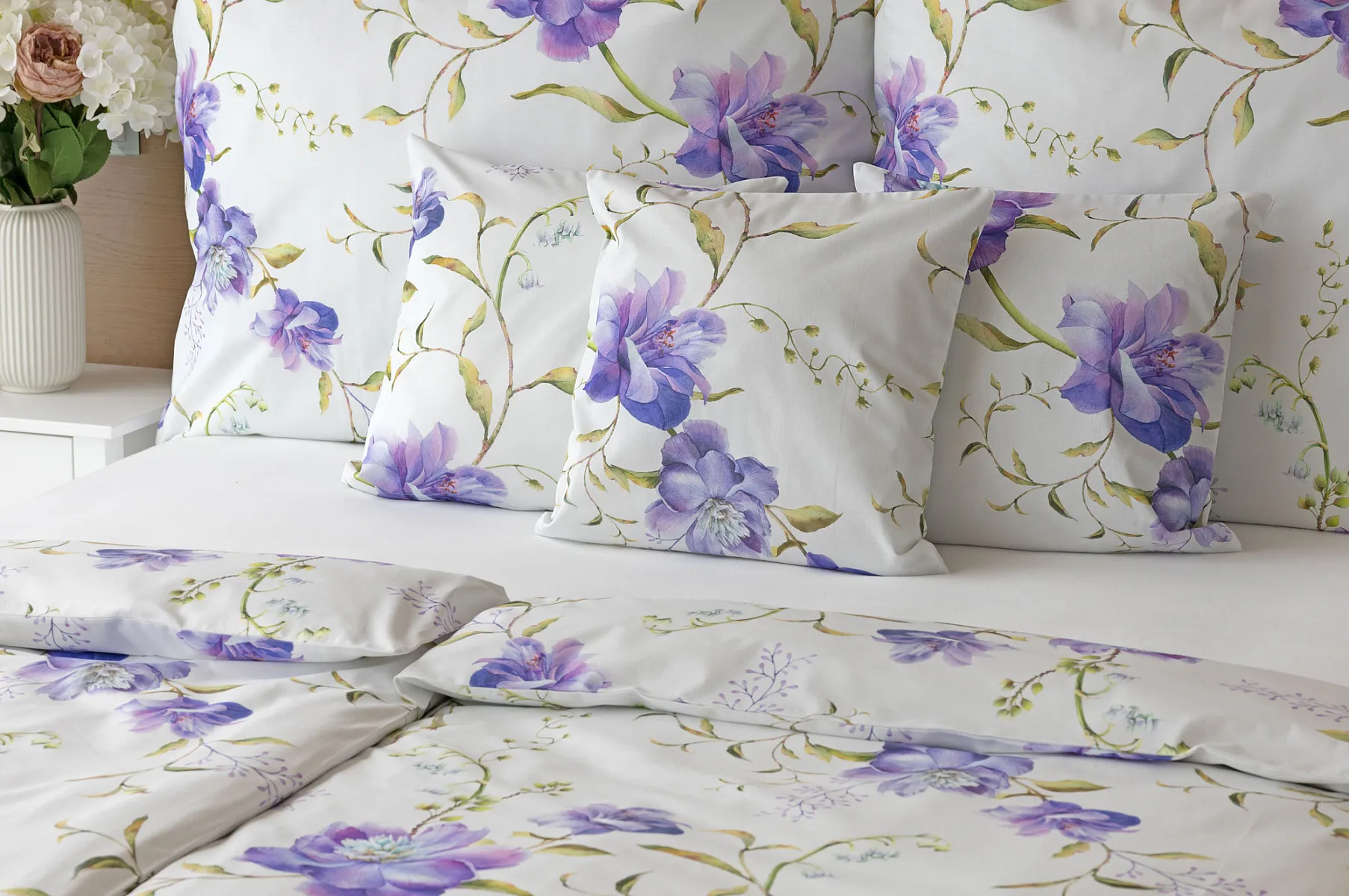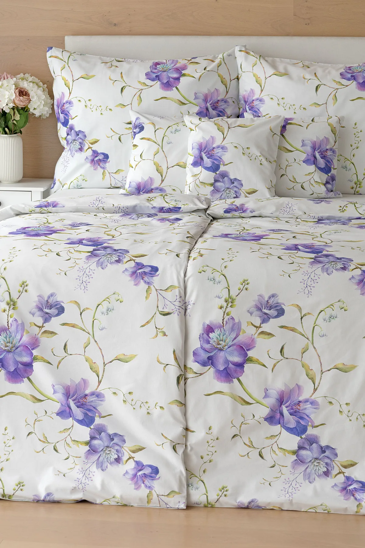 Něžný květinový motiv ložního povlečení Viola vás vtáhne do svěží atmosféry jarních dnů. Atraktivní fialové květy doplněné svěží zelení vynikají na bílém podkladu a díky nejmodernějšímu digitálnímu tisku si vychutnáte každý detail tohoto květinového vzhoru.