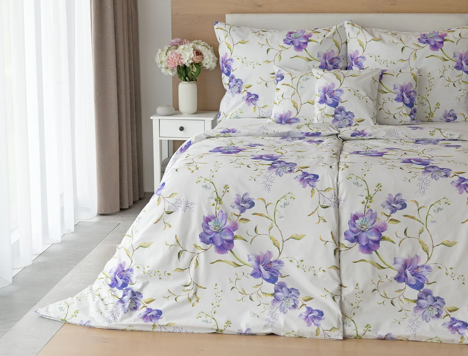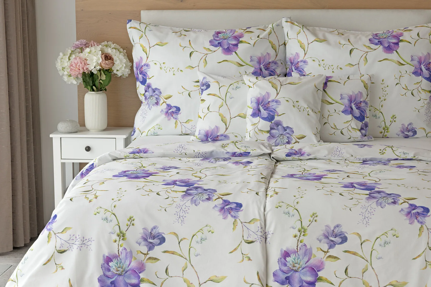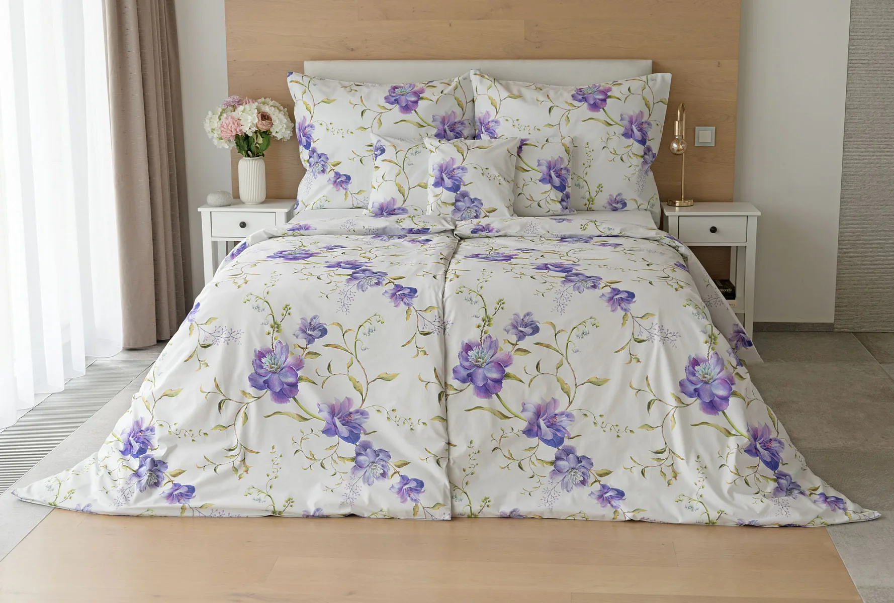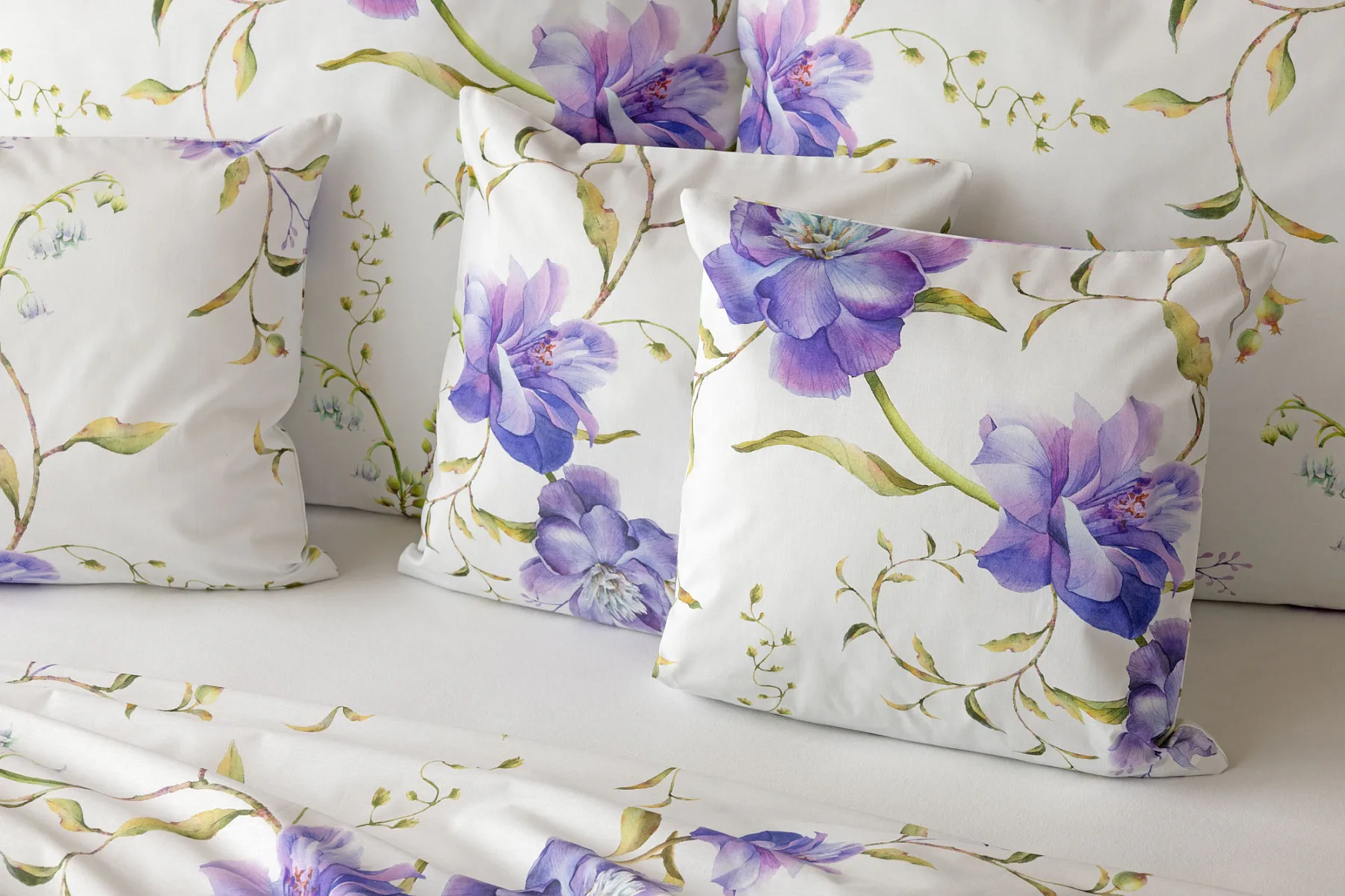 Něžný květinový motiv ložního povlečení Viola vás vtáhne do svěží atmosféry jarních dnů. Atraktivní fialové květy doplněné svěží zelení vynikají na bílém podkladu a díky nejmodernějšímu digitálnímu tisku si vychutnáte každý detail tohoto květinového vzhoru.