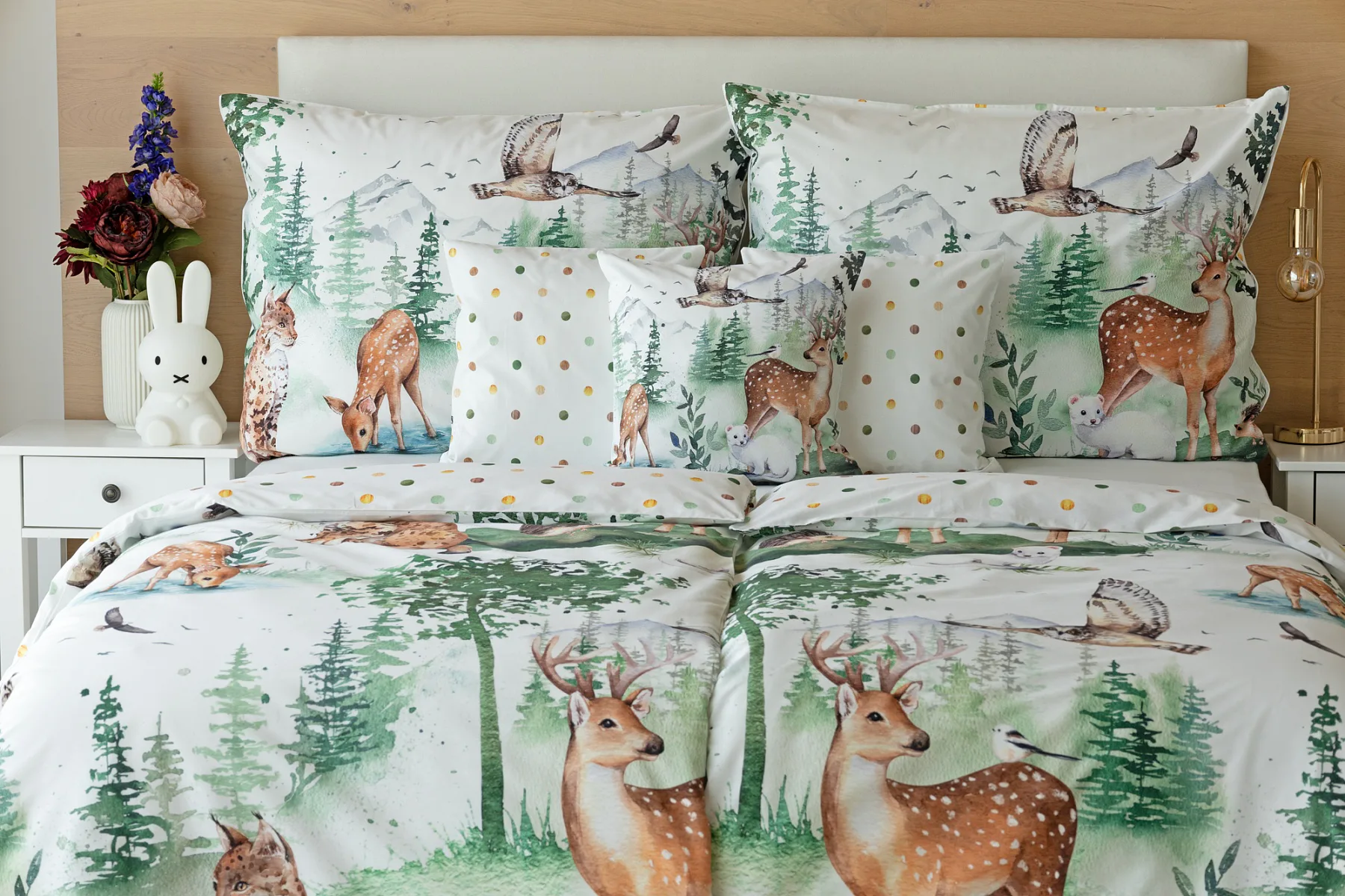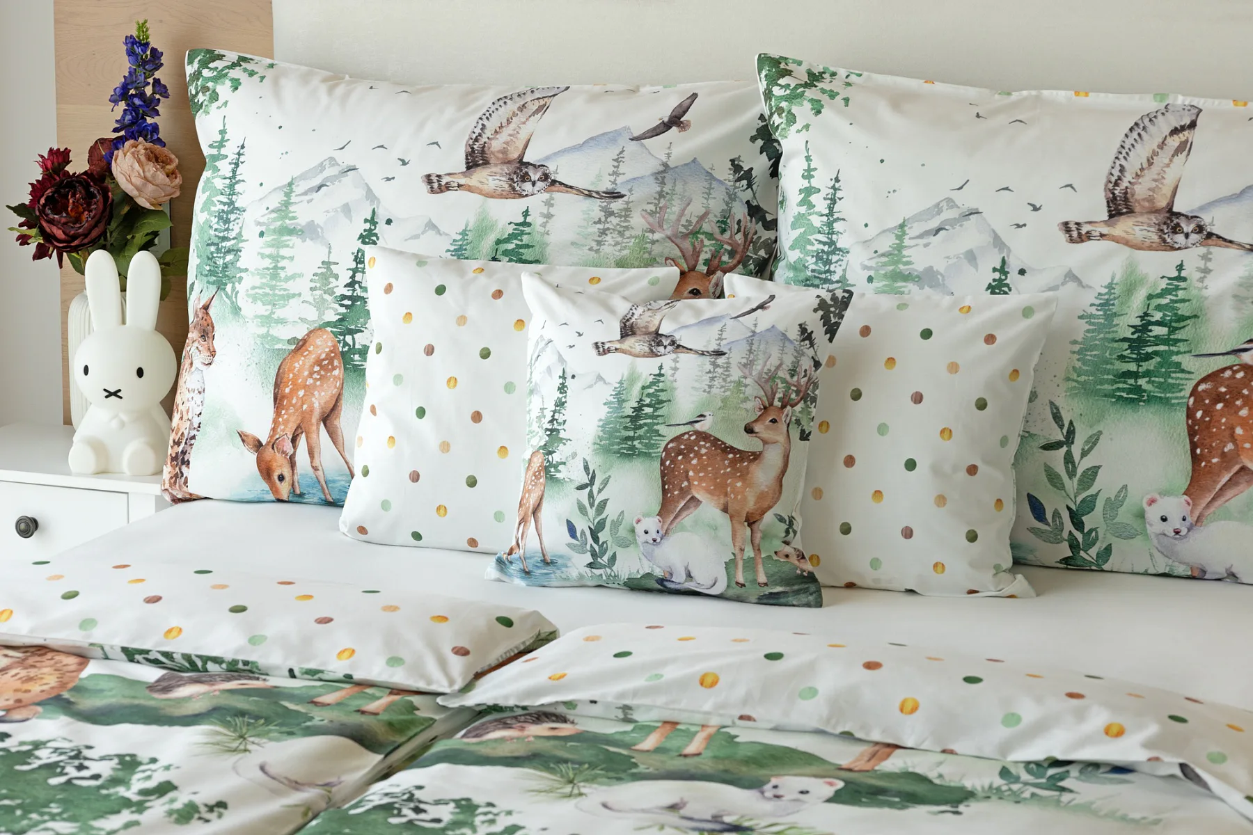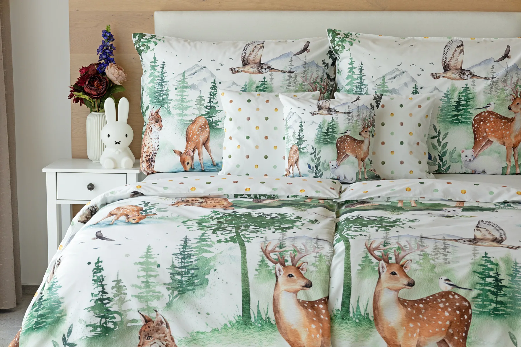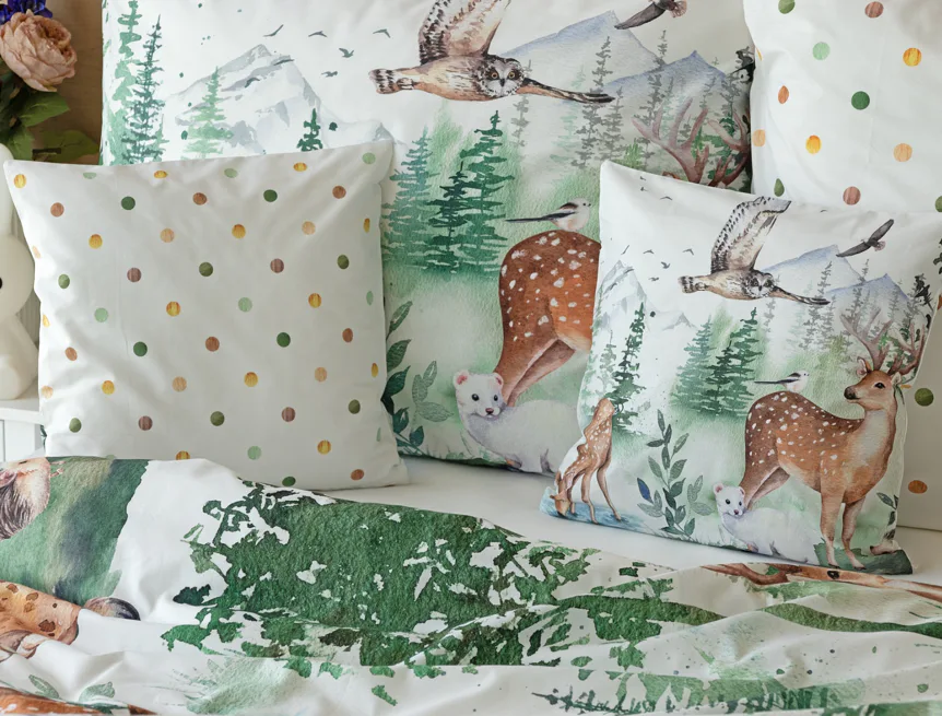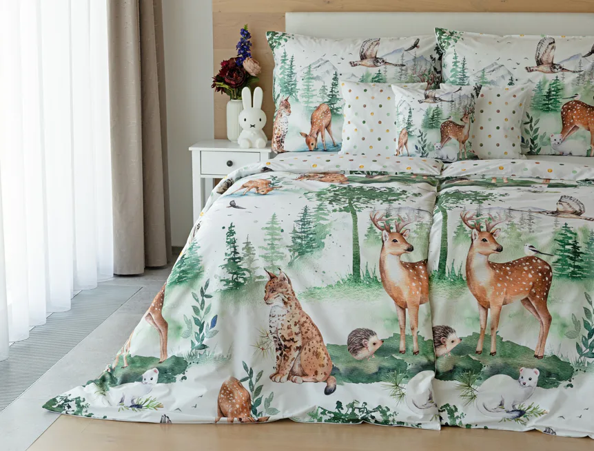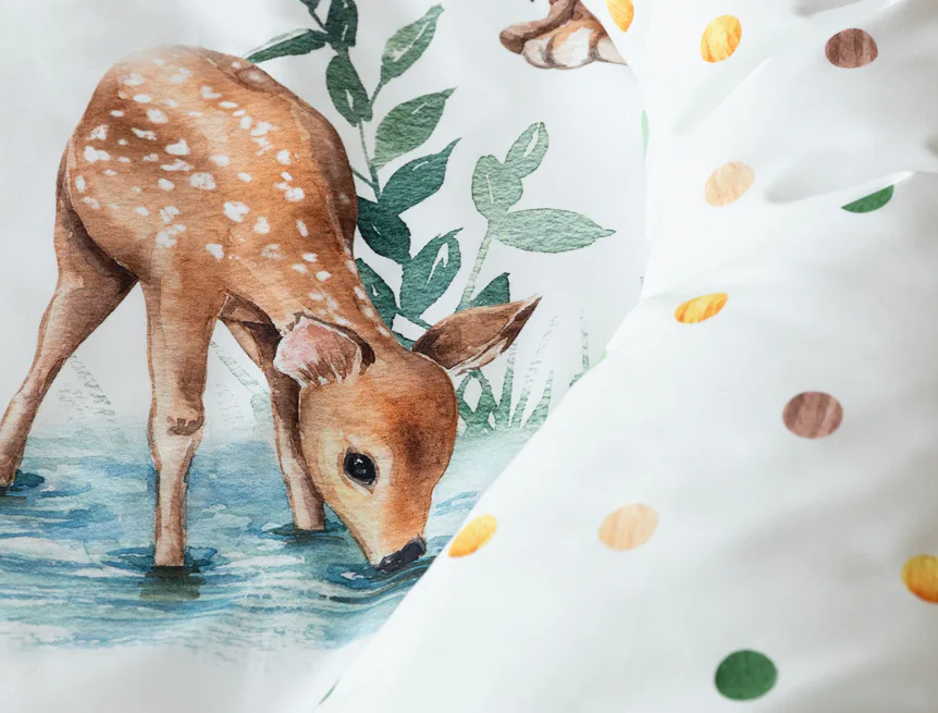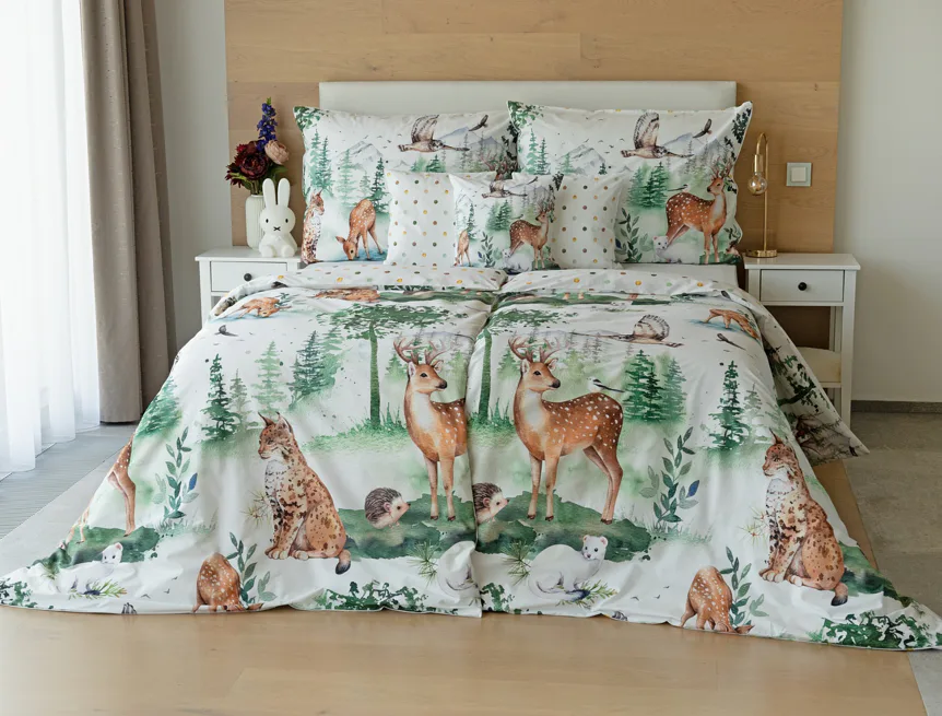 S bavlněným povlečením Wild se dětský pokojíček promění v útulnou říši lesních zvířátek, o kterých můžete před spaním vyprávět příběhy. Podkladem tohoto vzoru se stala ruční malba, která vyniká na povlečení v precizním detailu díky nejmodernějšímu digitálnímu tisku. Vaše děti budou spokojeně snít díky vysoce kvalitnímu materiálu z výběrové 100% bavlny.
