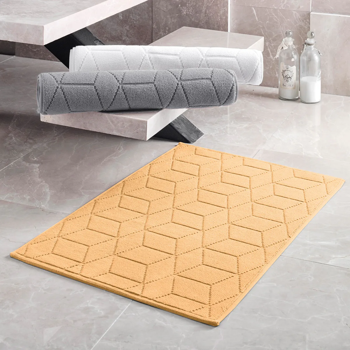 Nepostradatelný doplněk každé koupelny v provedení výběrové bavlny s vysokou gramáží, která zajistí nezaměnitelný komfort. Jednoduchý vytkávaný geometrický vzor na koupelnové předložce v kombinaci s dokonalým odstínem svěží meruňkové barvy zútulní vaši koupelnu.