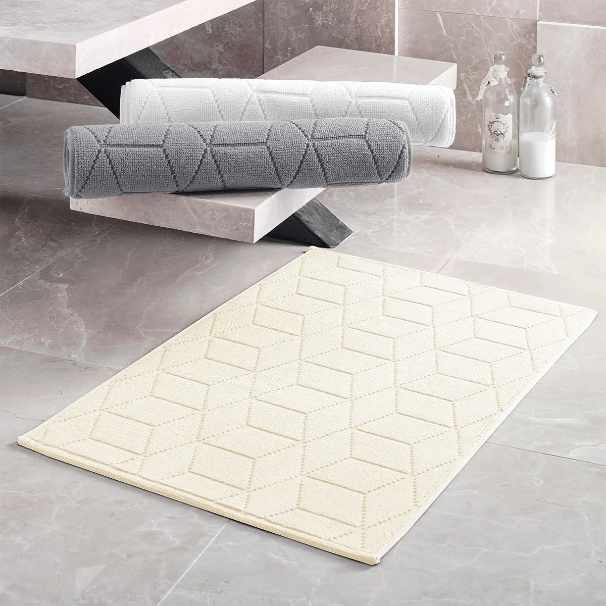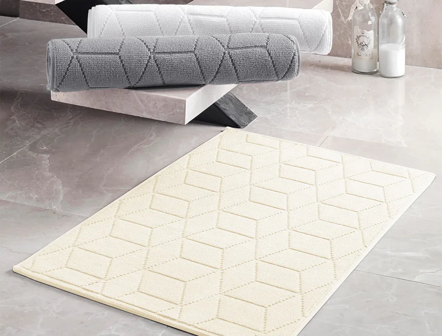 Nepostradatelný doplněk každé koupelny v provedení výběrové bavlny s vysokou gramáží, která zajistí nezaměnitelný komfort. Jednoduchý vytkávaný geometrický vzor na koupelnové předložce v kombinaci s dokonalým odstínem perlově krémové barvy zútulní vaši koupelnu.