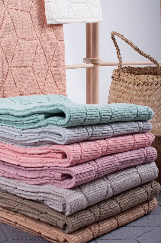 Nepostradatelný doplněk každé koupelny v provedení výběrové bavlny s vysokou gramáží, která zajistí nezaměnitelný komfort. Jednoduchý vytkávaný geometrický vzor na koupelnové předložce v kombinaci s dokonalým pastelovým odstínem růžové barvy zútulní vaši koupelnu.