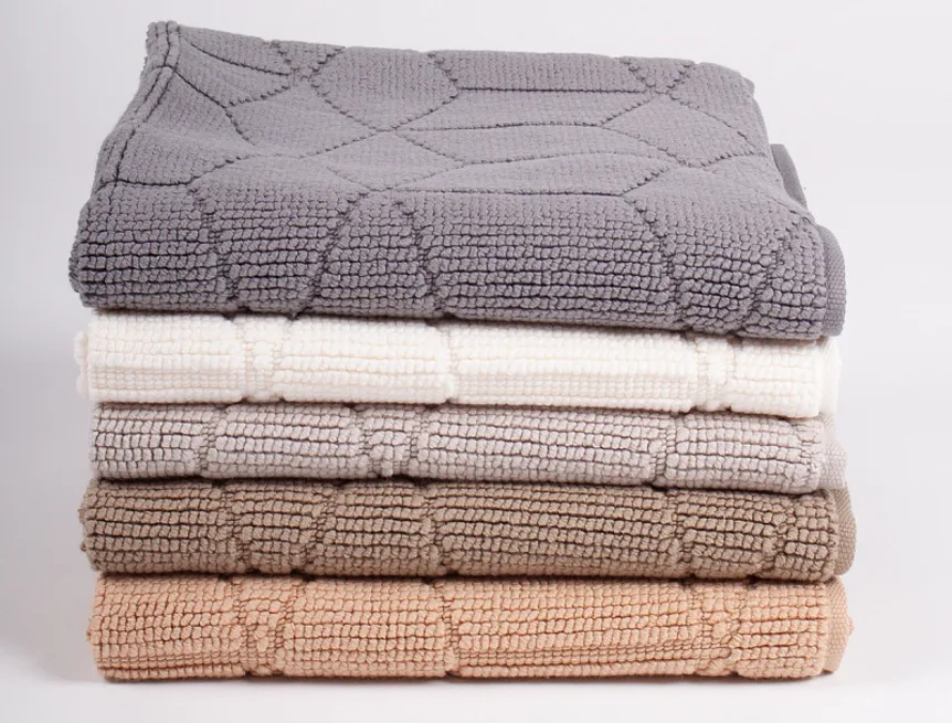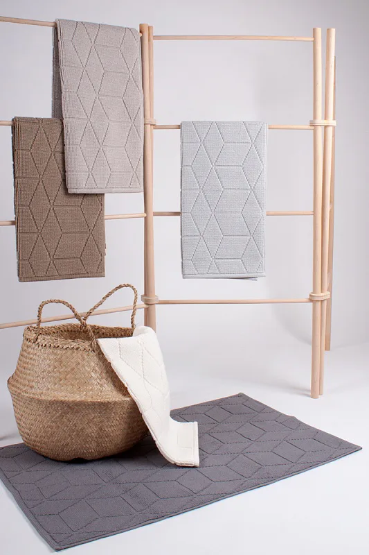 Nepostradatelný doplněk každé koupelny v provedení výběrové bavlny o vysoké gramáži, která zajistí nezaměnitelný komfort. Jednoduchý vytkávaný geometrický vzor na koupelnové předložce v kombinaci s decentním odstínem světle béžové barvy s lehkými šedými podtóny zútulní vaši koupelnu.