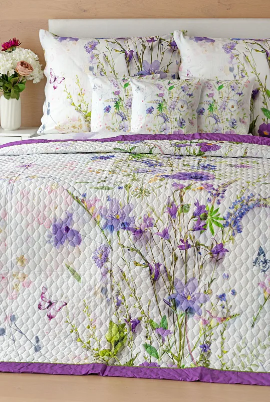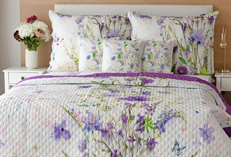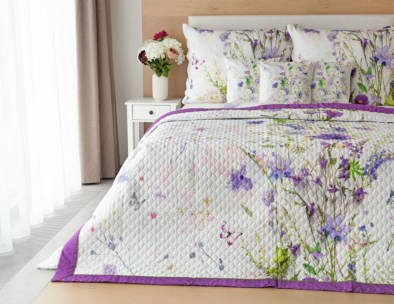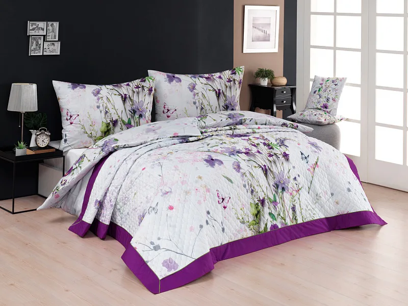 Barevné provedení: Atraktivní květinový vzor, který je z obou stran přehozu stejný. Okraje zdobí výrazné fialové lemování doplněné na vrchní straně sytě zelenou paspulí.