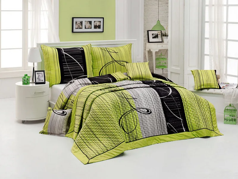 Přehoz ETERNITY GREEN je jedinečný, estetický a praktický doplněk, se kterým bude Vaše postel vždy dokonale ustlaná. Jako výplň je použito vrstvené duté vlákno, povrchový materiál je 100% bavlněná látka, ve stejném dezénu jako ložní povlečení. Po celé ploše je aplikováno ozdobné prošití, tak aby se zajistila stabilita výplně a současně podtrhl celkový vzhled přehozu.
