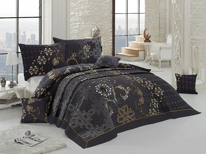 Přehoz GOLD je jedinečný, estetický a praktický doplněk, se kterým bude Vaše postel vždy dokonale ustlaná. Jako výplň je použito vrstvené duté vlákno, povrchový materiál je 100 % bavlněná látka, ve stejném dezénu jako ložní povlečení. Po celé ploše je aplikováno ozdobné prošití, tak aby se zajistila stabilita výplně a současně podtrhl celkový vzhled přehozu. Ozdobná paspule přehozu je provedena v ladící šedé barvě.