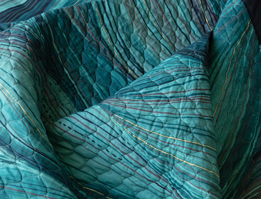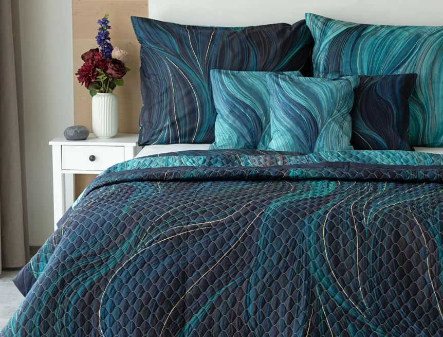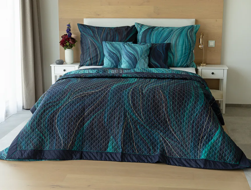 Barevné provedení: Abstraktní vzor s prvky ruční malby, který je z každé strany přehozu jinak barevný. Vrchní straně dominuje zářivá petrolejová barva, spodní strana je laděná do tmavých tónů. Okraje zdobí temně modré lemování doplněné na vrchní straně petrolejovou paspulí.