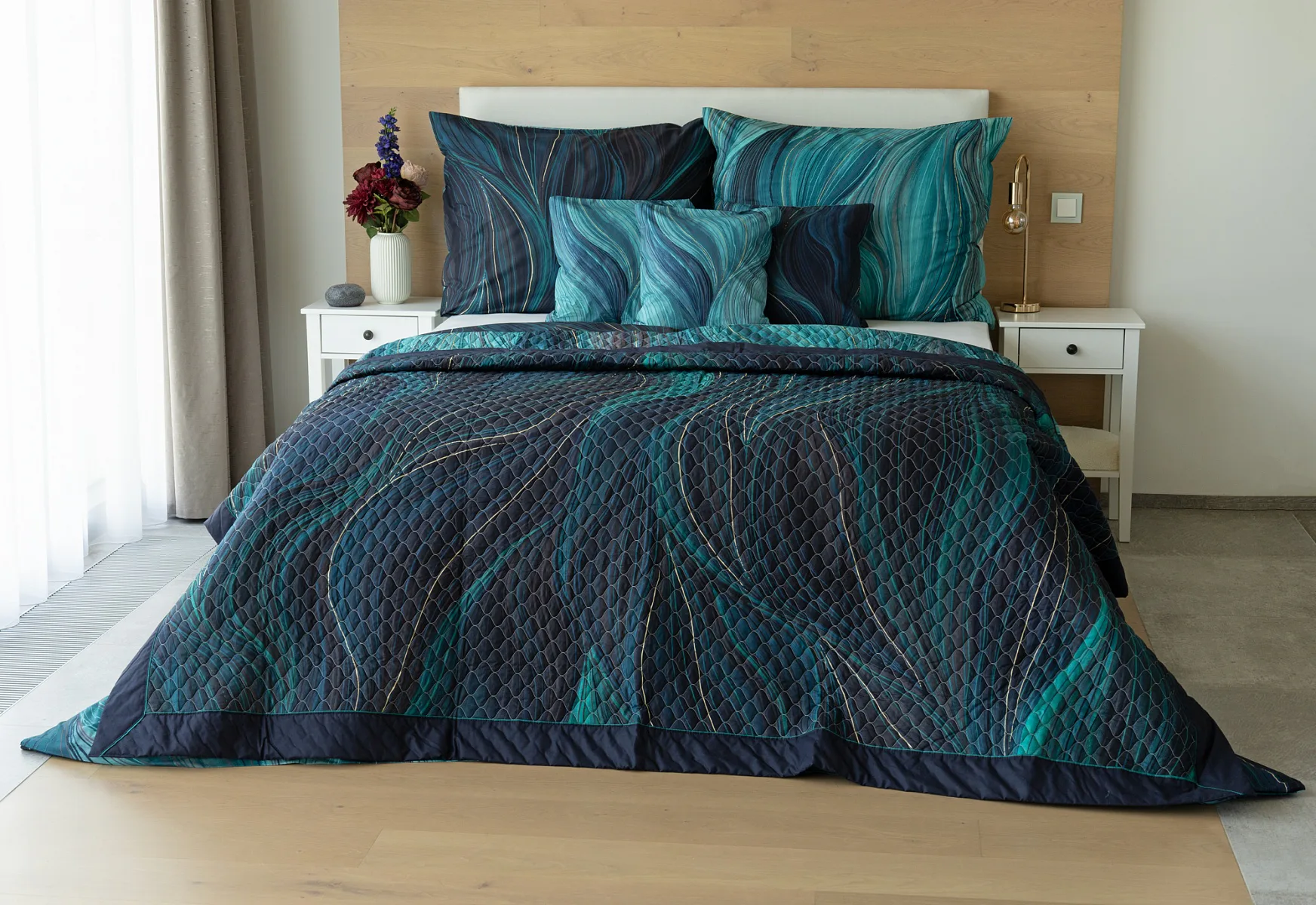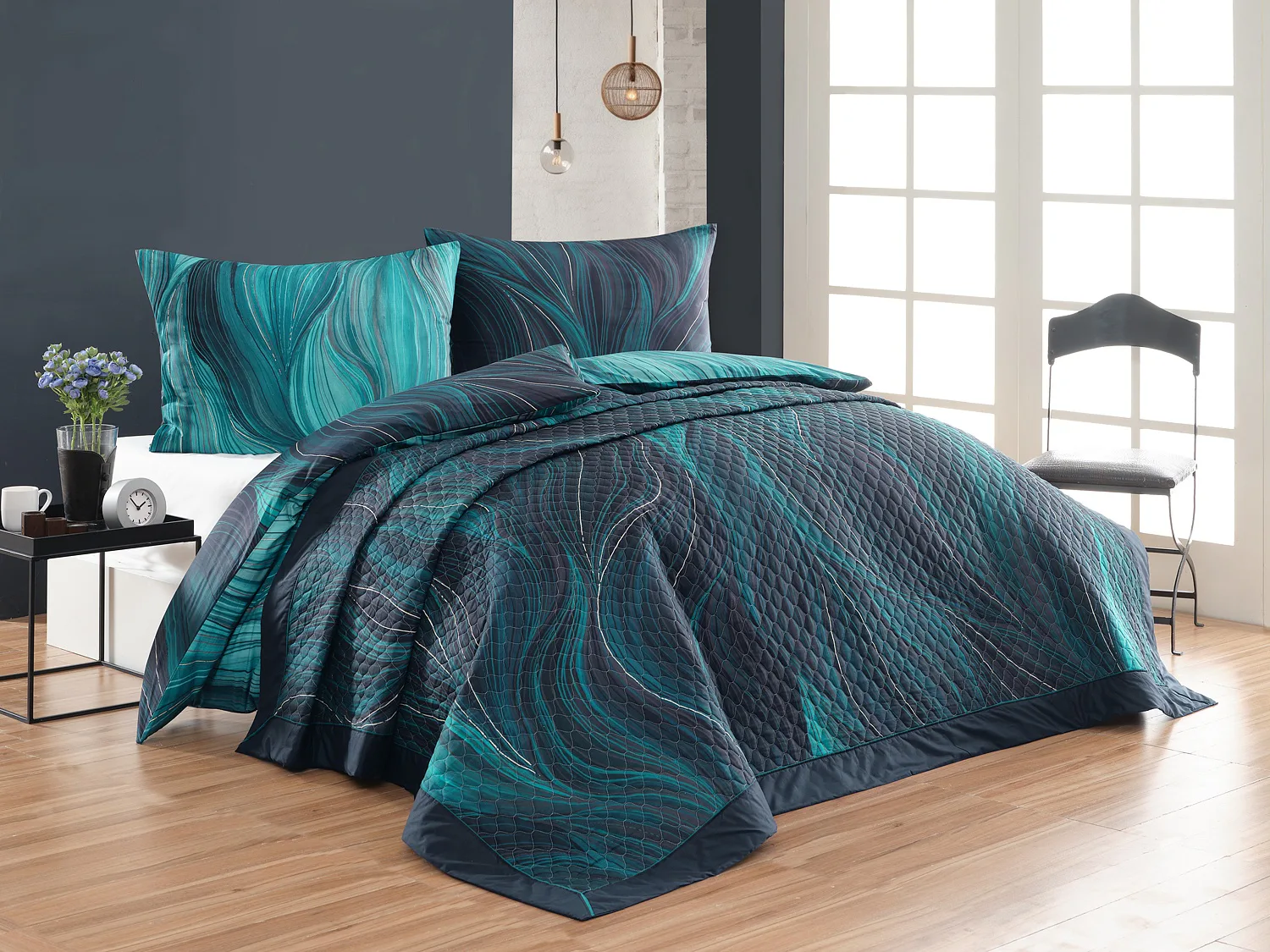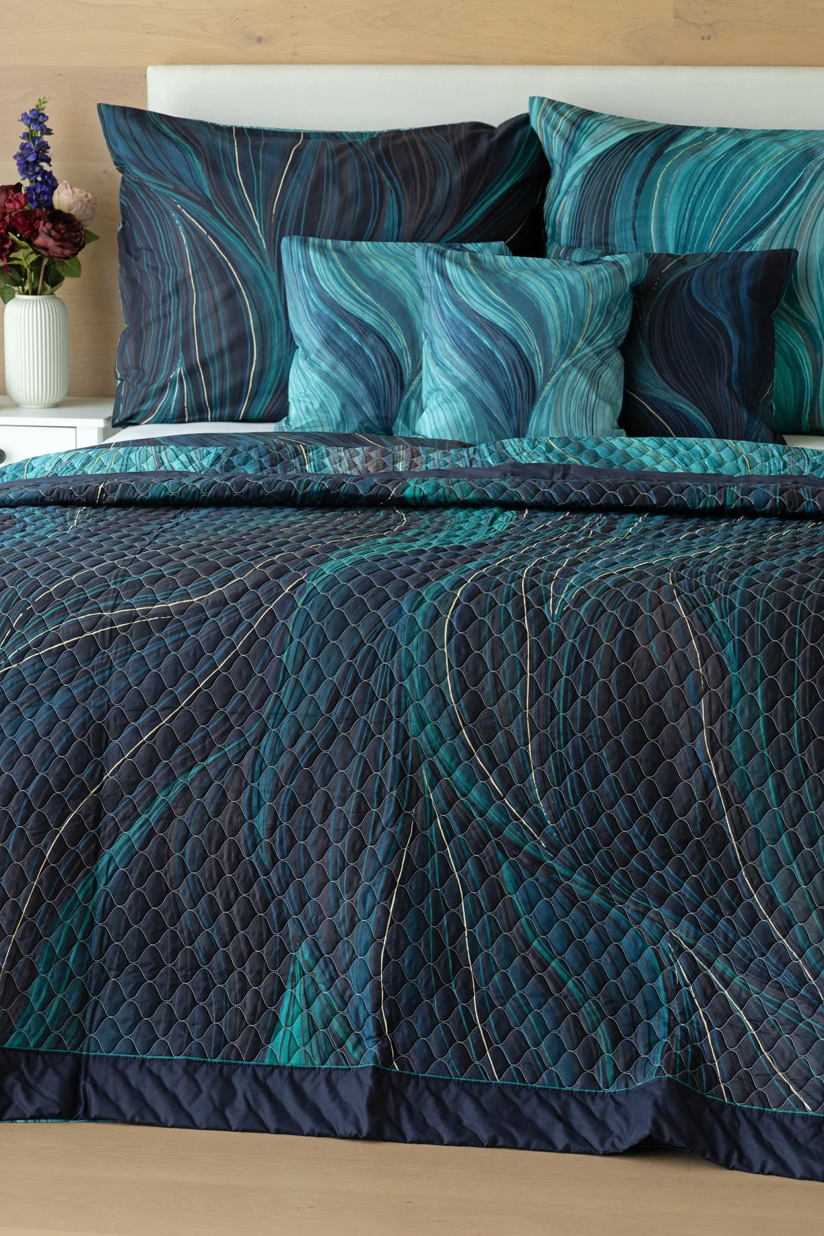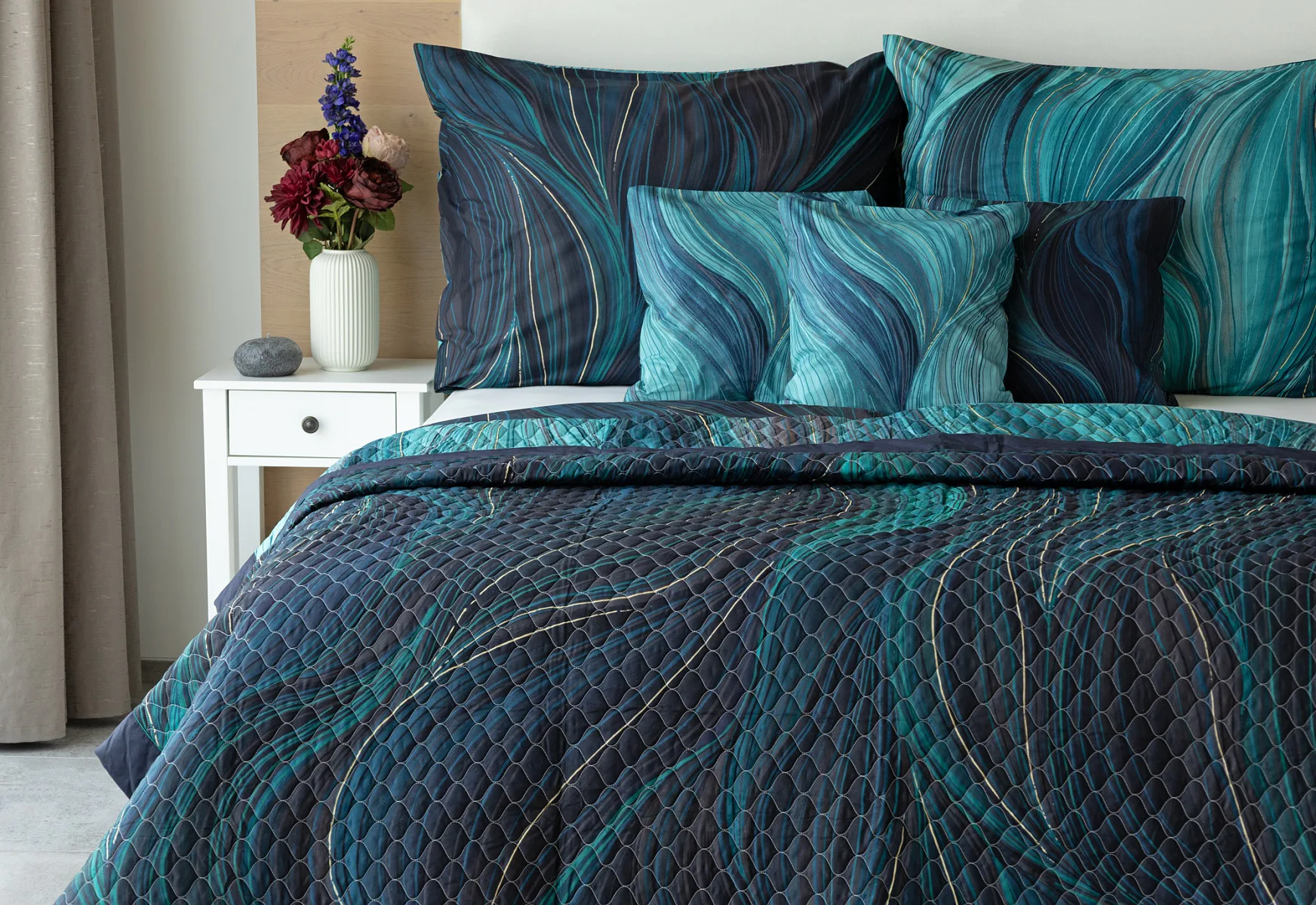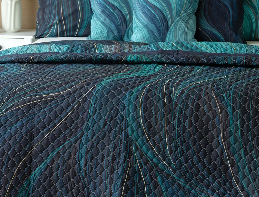 Přehoz Infinitum Petrol je jedinečný estetický a praktický doplněk, se kterým bude vaše postel vždy dokonale ustlaná. Jako výplň je použito vrstvené duté vlákno se sníženou gramáží. Povrchový materiál tvoří 100% bavlněná látka ve stejném dezénu jako ložní povlečení. Po celé ploše je aplikováno ozdobné prošití, aby se zajistila stabilita výplně a současně podtrhl celkový vzhled přehozu.