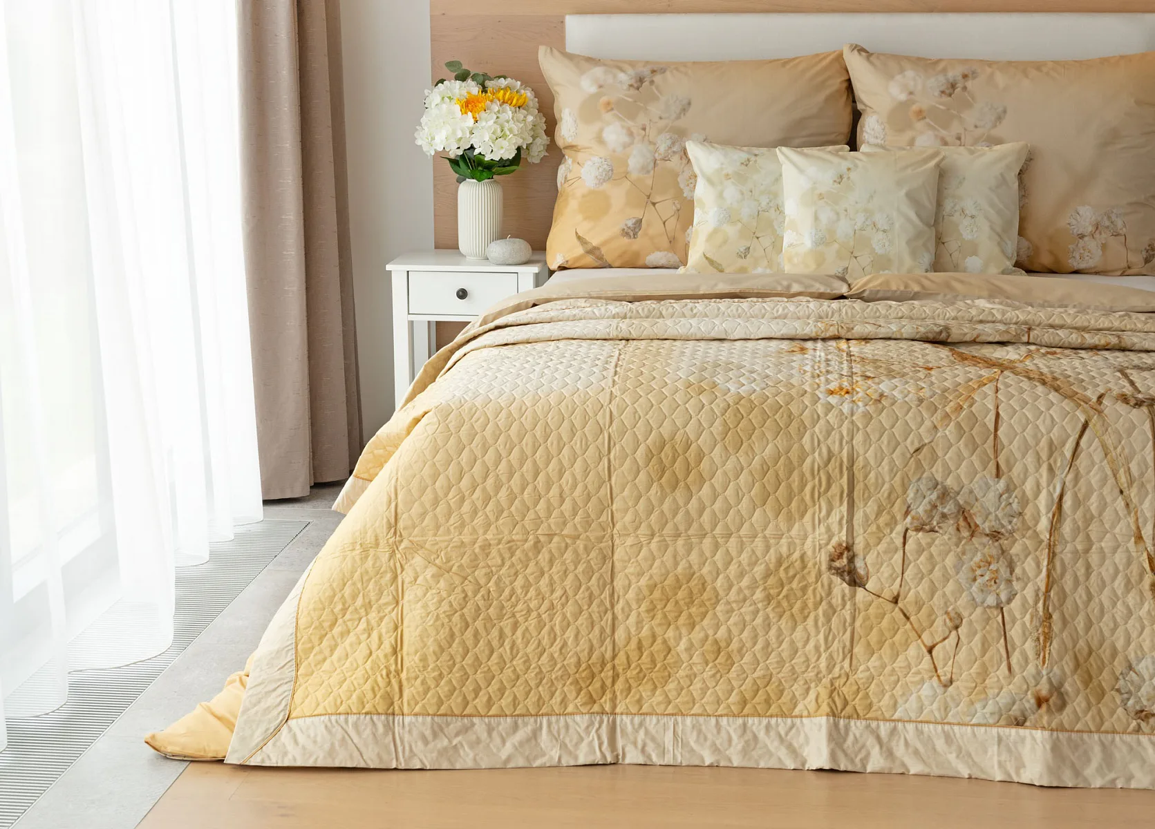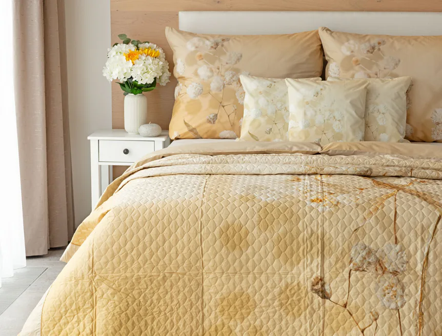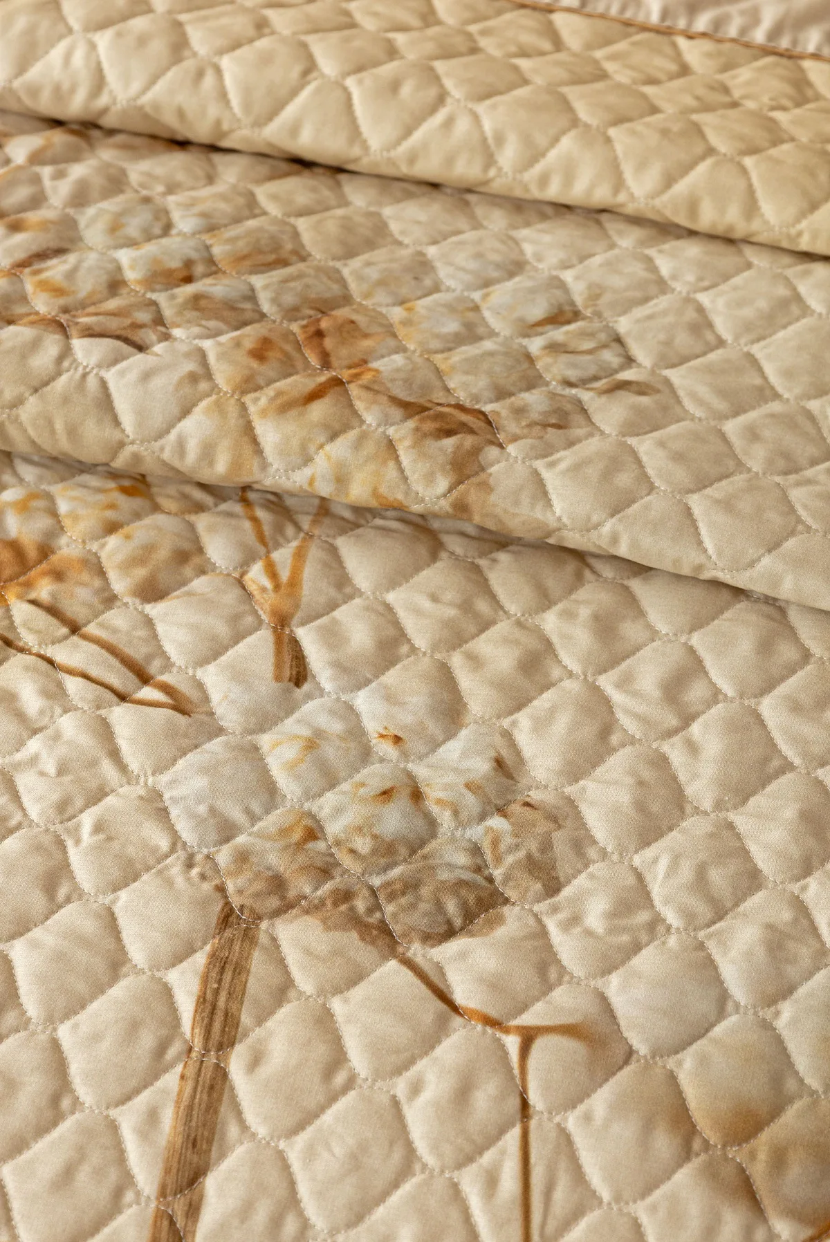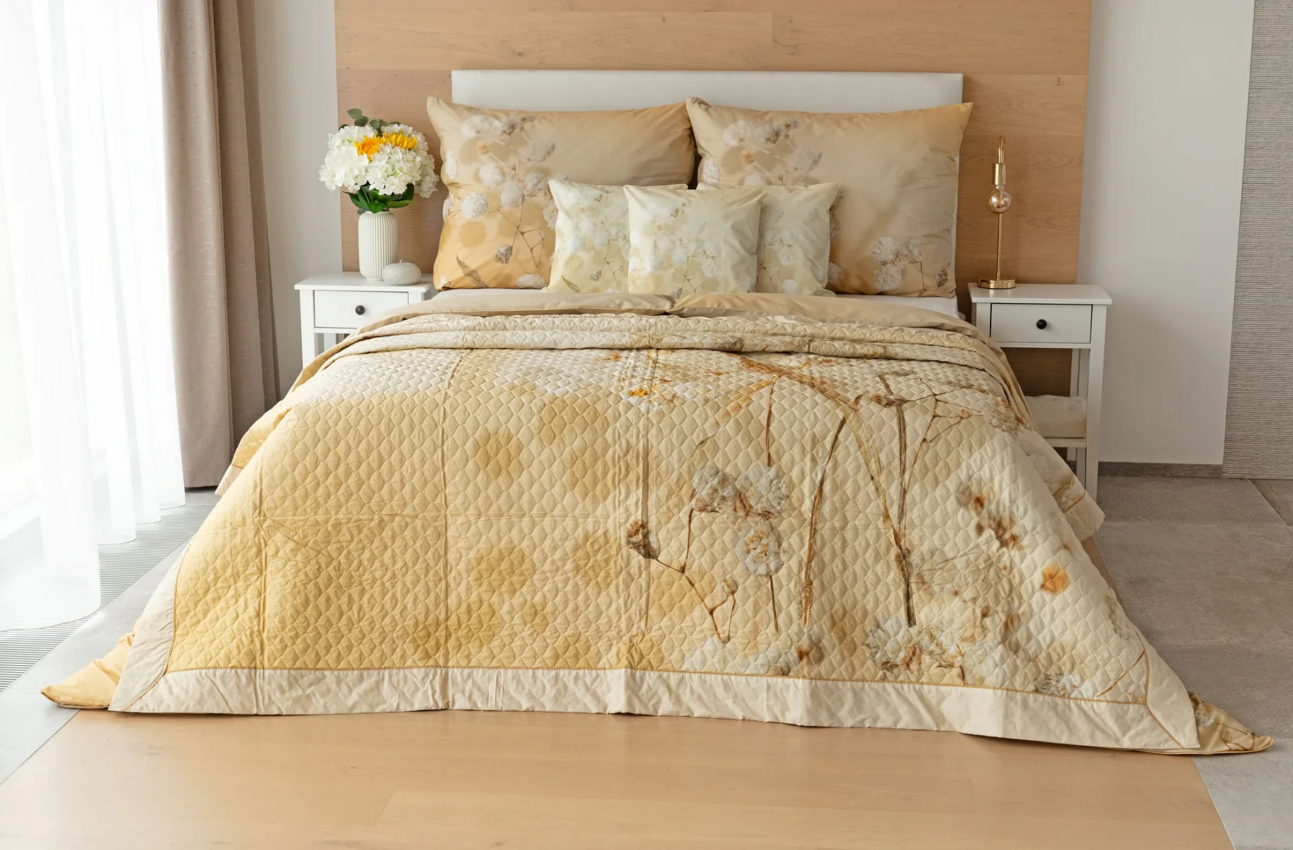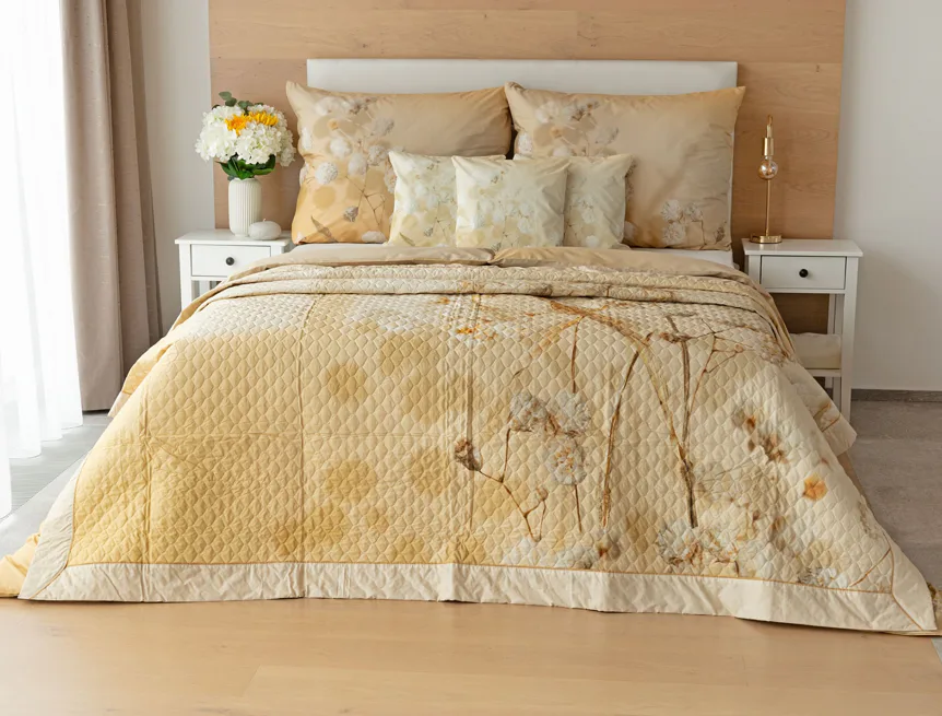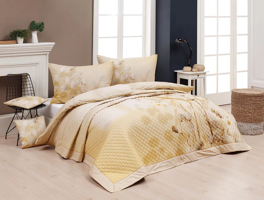 Přehoz Julia je jedinečný estetický a praktický doplněk, se kterým bude vaše postel vždy dokonale ustlaná. Jako výplň je použito vrstvené duté vlákno se sníženou gramáží. Povrchový materiál tvoří 100% bavlněná látka ve stejném dezénu jako ložní povlečení. Po celé ploše je aplikováno ozdobné prošití, aby se zajistila stabilita výplně a současně podtrhl celkový vzhled přehozu.