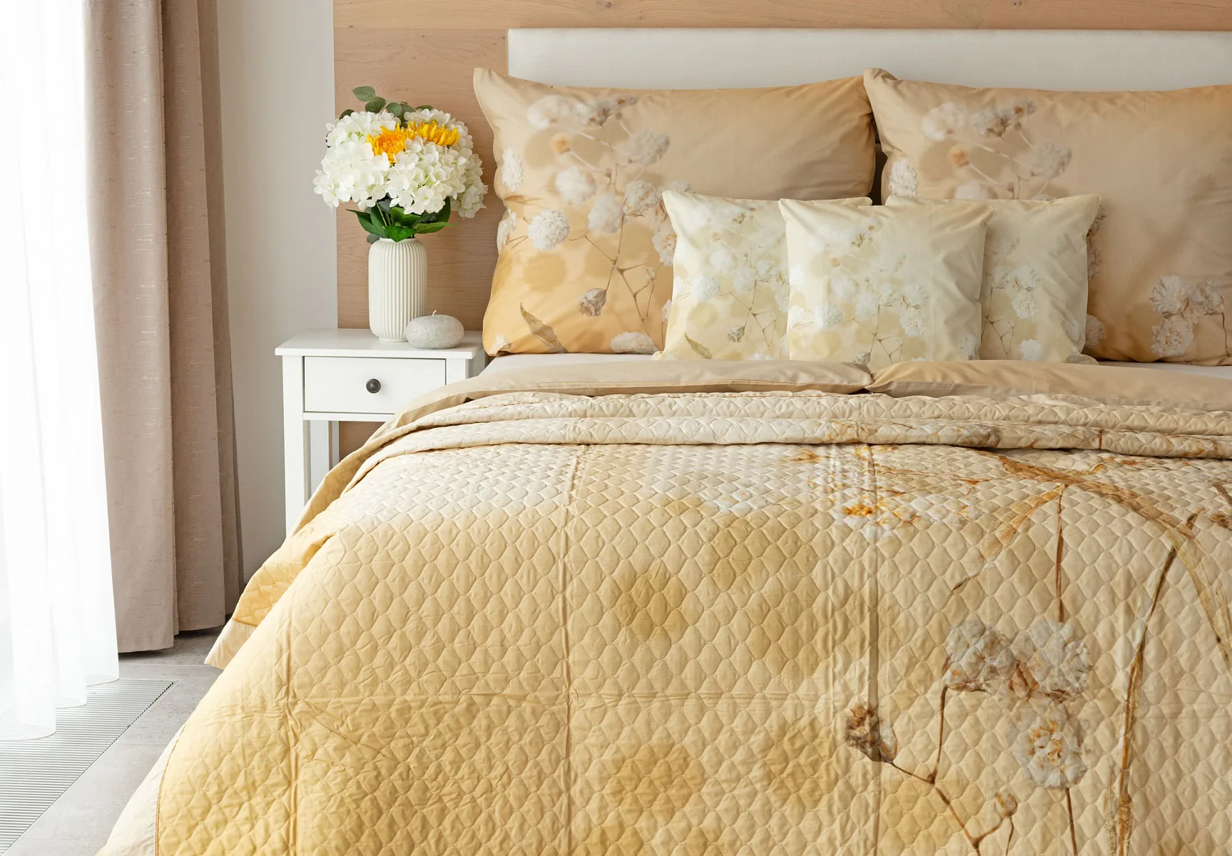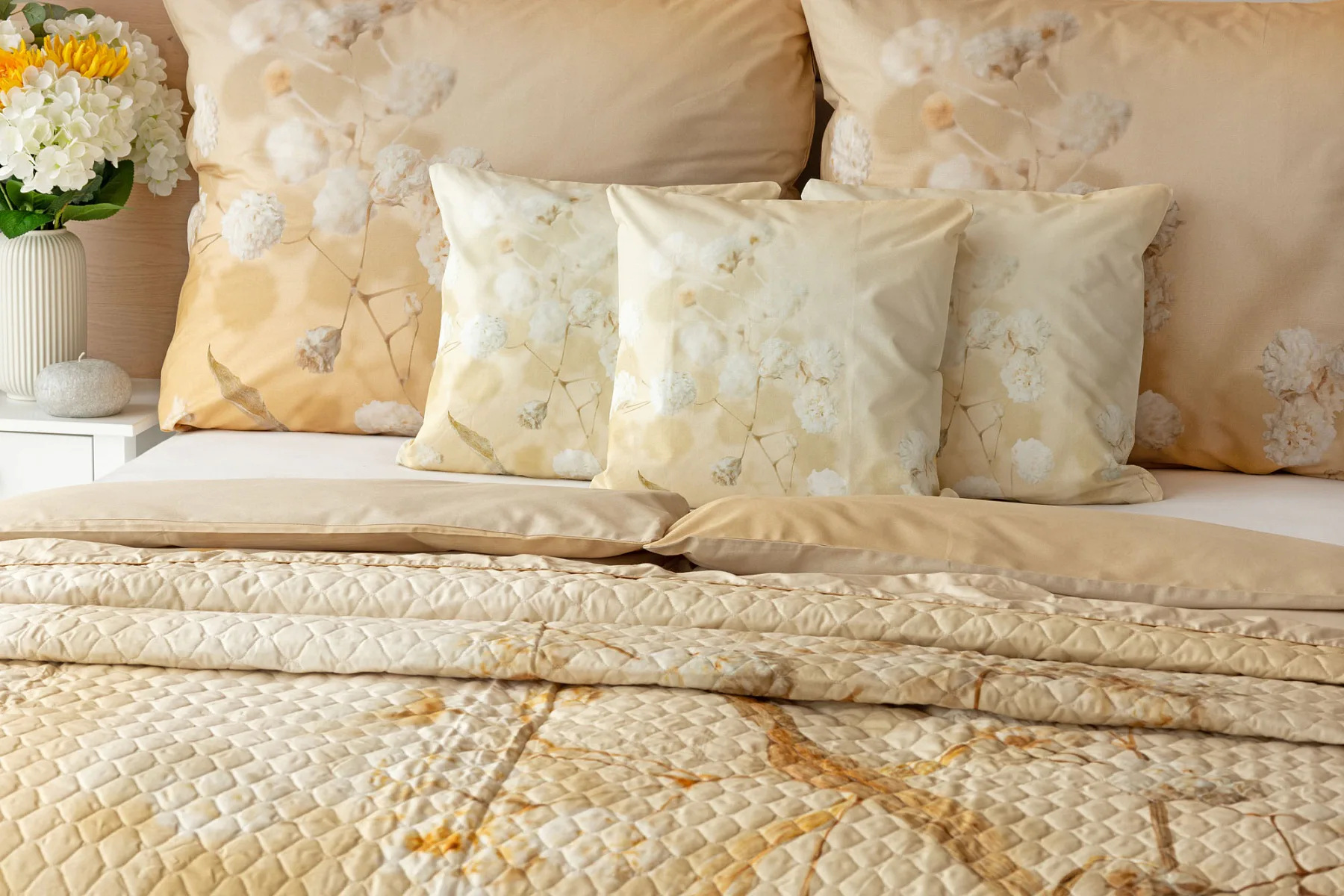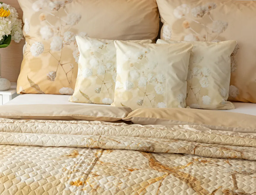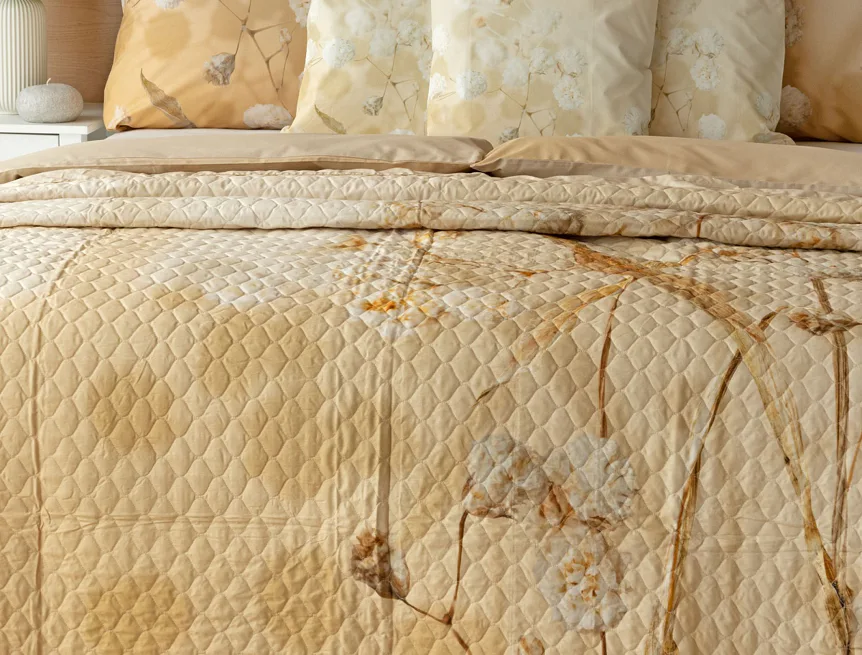 Barevné provedení: Jemný květinový vzor, který je z obou stran přehozu stejný. Okraje zdobí barevně sladěné krémové lemování doplněné na vrchní straně světle hnědou paspulí.