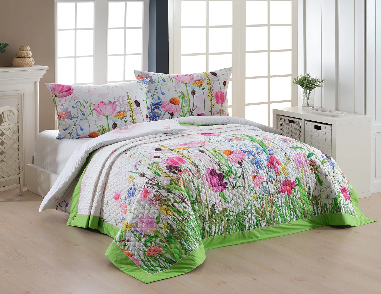 Barevné provedení: Atraktivní květinový vzor, který je z obou stran přehozu stejný. Okraje zdobí zelené lemování doplněné na vrchní straně světle růžovou paspulí.