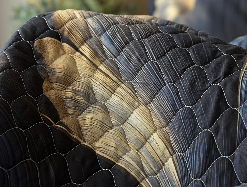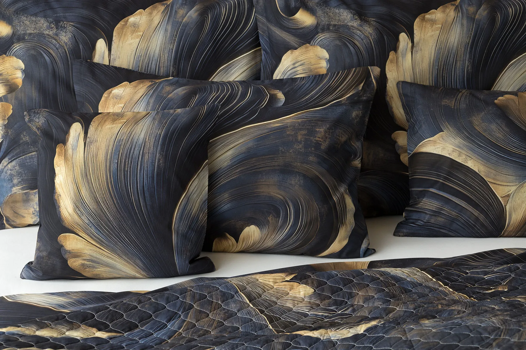 Barevné provedení: Abstraktní motiv ve tvaru lyry v paletě tmavě modrých a pískových tónů, který je z obou stran přehozu stejný. Okraje zdobí černé lemování doplněné na vrchní straně paspulí v pískové barvě.