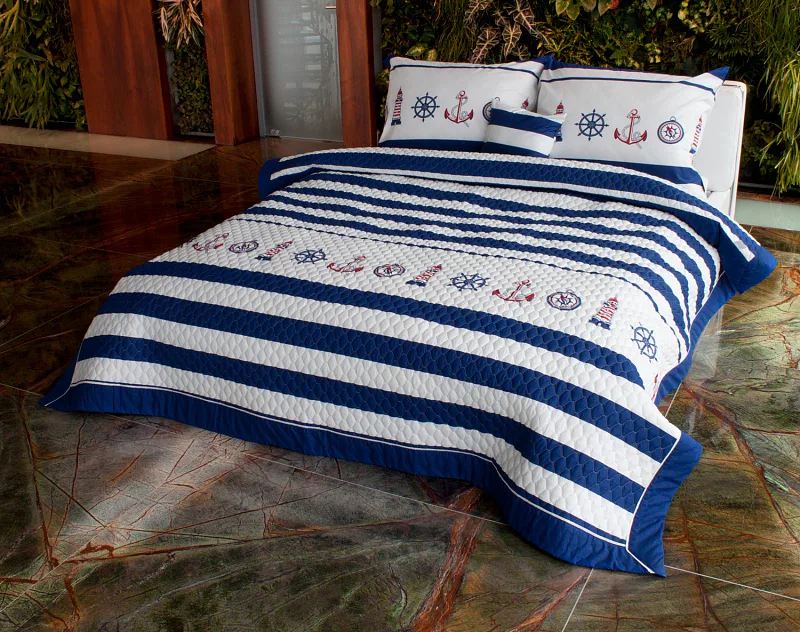 Přehoz přes postel MARINE je jedinečný, estetický a praktický doplněk, se kterým bude Vaše postel vždy dokonale ustlaná. Jako výplň je použito vrstvené duté vlákno, povrchový materiál je 100% bavlněná látka, ve stejném dezénu jako ložní povlečení. Po celé ploše je aplikováno ozdobné prošití, tak aby se zajistila stabilita výplně a současně podtrhl celkový vzhled přehozu.
