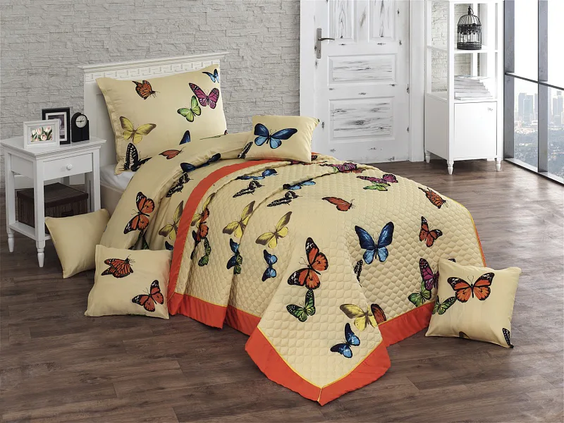Přehoz MOTÝLI je jedinečný, estetický a praktický doplněk, se kterým bude Vaše postel vždy dokonale ustlaná. Jako výplň je použito vrstvené duté vlákno, potvrchový materiál je 100% bavlněná látka, ve stejném dezénu jako ložní povlečení. Po celé ploše je aplikováno ozdobné prošití tak, aby se zajistila stabilita výplně a současně podtrhl celkový vzhled přehozu.