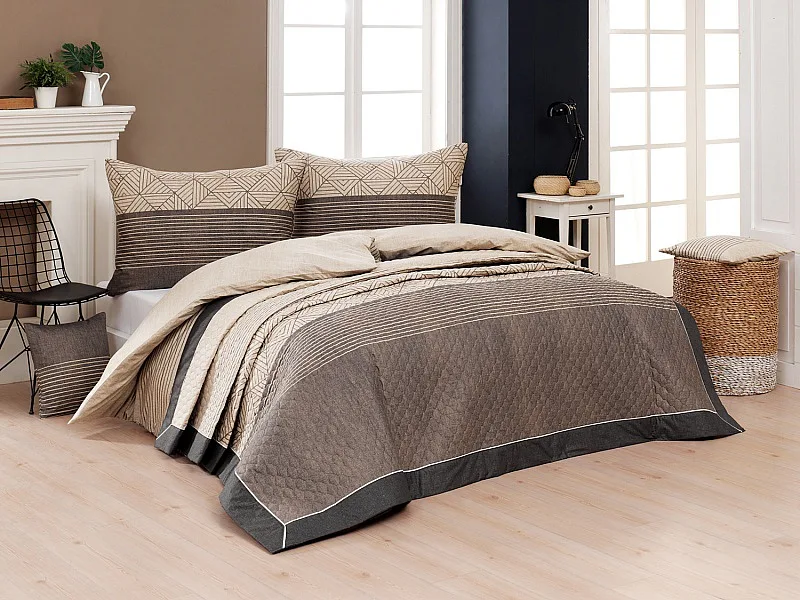 Barevné provedení: Působivý geometrický vzor s rustikální strukturou, který je z obou stran přehozu stejný. Okraje zdobí tmavě šedé lemování doplněné na vrchní straně bílou paspulí.