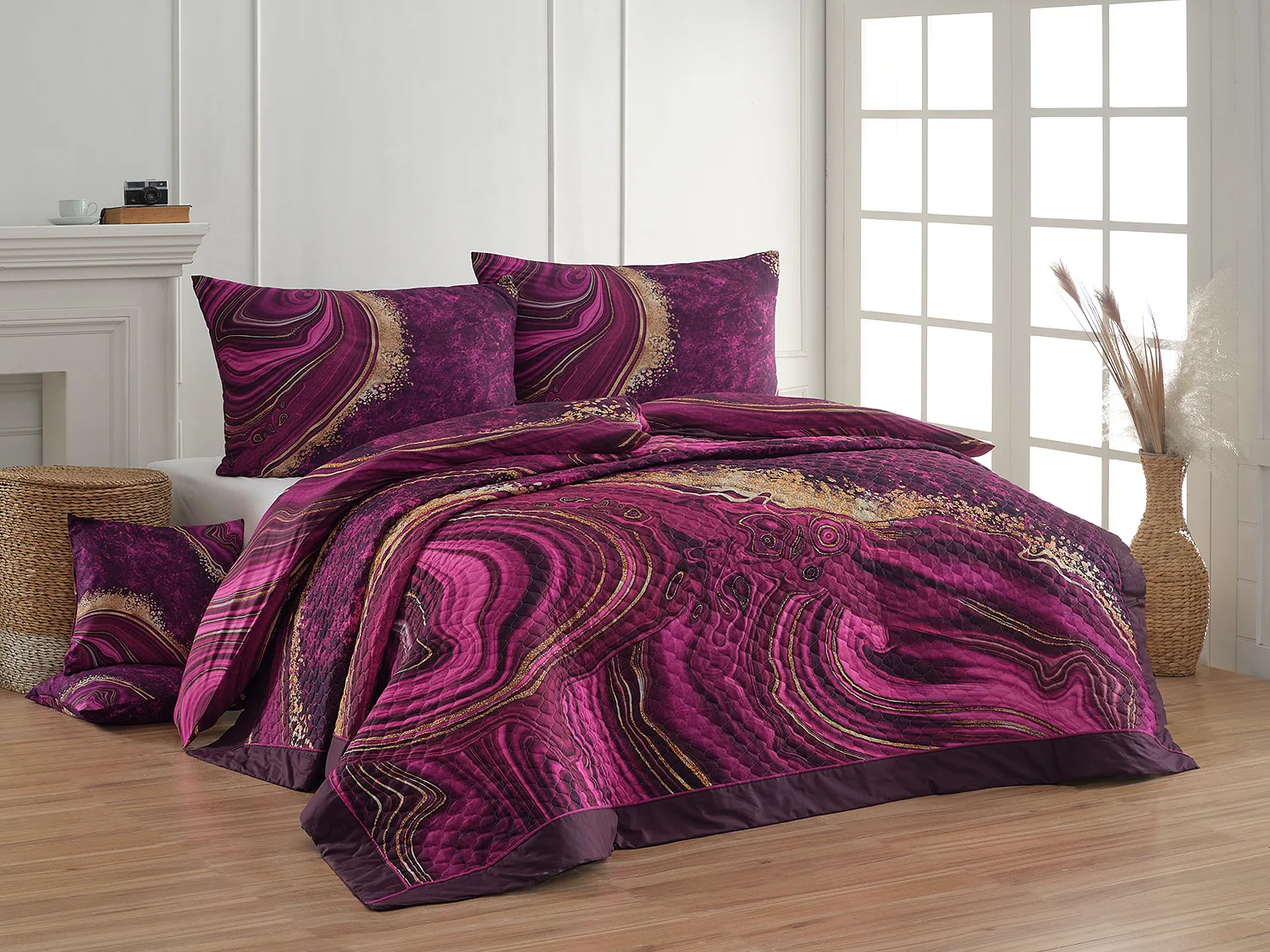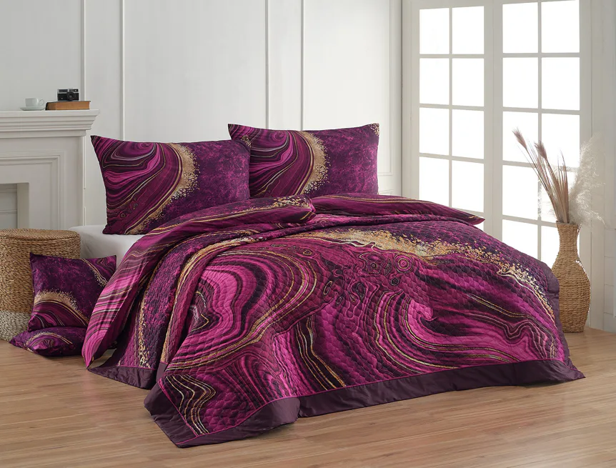 Barevné provedení: Abstraktní vzor v paletě malinových a fuchsiových tónů se zlatavými prvky, který je z obou stran přehozu stejný. Okraje zdobí temně fialové lemování doplněné na vrchní straně výraznou fuchsiovou paspulí.