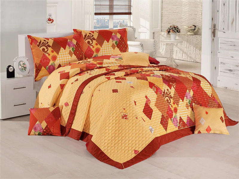 Přehoz VALENCIA ORANGE je jedinečný, estetický a praktický doplněk, se kterým bude Vaše postel vždy dokonale ustlaná. Jako výplň je použito vrstvené duté vlákno, povrchový materiál je 100% bavlněná látka, ve stejném dezénu jako ložní povlečení. Po celé ploše je aplikováno ozdobné prošití tak, aby se zajistila stabilita výplně a současně podtrhl celkový vzhled přehozu.