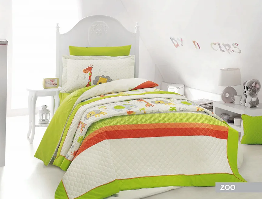 Přehoz na jednolůžko v moderním zářivě barevném designu s motivem kreslených zvířátek. Přední strana přehozu je ohraničena barevnými pruhy - prostřední část pak tvoří zástupy zvířat. Spodní strana přehozu je provedena ve stejné zelené barvě jako lem.
