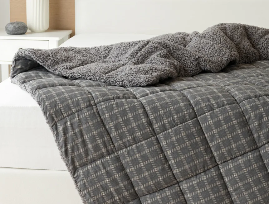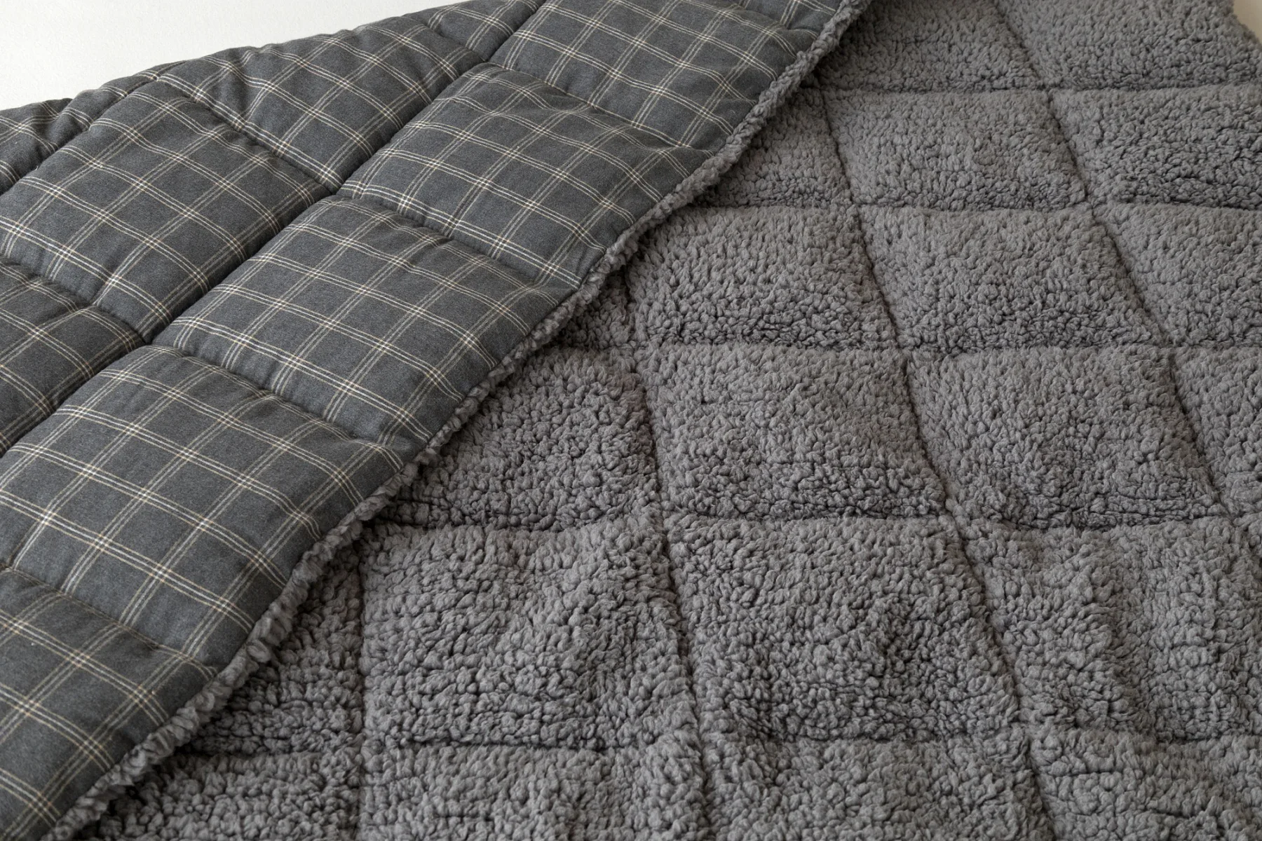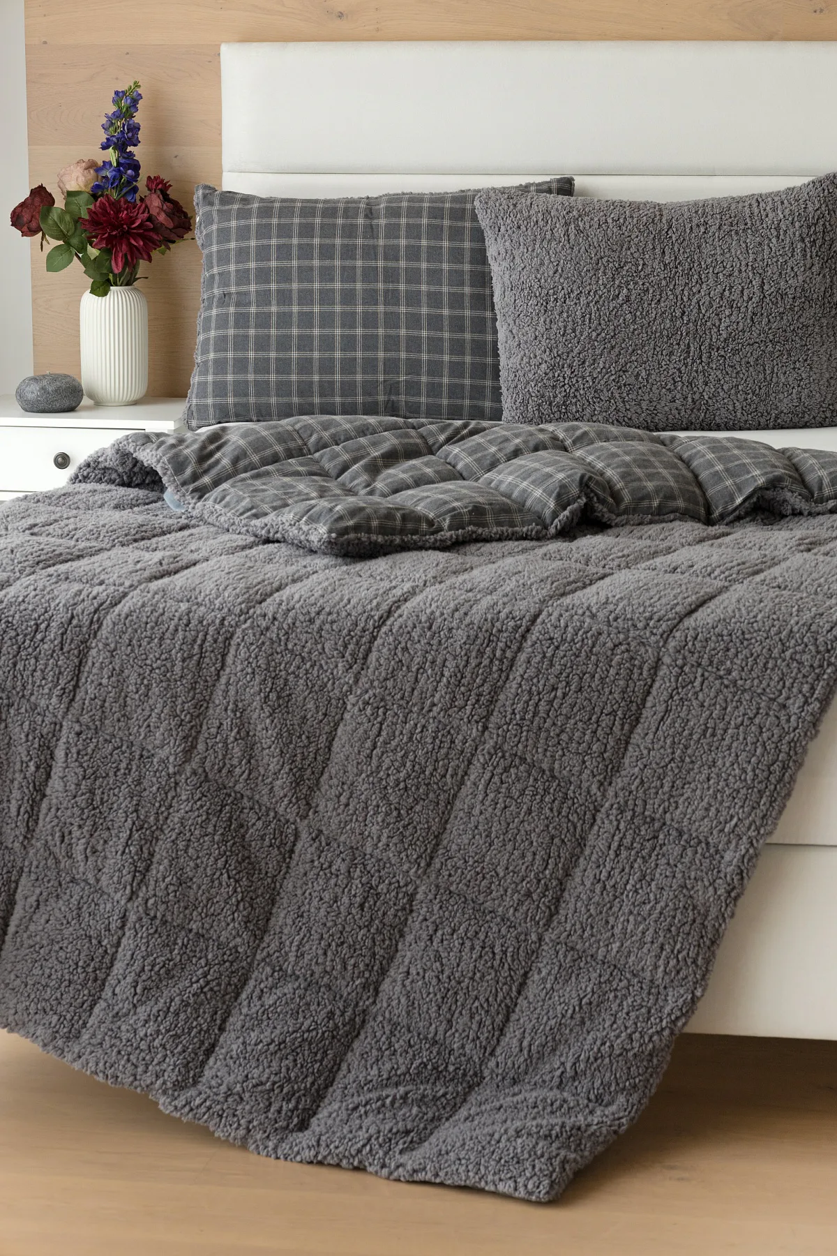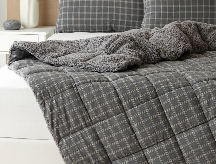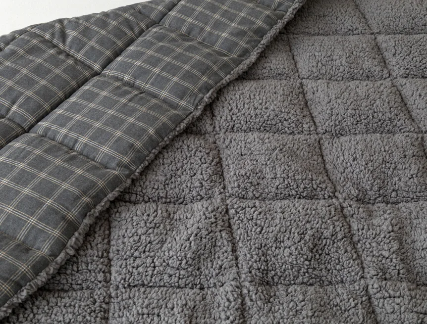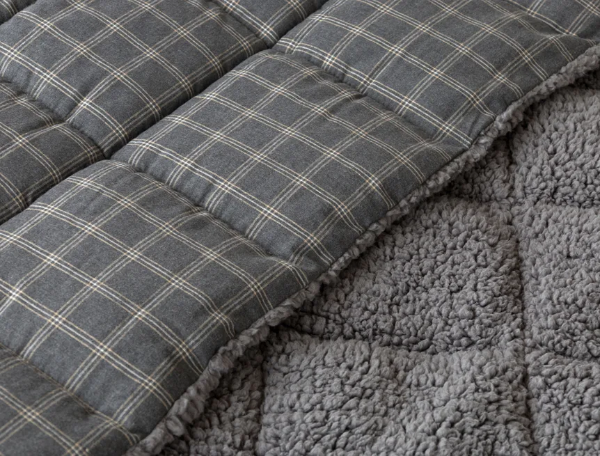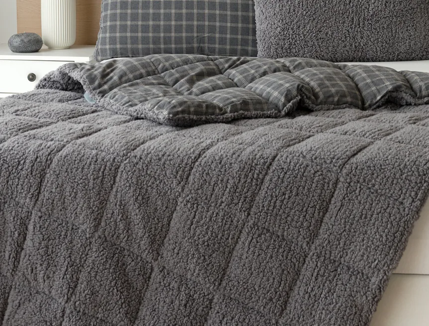 Nová kolekce prošívaných flanelových přikrývek s beránkem vám zajistí jedinečný tepelný komfort a úžasné pohodlí během sychravých dnů, chladných večerů a zimních nocí. Vrchní stranu prošívané deky tvoří hebký flanel s jemným chloupkem, spodní stranu pokrývá hřejivý nadýchaný beránek. Vnitřní výplň s plošnou gramáží 250 g/m2 tvoří mikrogelové polyesterové nano vlákno, které je prodyšné, lehké a nesléhá. Stabilitu výplně zajišťuje precizní prošití po celé ploše.