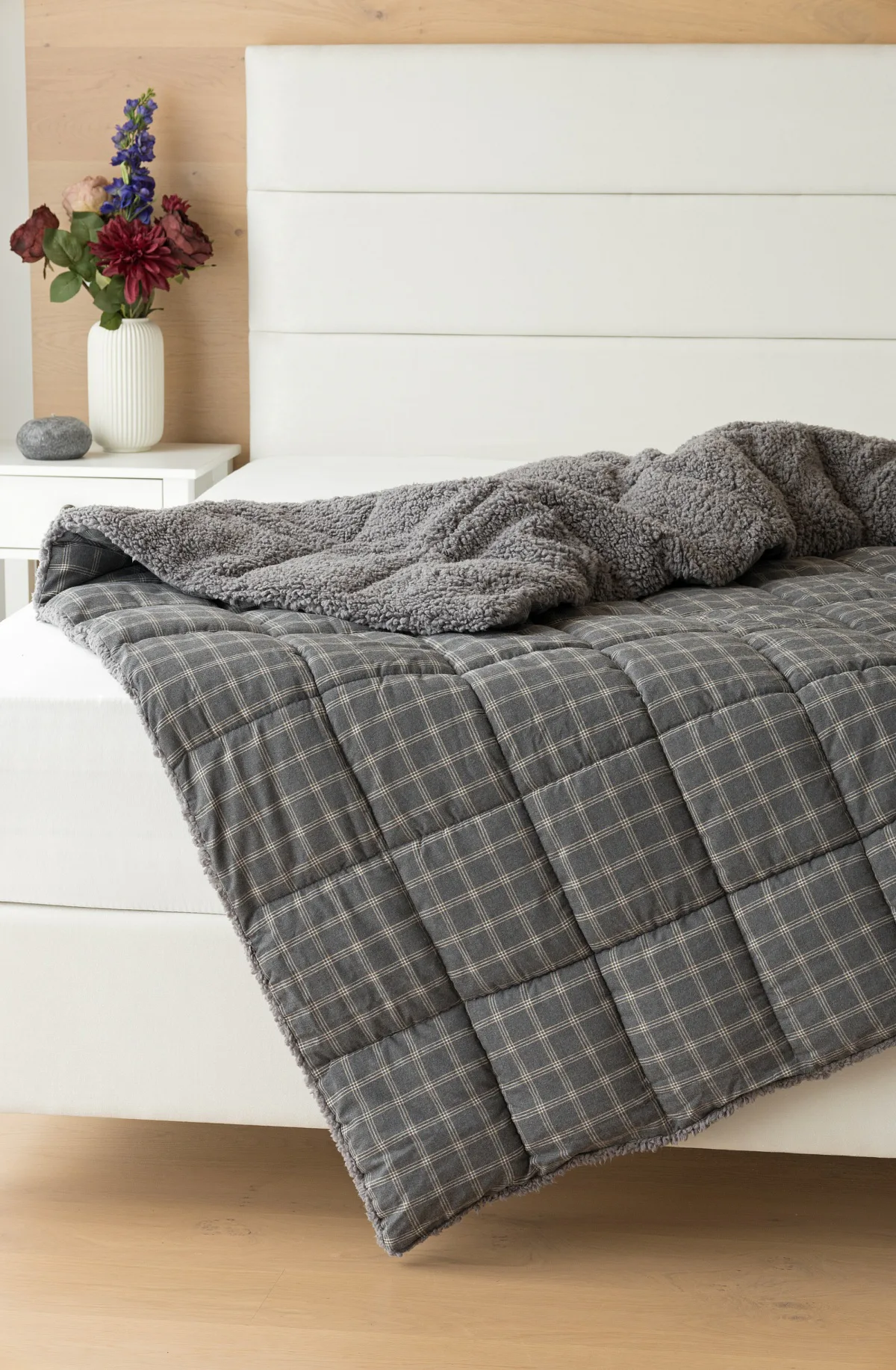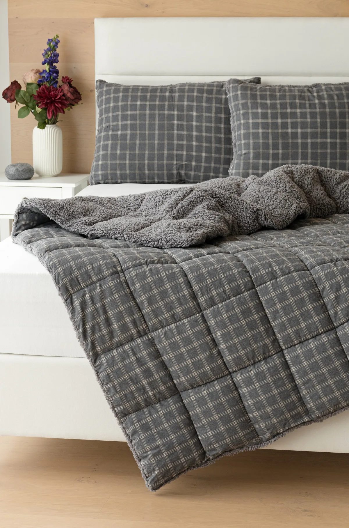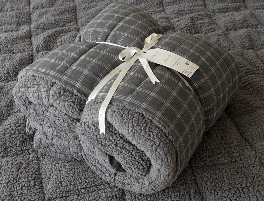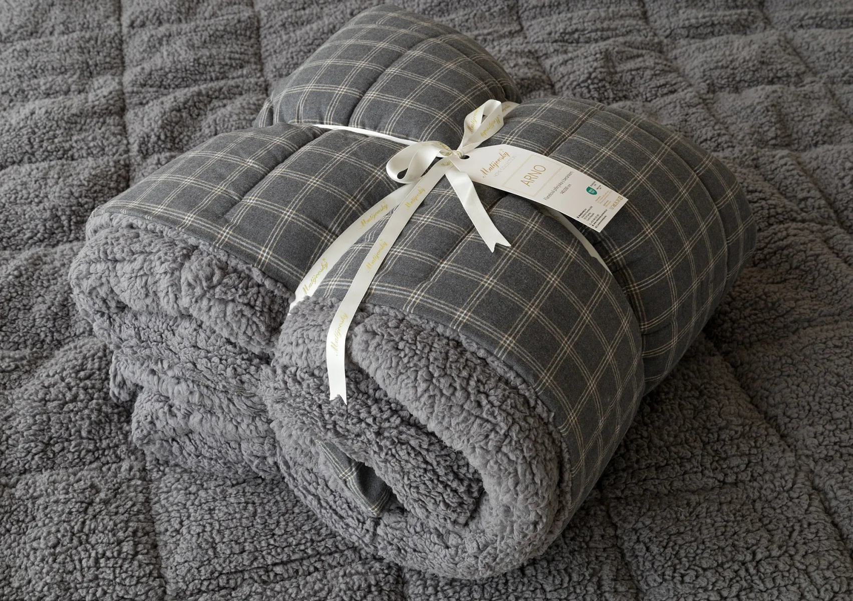 Elegantní vzor Arno s jemnou krémovou kostkou na antracitově šedém podkladu doplňuje barevně sladěný beránek v tmavě šedém odstínu. K přikrývce lze dokoupit také polštář ve stejném designu.