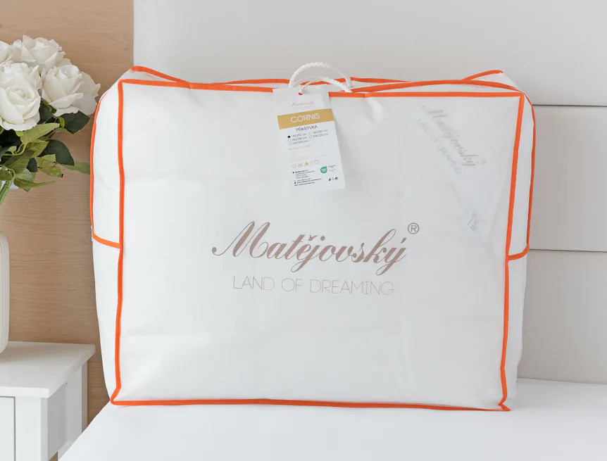Přikrývky a polštáře Cornis jsou vyplněny pečlivě vyváženou kombinací 50 % vlákna INGEOTM a 50 % silikonizovaného dutého vlákna, která spojuje to nejlepší z přírodních i moderních materiálů. Výsledkem je výplň, která je lehká, prodyšná, tvarově stálá a zároveň mimořádně příjemná na dotek.