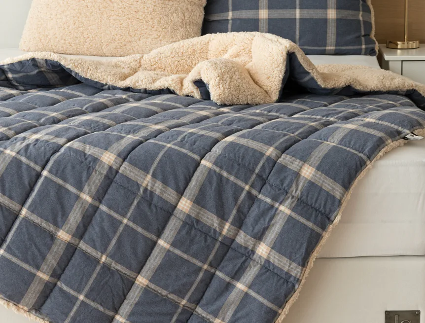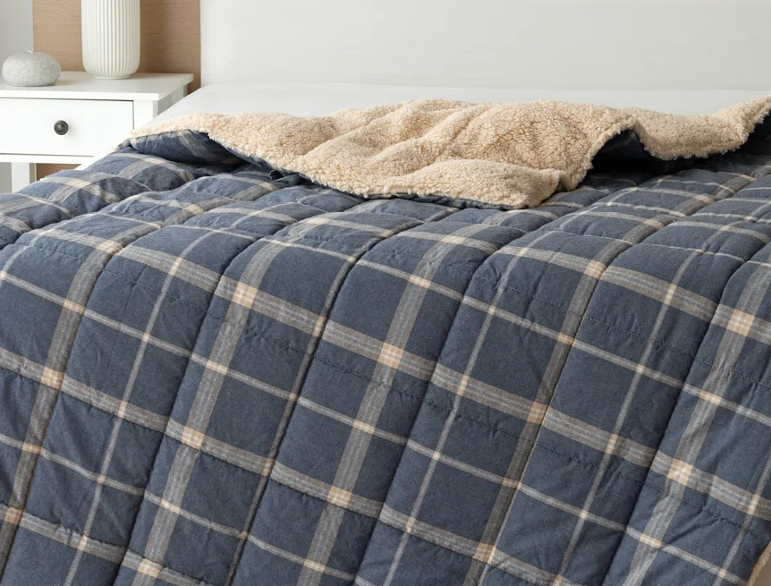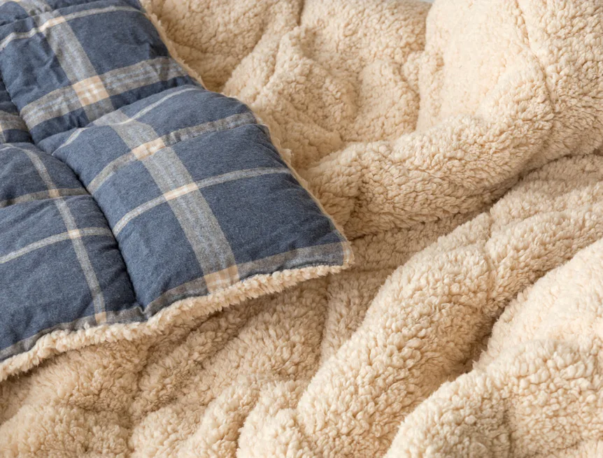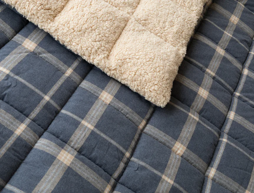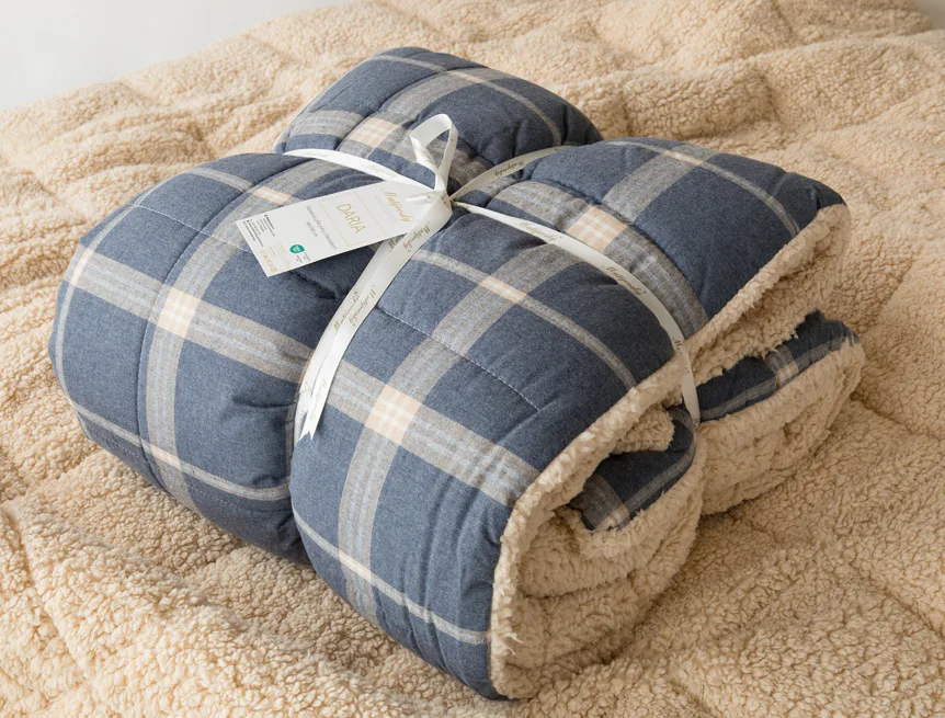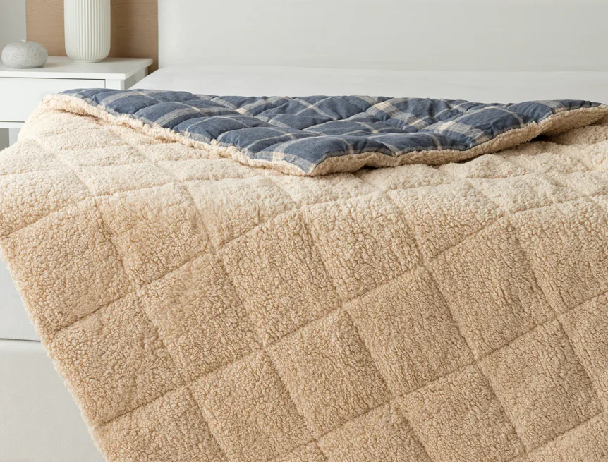 Nová kolekcia prešívaných flanelových prikrývok s baránkom vám zaistí jedinečný tepelný komfort a úžasné pohodlie behom sychravých dní, chladných večerov a zimných nocí. Vrchnú stranu prešívanej deky tvorí hebký flanel s jemným chlpom, spodnú stranu pokrýva hrejivý nadýchaný baránok. Vnútornú výplň s plošnou gramážou 250 g/m2 tvorí mikrogelové polyesterové nano vlákno, ktoré je priedušné a ľahké. Stabilitu výplne zaisťuje precízne prešitie po celej ploche.