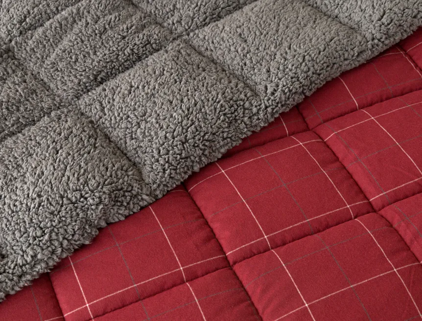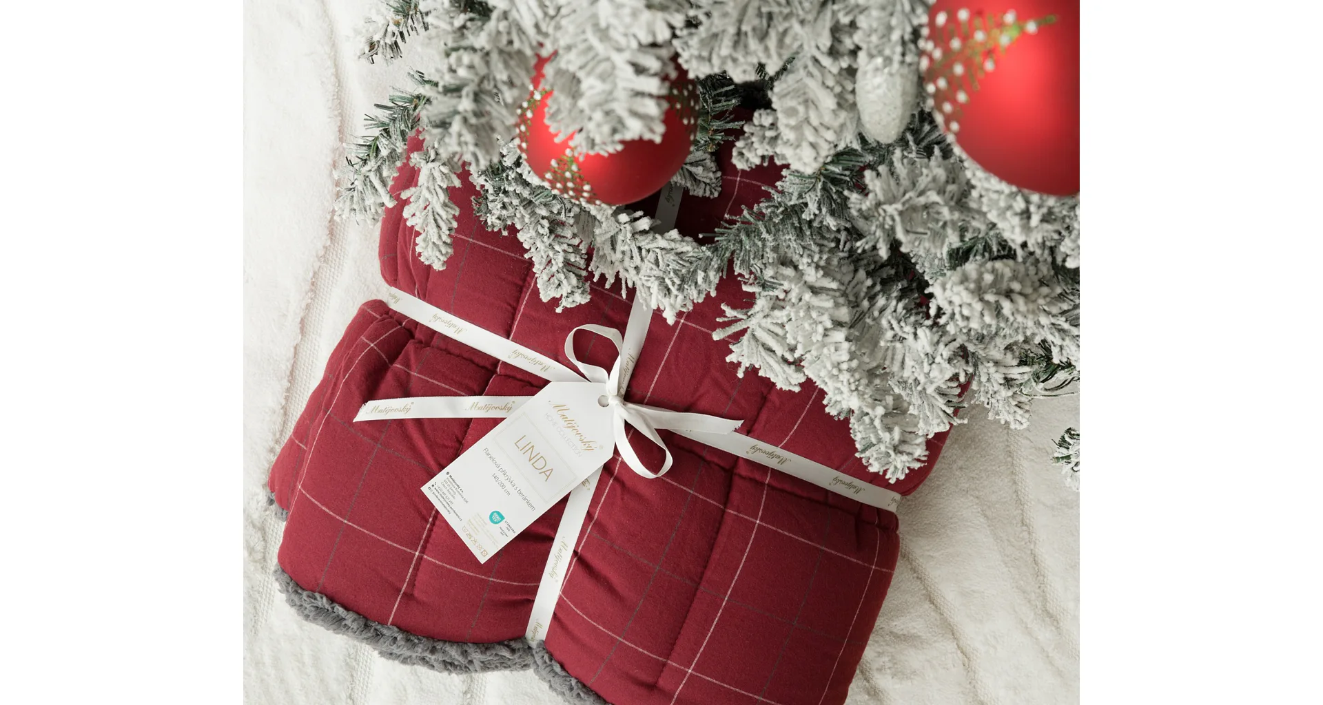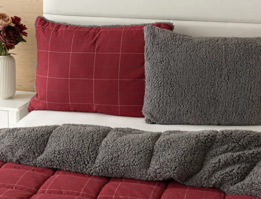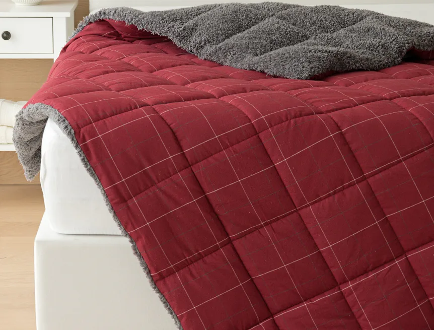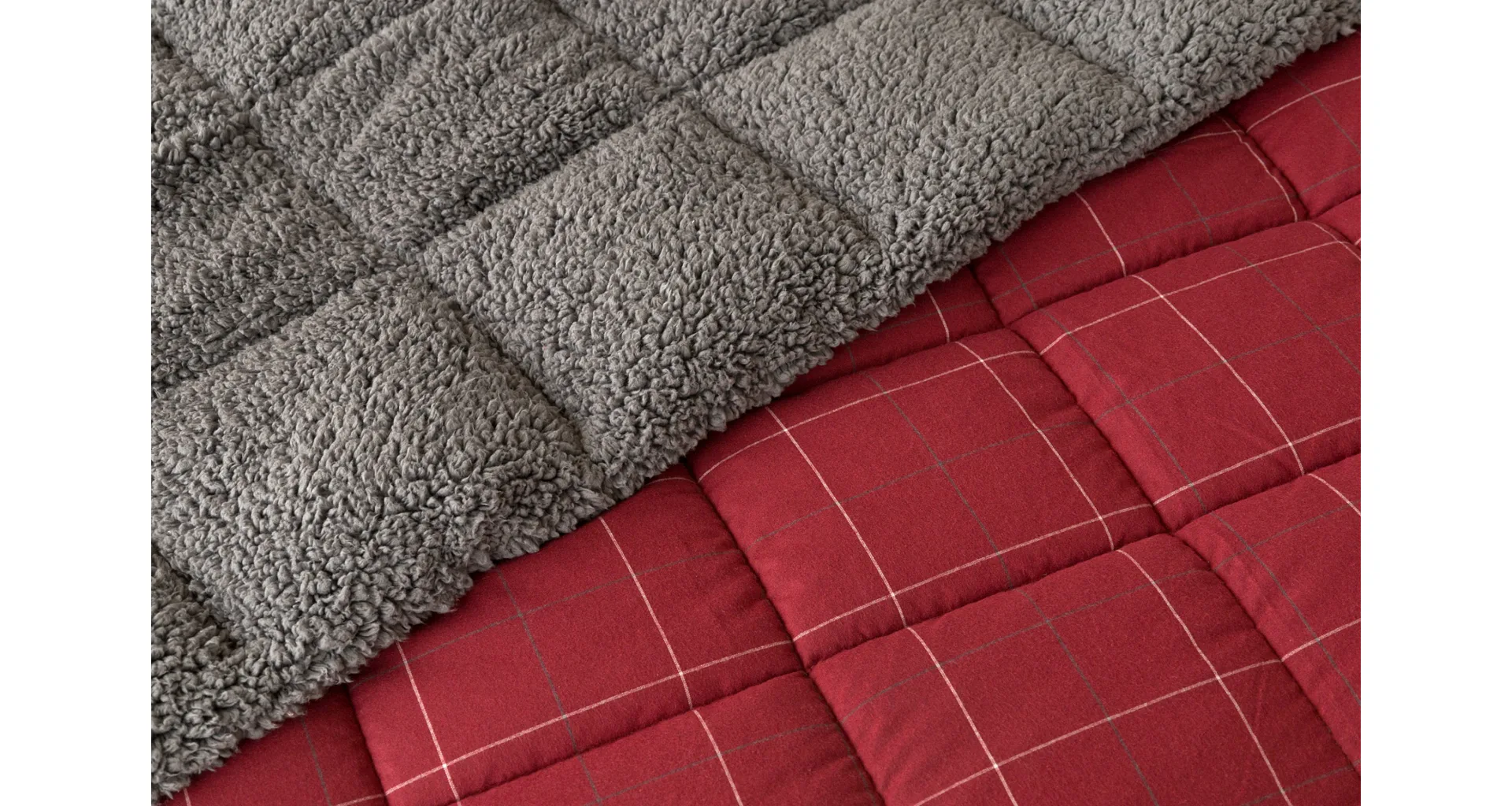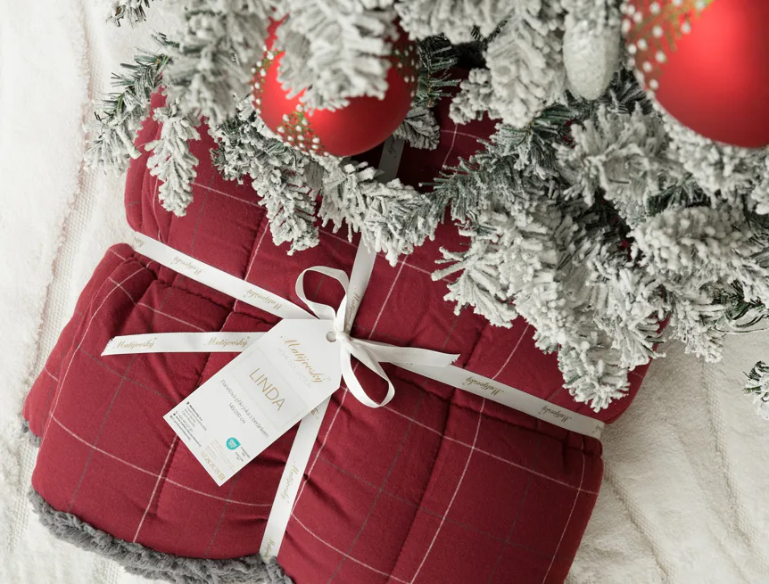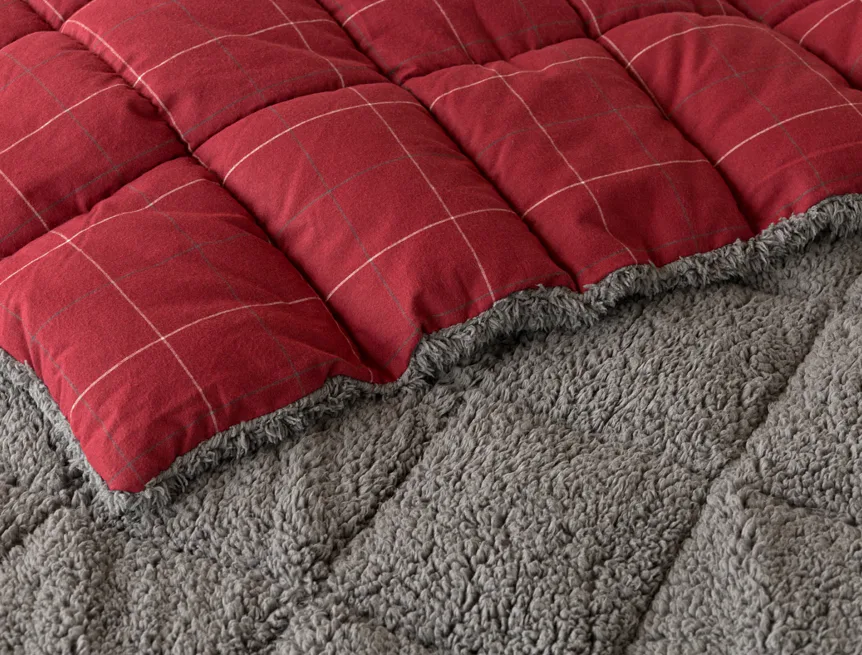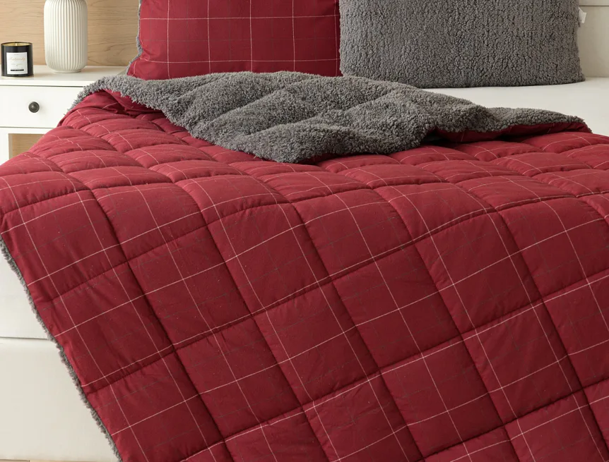 Vzor Linda v sviatočnej červenej farbe s jemným kockovaným motívom dopĺňa tmavo šedý baránok. K prikrývke možno dokúpiť vankúš v rovnakom designe.
