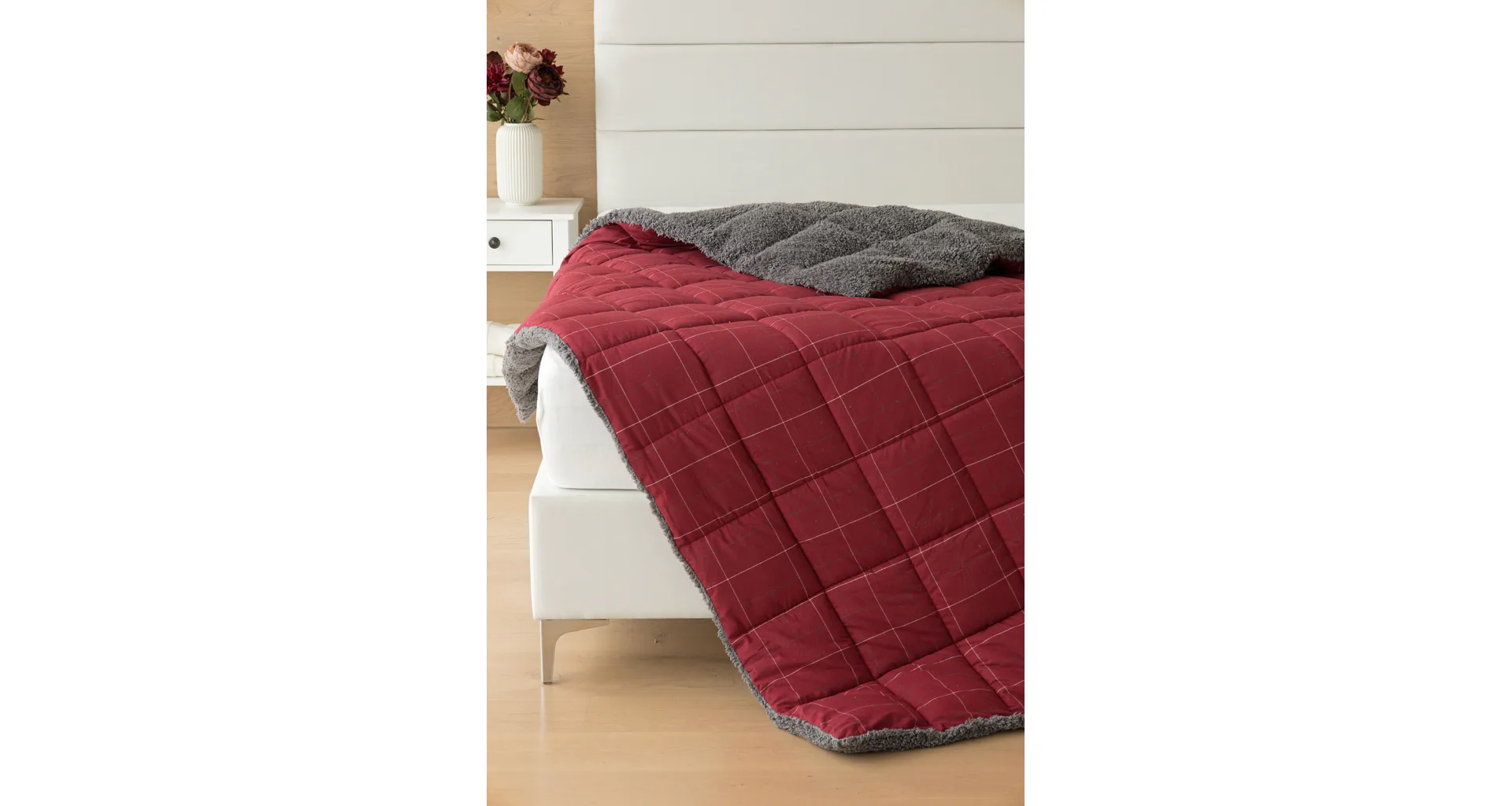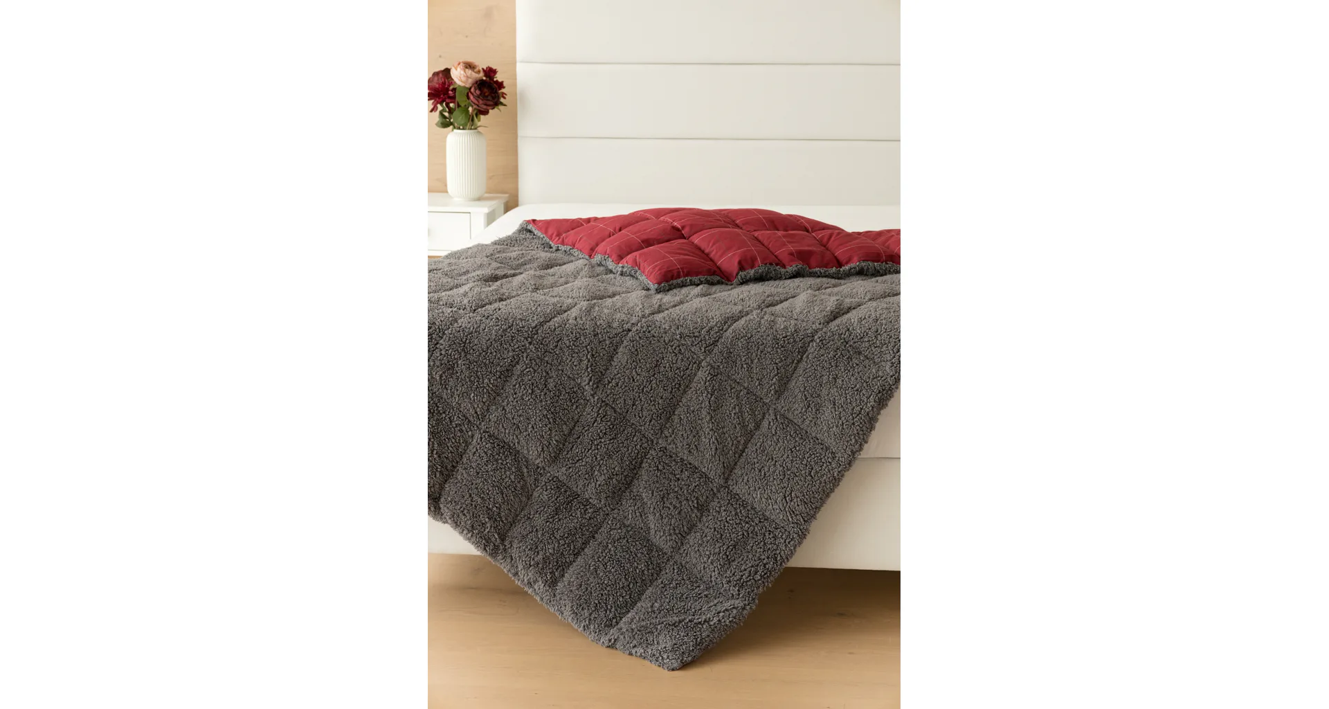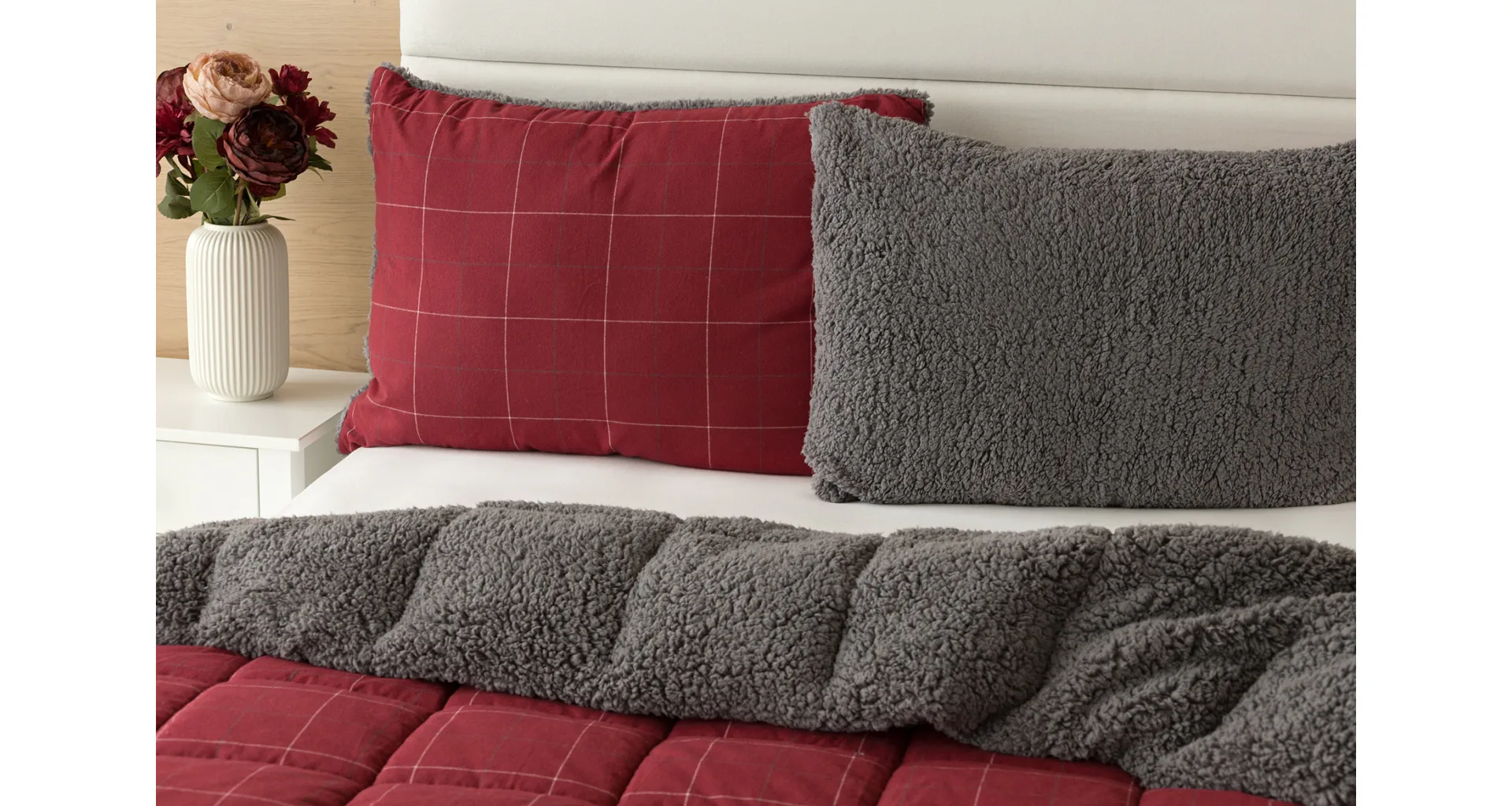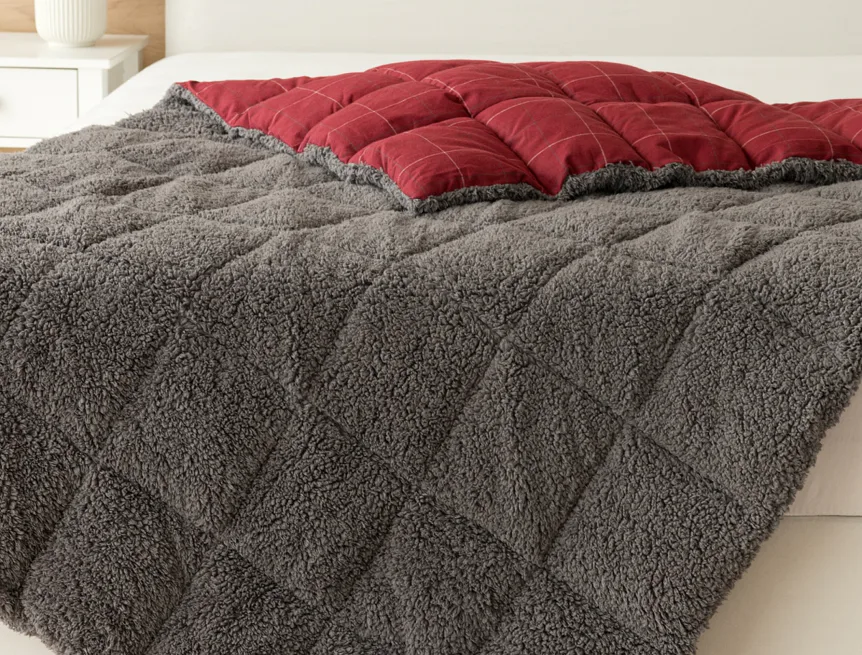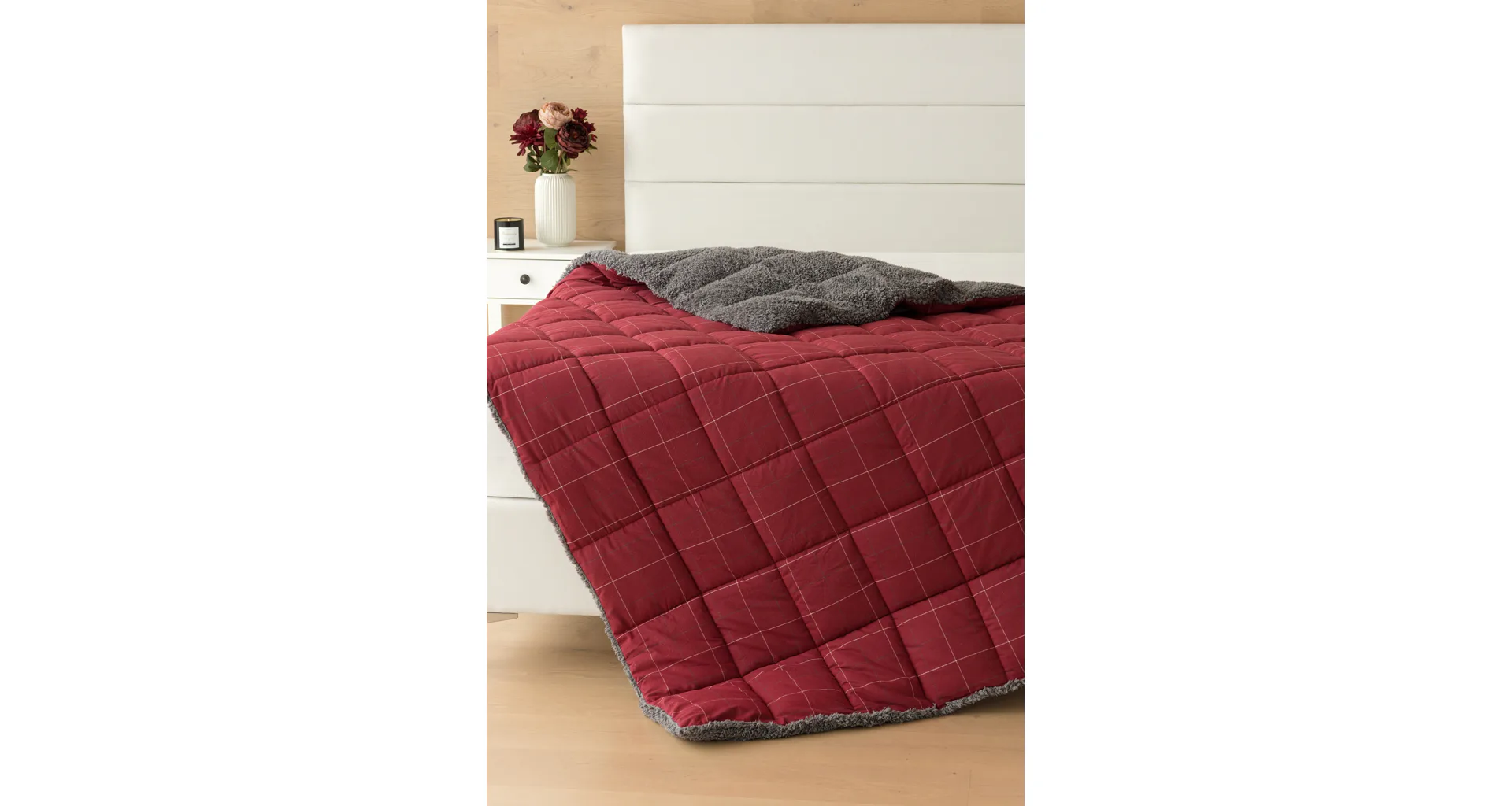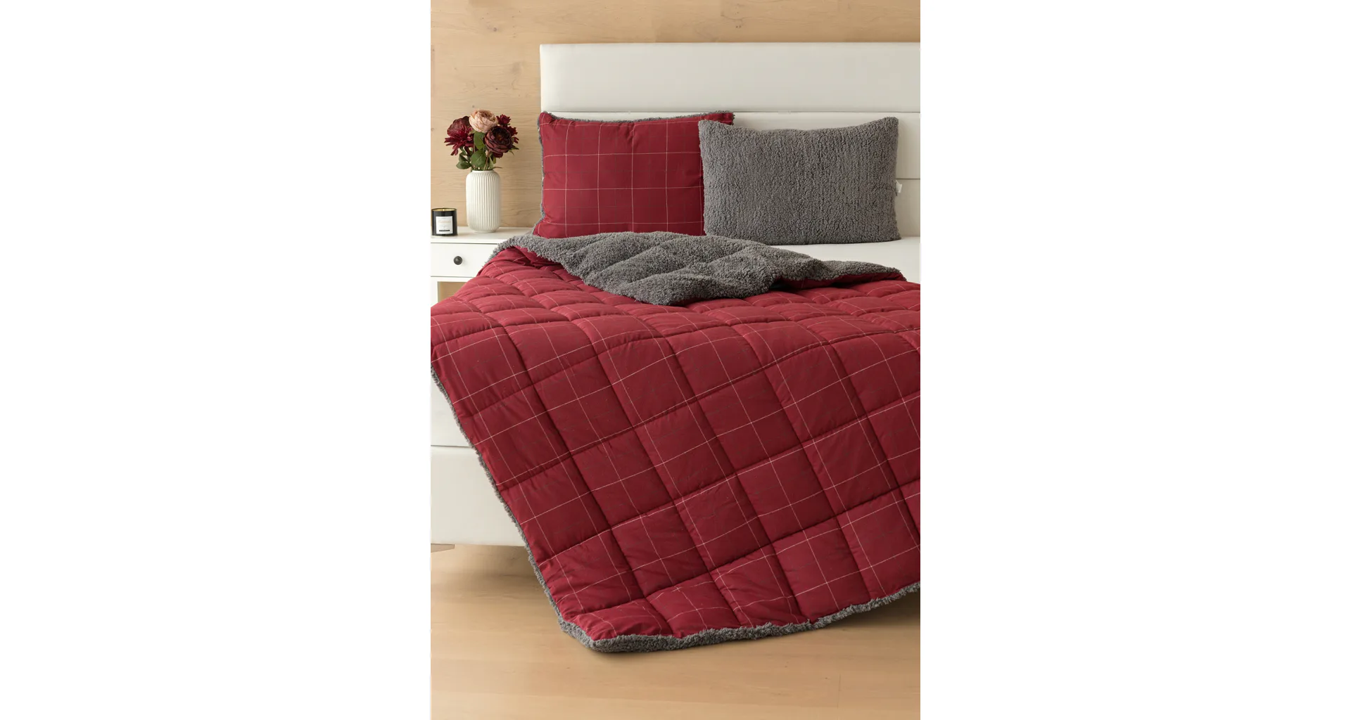 Vzor Linda v sviatočnej červenej farbe s jemným kockovaným motívom dopĺňa tmavo šedý baránok. K prikrývke možno dokúpiť vankúš v rovnakom designe.
