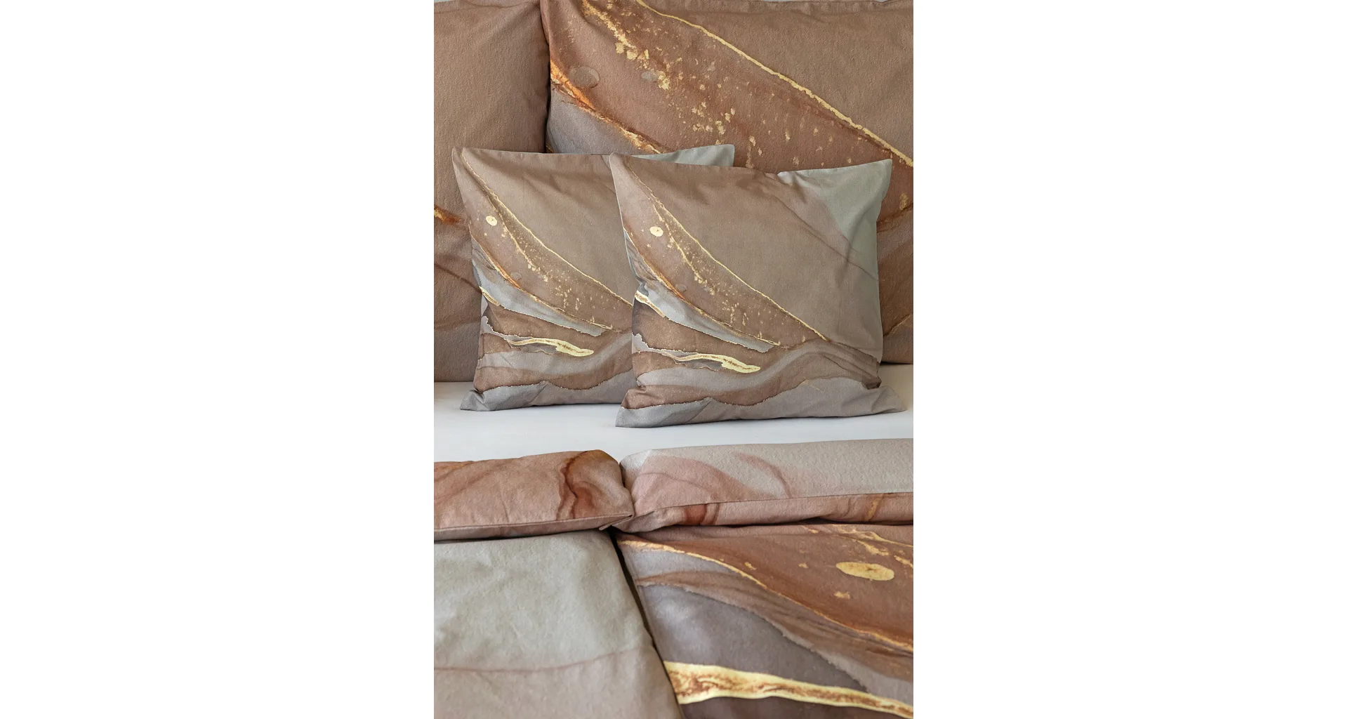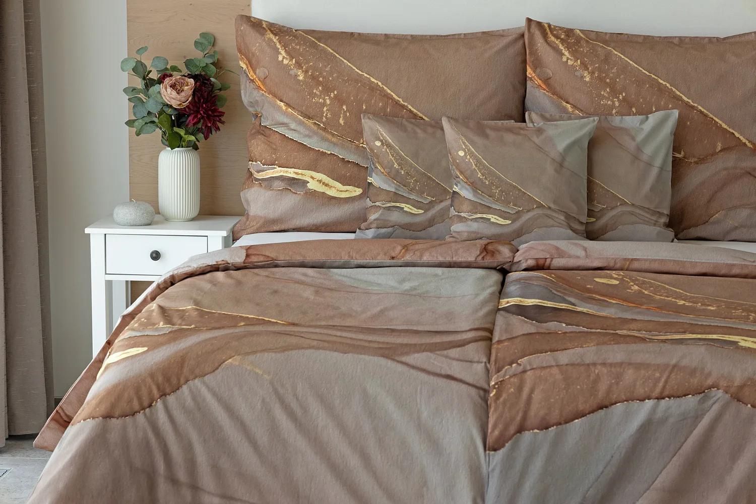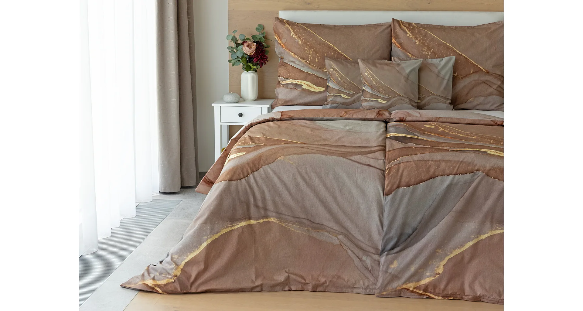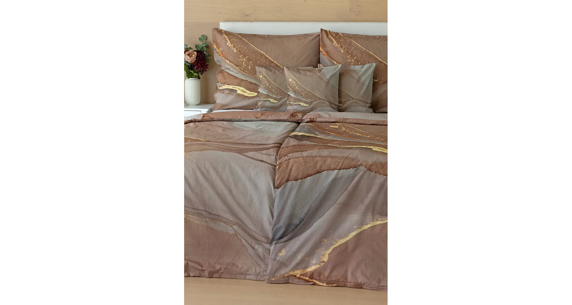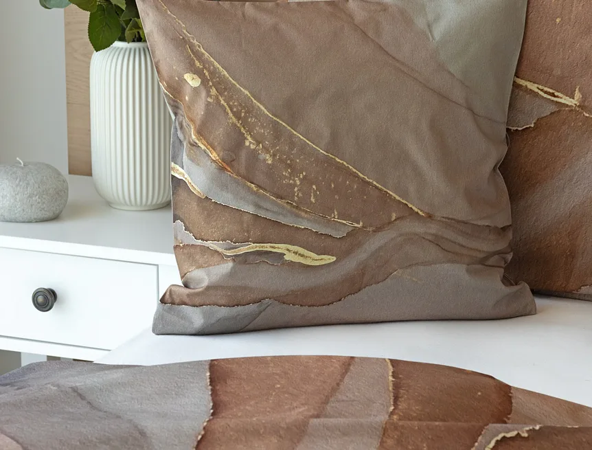 Bavlnené obliečky Riana vnesú do vašej spálne jedinečný štýl a eleganciu. Abstraktný vzor kombinuje paletu hnedých a šedohnedých tónov pretnutých zlatistou linkou. Obliečky sú vyrobené zo 100% prvotriednej bavlny a prinášajú nie len estetickú hodnotu, ale aj výnimočný komfort.